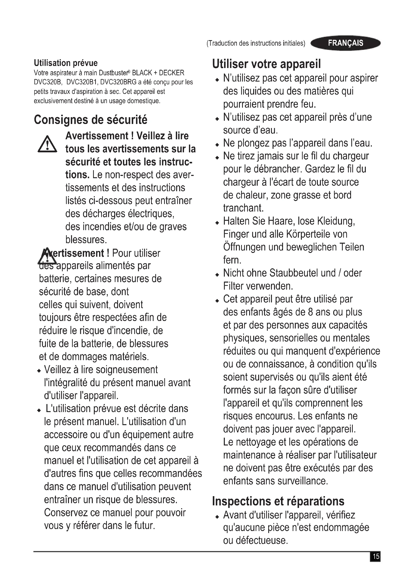 Avertissement ! Veillez à lire tous les avertissements sur la sécurité et toutes les instruc- tions. Le non-respect des aver- tissements et des instructions listés ci-dessous peut entraîner des décharges électriques, des incendies et/ou de graves blessures. Avertissement ! Pour utiliser des appareils alimentés par batterie, certaines mesures de sécurité de base, dont celles qui suivent, doivent toujours être respectées an de réduire le risque d'incendie, de fuite de la batterie, de blessures et de dommages matériels. Veillez à lire soigneusement l'intégralité du présent manuel avant d'utiliser l'appareil. uL'utilisation prévue est décrite dans le présent manuel. L'utilisation d'un accessoire ou d'un équipement autre que ceux recommandés dans ce manuel et l'utilisation de cet appareil à d'autres ns que celles recommandées dans ce manuel d'utilisation peuvent entraîner un risque de blessures. Conservez ce manuel pour pouvoir vous y référer dans le futur. Utiliser votre appareil u N’utilisez pas cet appareil pour aspirer des liquides ou des matières qui pourraient prendre feu. u N’utilisez pas cet appareil près d’une source d’eau. u Ne plongez pas l’appareil dans l’eau.u Ne tirez jamais sur le l du chargeur pour le débrancher. Gardez le l du chargeur à l'écart de toute source de chaleur, zone grasse et bord tranchant. u Halten Sie Haare, lose Kleidung, Finger und alle Körperteile von Öffnungen und beweglichen Teilen fern. u Nicht ohne Staubbeutel und / oder Filter verwenden. u Cet appareil peut être utilisé par des enfants âgés de 8 ans ou plus et par des personnes aux capacités physiques, sensorielles ou mentales réduites ou qui manquent d'expérience ou de connaissance, à condition qu'ils soient supervisés ou qu'ils aient été formés sur la façon sûre d'utiliser l'appareil et qu'ils comprennent les risques encourus. Les enfants ne doivent pas jouer avec l'appareil. Le nettoyage et les opérations de maintenance à réaliser par l'utilisateur ne doivent pas être exécutés par des enfants sans surveillance. Inspections et réparations u Avant d'utiliser l'appareil, vériez qu'aucune pièce n'est endommagée ou défectueuse.16 (Traduction des instructions initiales) FRANÇAIS Contrôlez l'absence de pièces cassées, d'interrupteurs endommagés et de toutes autres anomalies susceptibles de nuire au bon fonctionnement de l’appareil. u N’utilisez pas l’appareil si une quelconque pièce est endommagée ou défectueuse. u Faites réparer ou remplacer les pièces défectueuses ou endommagées par un réparateur agréé. u Vériez régulièrement l’absence de dommage sur le l du chargeur. Si le l est endommagé ou défectueux, remplacez le chargeur. u Ne tentez jamais de retirer ou de remplacer des pièces autres que celles citées dans ce manuel. Consignes de sécurité supplémentaires u Lorsque vous n'utilisez pas l'appareil, rangez-le dans un endroit sec. u Les enfants ne doivent pas avoir accès aux appareils rangés. Risques résiduels. Certains risques résiduels autres que ceux mentionnés dans les avertissements sur la sécurité peuvent survenir en utilisant l'outil. Ces risques peuvent être provoqués par une utilisation incorrecte, prolongée, etc. Malgré le respect de toutes les réglementations sur la sécurité pertinentes et la mise en œuvre de dispositifs de sécurité, certains risques résiduels ne peuvent pas être évités. Ils comprennent : u Les blessures dues au contact avec des pièces en mouvement. u Les blessures dues au contact avec des pièces chaudes. u Les blessures dues au remplacement de pièces ou d'accessoires. u Les blessures dues à l'utilisation prolongée de l'appareil. Lorsque vous utilisez un appareil quel qu'il soit pendant de longues périodes, veillez à faire des pauses régulières. u Les risques pour la santé provoqués par l'inhalation des poussières générées pendant l'utilisation de votre outil (exemple : travail avec du bois, surtout le chêne, le hêtre et les panneaux en MDF). Batteries et chargeurs Batteries u Ne tentez de les ouvrir sous aucun prétexte. u N'exposez pas la batterie à l'eau. u N'exposez pas la batterie à la chaleur. u Ne stockez pas la batterie dans des endroits où la température peut dépasser 40°C. u Ne procédez à la charge qu'à une température ambiante comprise entre 10 °C et 40 °C. u Ne procédez à la charge qu'avec le chargeur fourni avec l’appareil/outil. L'utilisation d'un chargeur inadapté peut entraîner une décharge électrique ou la surchauffe de la batterie.17 (Traduction des instructions initiales) FRANÇAIS u Au moment de jeter les batteries, respectez les instructions mentionnées à la section "Protection de l'environnement". u Ne déformez/n’endommagez pas le bloc-batterie en le perçant ou en le cognant car cela pourrait entraîner des blessures et un incendie. u Ne rechargez pas des batteries endommagées. u Dans des conditions extrêmes, la batterie peut fuir. Si vous détectez une fuite, utilisez un chiffon pour essuyer le liquide avec précaution. Évitez tout contact avec la peau. u En cas de contact avec la peau ou les yeux, respectez les consignes mentionné ci-dessous. Avertissement ! Le liquide de la batterie peut provoquer des blessures ou des dégâts matériels. En cas de contact avec la peau, rincez immédiatement à l'eau. Si des rougeurs, une douleur ou une irritation se produisent, consultez un médecin. En cas de contact avec les yeux, rincez immédiatement à l'eau et consultez un médecin. Chargeurs Votre chargeur a été conçu pour une tension spécique. Vériez toujours que la tension du réseau électrique correspond à celle de la plaque signalétique et des informations du tableau de données techniques. Avertissement ! Ne tentez jamais de remplacer le chargeur par une prise de courant ordinaire. u N'utilisez votre chargeur BLACK+DECKER que pour recharger la batterie de l'appareil/ outil avec 