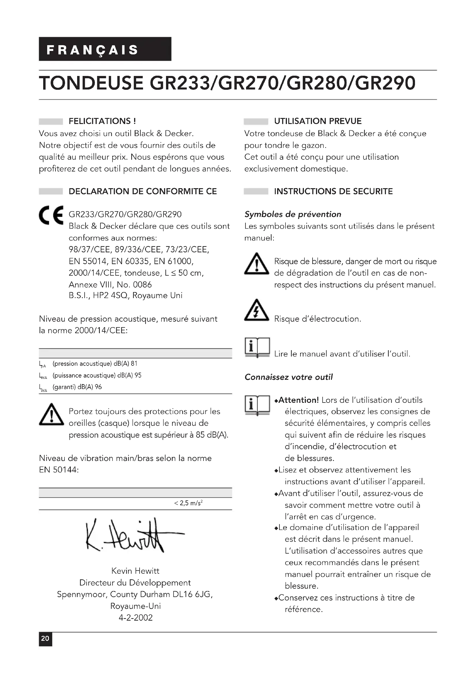 Kevin Hewitt Directeur du Développement Spennymoor, County Durham DL16 6JG, Royaume-Uni 4-2-2002 UTILISATION PREVUE Votre tondeuse de Black & Decker a été conçue pour tondre le gazon. Cet outil a été conçu pour une utilisation exclusivement domestique.