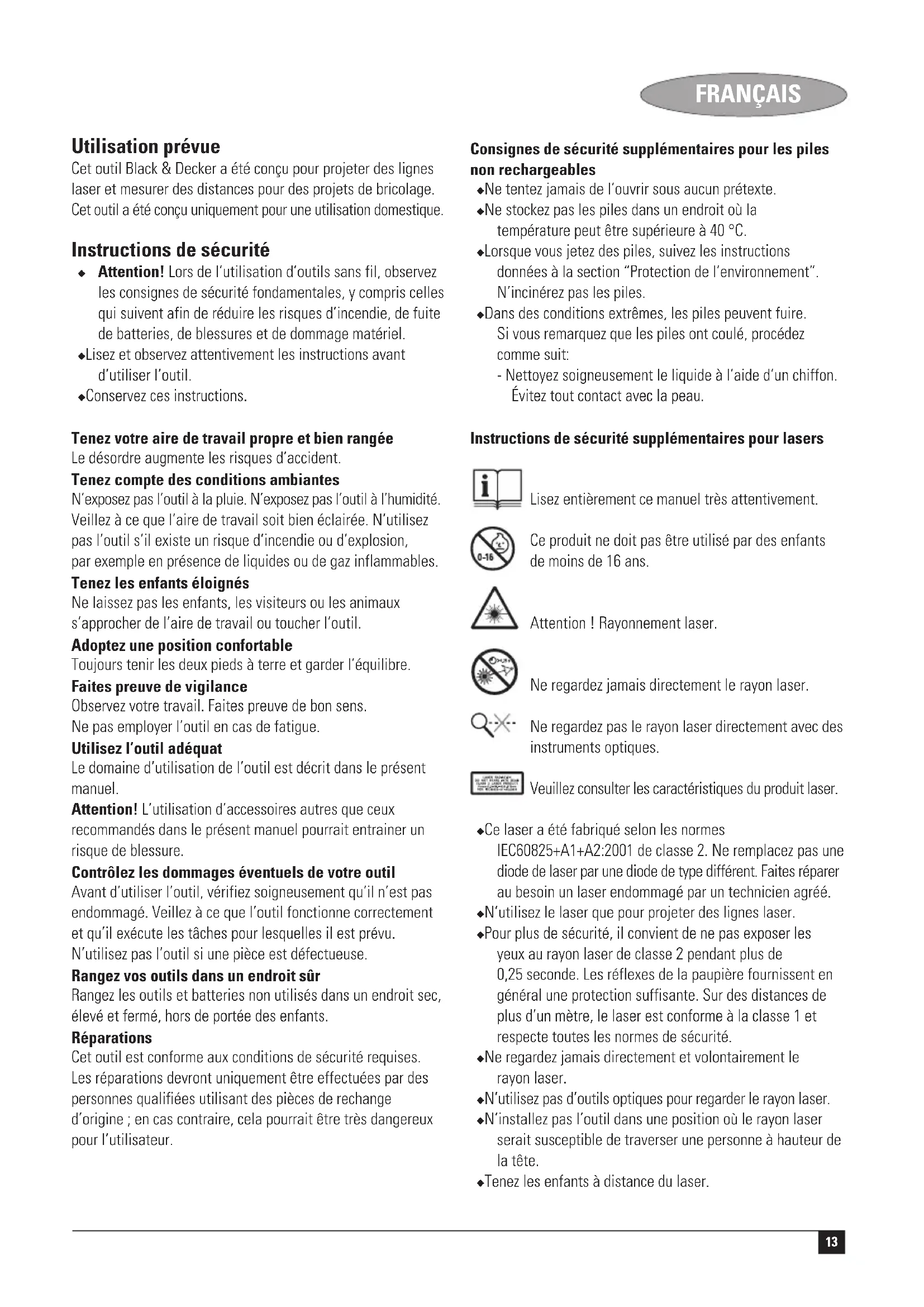 Kevin Hewitt Director of Consumer Engineering Spennymoor, County Durham DL16 6JG, United Kingdom 1-2-2006 Garantie Black & Decker vertraut auf die Qualität der eigenen Geräte und bietet dem Käufer eine außergewöhnliche Garantie. Diese Garantiezusage versteht sich unbeschadet der gesetzlichen Gewährleistungsansprüche und schränkt diese keinesfalls ein. Sie gilt in sämtlichen Mitgliedsstaaten der Europäischen Union und der Europäischen Freihandelszone EFTA. Tritt innerhalb von 24 Monaten ab Kaufdatum an einem Gerät von Black & Decker ein auf Material- oder Verarbeitungsfehler zurückzuführender Mangel auf, garantiert Black & Decker den Austausch defekter Teile, die Reparatur von Geräten mit üblichem Verschleiß bzw. den Austausch eines mangelhaften Geräts, ohne den Kunden dabei mehr als unbedingt nötig in Anspruch zu nehmen, allerdings vorbehaltlich folgender Ausnahmen: ◆ wenn das Gerät gewerblich, beruflich oder im Verleihgeschäft benutzt wurde; ◆ wenn das Gerät mißbräuchlich verwendet oder mit mangelnder Sorgfalt behandelt wurde; ◆ wenn das Gerät durch irgendwelche Fremdeinwirkung beschädigt wurde; ◆ wenn ein unbefugter Reparaturversuch durch anderes Personal als das einer Vertragswerkstatt oder des Black & Decker-Kundendienstes unternommen wurde.12 DEUTSCH Zur Inanspruchnahme dieser Garantie ist dem Verkäufer bzw. der Vertragswerkstatt ein Kaufnachweis vorzulegen. Der Kaufnachweis muß Kaufdatum und Gerätetyp bescheinigen. Die Adresse des zuständigen Büros von Black & Decker steht in dieser Anleitung, darüber läßt sich die nächstgelegene Vertragswerkstatt ermitteln. Außerdem ist eine Liste der Vertragswerkstätten und aller Kundendienststellen von Black & Decker sowie der zuständigen Ansprechpartner im Internet zu finden unter: www.2helpU.com Bitte besuchen Sie untere Webseite www.blackanddecker.de, um Ihr neues Black & Decker Produkt zu registrieren und über neue Produkte und Sonderangebote aktuell informiert zu werden. Weitere Informationen über die Marke Black & Decker und unsere Produkte finden Sie unter www.blackanddecker.de13 FRANÇAIS Utilisation prévue Cet outil Black & Decker a été conçu pour projeter des lignes laser et mesurer des distances pour des projets de bricolage. Cet outil a été conçu uniquement pour une utilisation domestique. Instructions de sécurité ◆ Attention! Lors de l’utilisation d’outils sans fil, observez les consignes de sécurité fondamentales, y compris celles qui suivent afin de réduire les risques d’incendie, de fuite de batteries, de blessures et de dommage matériel. ◆ Lisez et observez attentivement les instructions avant d’utiliser l’outil. ◆ Conservez ces instructions. Tenez votre aire de travail propre et bien rangée Le désordre augmente les risques d’accident. Tenez compte des conditions ambiantes N’exposez pas l’outil à la pluie. N’exposez pas l’outil à l’humidité. Veillez à ce que l’aire de travail soit bien éclairée. N’utilisez pas l’outil s’il existe un risque d’incendie ou d’explosion, par exemple en présence de liquides ou de gaz inflammables. Tenez les enfants éloignés Ne laissez pas les enfants, les visiteurs ou les animaux s’approcher de l’aire de travail ou toucher l’outil. Adoptez une position confortable Toujours tenir les deux pieds à terre et garder l’équilibre. Faites preuve de vigilance Observez votre travail. Faites preuve de bon sens. Ne pas employer l’outil en cas de fatigue. Utilisez l’outil adéquat Le domaine d’utilisation de l’outil est décrit dans le présent manuel. Attention! L’utilisation d’accessoires autres que ceux recommandés dans le présent manuel pourrait entrainer un risque de blessure. Contrôlez les dommages éventuels de votre outil Avant d’utiliser l’outil, vérifiez soigneusement qu’il n’est pas endommagé. Veillez à ce que l’outil fonctionne correctement et qu’il exécute les tâches pour lesquelles il est prévu. N’utilisez pas l’outil si une pièce est défectueuse. Rangez vos outils dans un endroit sûr Rangez les outils et batteries non utilisés dans un endroit sec, élevé et fermé, hors de portée des enfants. Réparations Cet outil est conforme aux conditions de sécurité requises. Les réparations devront uniquement être effectuées par des personnes qualifiées utilisant des pièces de rechange d’origine ; en cas contraire, cela pourrait être très dangereux pour l’utilisateur. Consignes de sécurité supplémentaires pour les piles non rechargeables ◆ Ne tentez jamais de l’ouvrir sous aucun prétexte. ◆ Ne stockez pas les piles dans un endroit où la température peut être supérieure à 40 °C. ◆ Lorsque vous jetez des piles, suivez les instructions données à la section “Protection de l’environnement”. N’incinérez pas les piles. ◆ Dans des conditions extrêmes, les piles peuvent fuire. Si vous remarquez que les piles ont coulé, procédez comme suit: - Nettoyez soigneusement le liquide à l’aide d’un chiffon. Évitez tout contact avec la peau. Instructions de sécurité supplémentaires pour lasers Lisez entièrement ce manuel très attentivement. Ce produit ne doit pas être utilisé par des enfants de moins de 16 ans. Attention ! Rayonnement laser. Ne regardez jamais directement le rayon laser. Ne regardez pas le rayon laser directement avec des instruments optiques. Veuillez consulter les caractéristiques du produit laser. ◆ Ce laser a été fabriqué selon les normes IEC60825+A1+A2:2001 de classe 2. Ne remplacez pas une diode de laser par une diode de type différent. Faites réparer au besoin un laser endommagé par un technicien agréé. ◆ N’utilisez le laser que pour projeter des lignes laser. ◆ Pour plus de sécurité, il convient de ne pas exposer les yeux au rayon laser de classe 2 pendant plus de 0,25 seconde. Les réflexes de la paupière fournissent en général une protection suffisante. Sur des