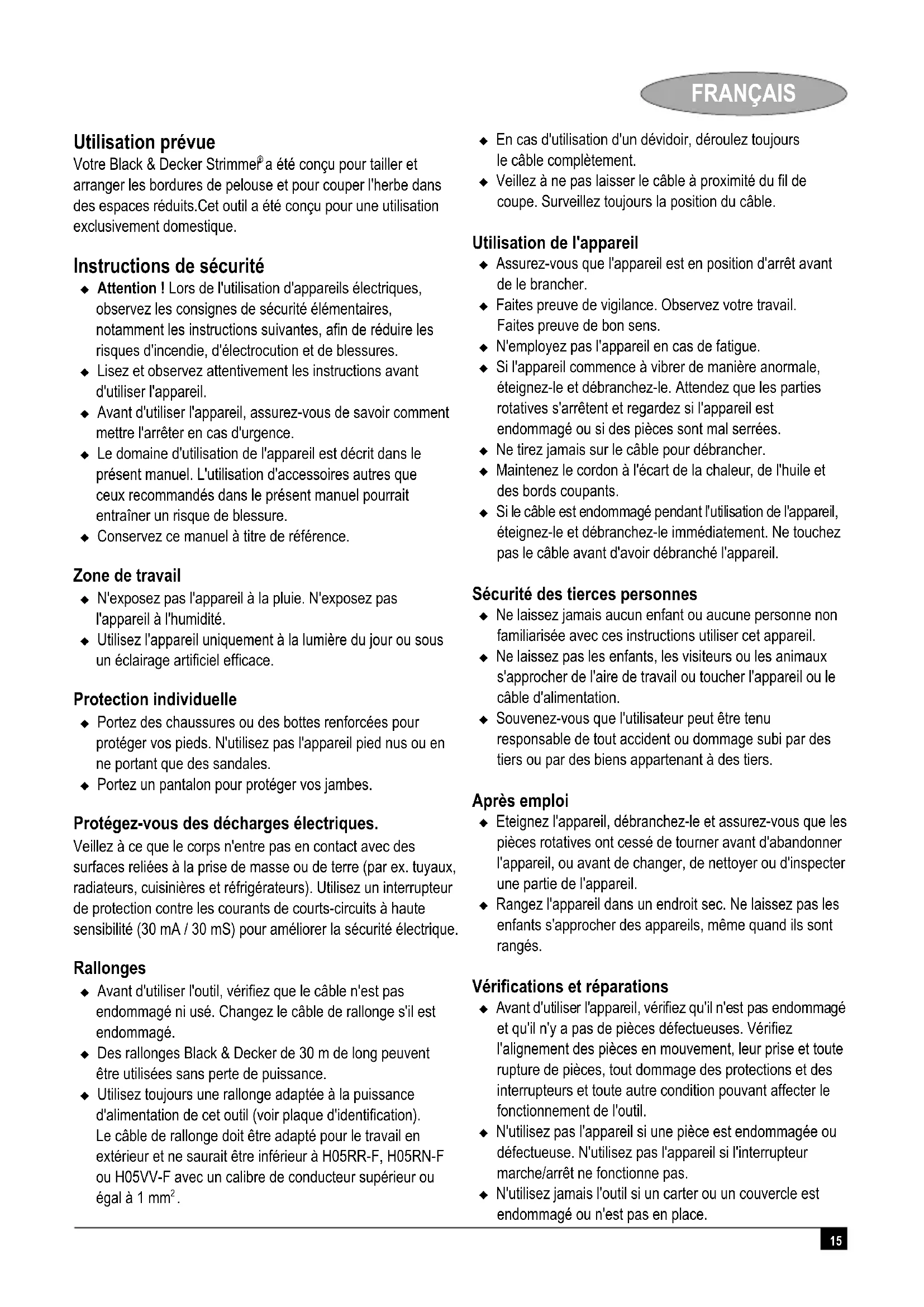 a été conçu pour tailler et arranger les bordures de pelouse et pour couper l'herbe dans des espaces réduits.Cet outil a été conçu pour une utilisation exclusivement domestique. Instructions de sécurité Attention ! Lors de l'utilisation d'appareils électriques, observez les consignes de sécurité élémentaires, notamment les instructions suivantes, afin de réduire les risques d'incendie, d'électrocution et de blessures. Lisez et observez attentivement les instructions avant d'utiliser l'appareil. Avant d'utiliser l'appareil, assurez-vous de savoir comment mettre l'arrêter en cas d'urgence. Le domaine d'utilisation de l'appareil est décrit dans le présent manuel. L'utilisation d'accessoires autres que ceux recommandés dans le présent manuel pourrait entraîner un risque de blessure. Conservez ce manuel à titre de référence. Zone de travail N'exposez pas l'appareil à la pluie. N'exposez pas l'appareil à l'humidité. Utilisez l'appareil uniquement à la lumière du jour ou sous un éclairage artificiel efficace. Protection individuelle Portez des chaussures ou des bottes renforcées pour protéger vos pieds. N'utilisez pas l'appareil pied nus ou en ne portant que des sandales. Portez un pantalon pour protéger vos jambes. Protégez-vous des décharges électriques. Veillez à ce que le corps n'entre pas en contact avec des surfaces reliées à la prise de masse ou de terre (par ex. tuyaux, radiateurs, cuisinières et réfrigérateurs). Utilisez un interrupteur de protection contre les courants de courts-circuits à haute sensibilité (30 mA / 30 mS) pour améliorer la sécurité électrique. Rallonges Avant d'utiliser l'outil, vérifiez que le câble n'est pas endommagé ni usé. Changez le câble de rallonge s'il est endommagé. Des rallonges Black & Decker de 30 m de long peuvent être utilisées sans perte de puissance. Utilisez toujours une rallonge adaptée à la puissance d'alimentation de cet outil (voir plaque d'identification). Le câble de rallonge doit être adapté pour le travail en extérieur et ne saurait être inférieur à H05RR-F, H05RN-F ou H05VV-F avec un calibre de conducteur supérieur ou égal à 1 mm