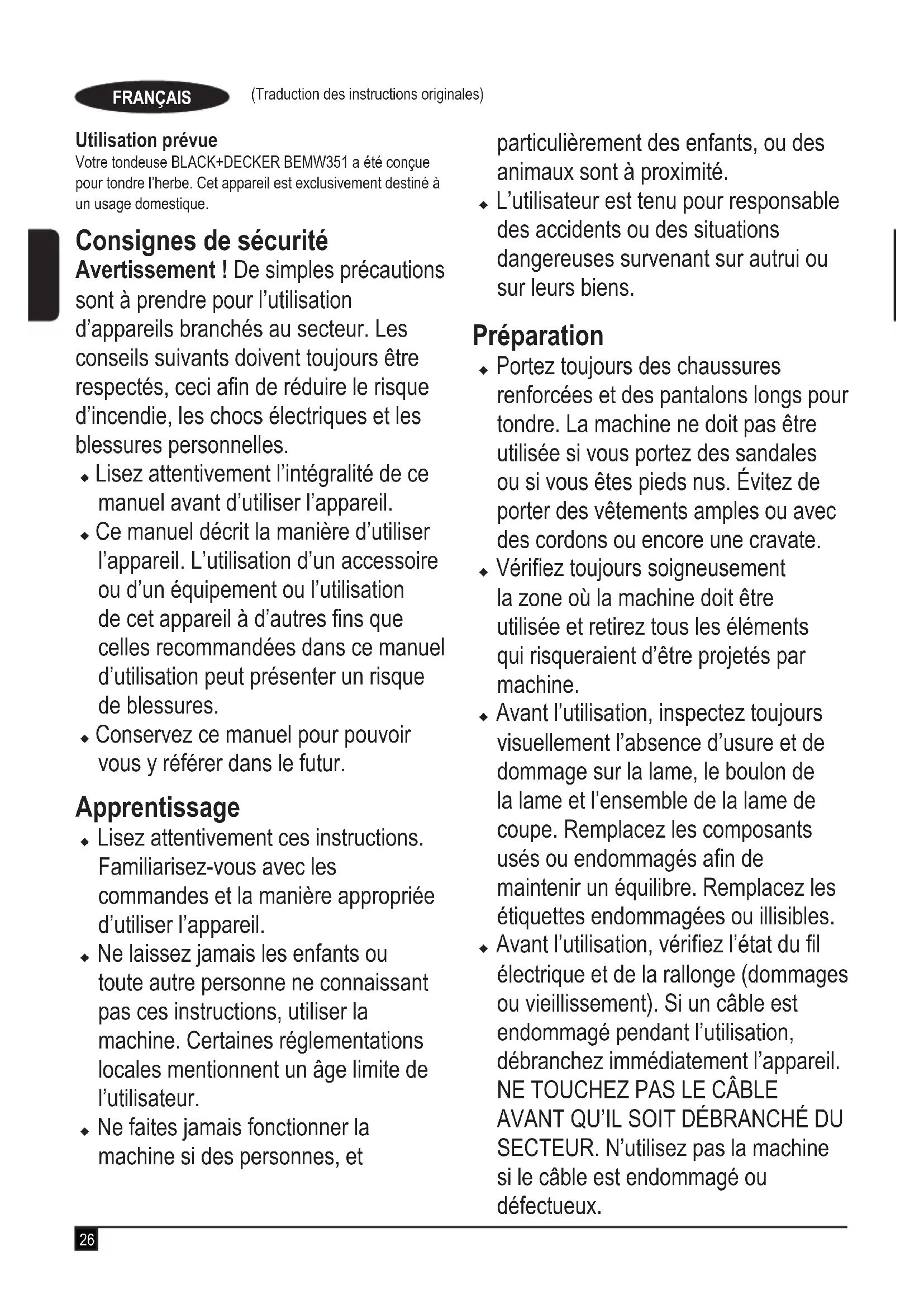 AVANT QU’IL SOIT DÉBRANCHÉ DU SECTEUR. N’utilisez pas la machine si le câble est endommagé ou défectueux.27 (Traduction des instructions originales) FRANÇAIS u Portez des lunettes de sécurité lorsque vous utilisez cet outil. Utilisez un masque anti-poussière si l’environnement est poussiéreux. Portez des protections auditives si le niveau sonore semble trop élevé. u Protégez-vous contre les chocs électriques. Évitez de toucher des surfaces reliées à la terre (par exemple, les grillages métalliques, les lampadaires, etc.). Fonctionnement u N’utilisez jamais l’appareil avec des protections défectueuses ou sans dispositif de protection, comme les déecteurs et/ou le sac de ramassage. u N’utilisez cet appareil que de jour ou avec un éclairage articiel approprié. u N’utilisez pas l’appareil sous la pluie. Ne l’exposez pas à l’humidité. Il est préférable de ne pas l’utiliser si le gazon est humide. u Faites attention à votre position, surtout dans les pentes. N’oubliez pas que l’herbe fraîchement coupée est glissante. Ne travaillez pas sur des pentes trop raides. u Ne travaillez jamais de haut en bas. Prenez toutes les précautions nécessaires quand vous changez de direction dans la pente. u Ne tondez pas sur des pentes trop raides. u Ne jamais courir en poussant l’outil, marchez. Ne tirez pas l’appareil vers vous. Ne marchez pas à reculons en utilisant l’outil. u Mettez l’outil en marche en suivant les instructions et en éloignant vos pieds de la lame. u Ne restez pas debout devant l’ouverture de refoulement. u N’inclinez pas l’outil en le mettant en marche, sauf s’il doit être incliné pour le démarrage. Dans ce cas, ne l’inclinez pas plus que nécessaire et ne levez que la partie éloignée de l’utilisateur. Vos mains doivent être en position pour le fonctionnement avant de reposer l’outil au sol. u Éteignez l’outil. Si l’outil a été incliné pour traverser une surface autre que de la pelouse et pendant le transport vers et depuis la zone à tondre, attendez que la lame s’arrête. u Ne levez pas ou ne portez pas l’outil avant l’arrêt complet de la lame. u Éloignez vos mains et vos pieds de la lame. u Ne posez pas vos mains ou vos pieds à côté ou sous les pièces en mouvement. u Gardez-les en permanence éloignés des ouvertures d’évacuation. u Vous devez arrêter l’appareil, débrancher la prise et vérier que les parties en mouvement ne sont plus en rotation avant de laisser l’outil sans surveillance et de changer, nettoyer ou vérier des pièces de l’appareil ou encore de le débloquer. Après avoir heurté un corps étranger. Vériez l’état de la machine et effectuez les28 (Traduction des instructions originales) FRANÇAIS réparations avant de redémarrer et d’utiliser la machine ; u Si l’appareil commence à vibrer de manière anormale ou si vous touchez un corps étranger, éteignez-le et débranchez la prise. Vériez l’état de la machine, remplacez ou réparez les pièces endommagées, vériez et serrez les pièces desserrées. u Prenez les précautions nécessaires pour que le câble de secteur soit éloigné de la lame. Vériez toujours la position du câble. u Le moteur continue de tourner pendant quelques secondes après avoir éteint l’outil. N’arrêtez jamais la lame de force. Entretien et rangement u Avant d’utiliser l’appareil, vériez qu’aucune de ses pièces n’est endommagée ou défectueuse. Vériez que les pièces mobiles sont bien alignées et xées, qu’elles ne sont pas cassées, que les dispositifs de protection et les interrupteurs ne sont pas endommagés et l’absence de toute autre condition qui pourrait nuire au bon fonctionnement de l’appareil. Assurez-vous du bon fonctionnement de l’appareil, comme prévu. N’utilisez jamais l’appareil si l’un des dispositifs de protection ou l’un des capots est endommagé ou manquant. N’utilisez pas l’appareil si l’une de ses pièces est endommagée ou défectueuse. N’utilisez pas l’appareil si son interrupteur ne permet plus de le mettre en marche et de l’éteindre. Faites réparer ou remplacer les pièces défectueuses ou endommagées par un réparateur agréé. u Vériez régulièrement l’état du câble. Si le câble est endommagé, il doit être remplacé par un réparateur agréé an d’éviter tout risque. Vériez régulièrement les rallonges. Remplacez immédiatement la rallonge si elle est en mauvais état. u Les écrous, boulons et vis doivent être correctement vissés pour travailler en toute sécurité. u Vériez l’absence d’usure ou de dommage sur le bac de récupération d’herbe et changez-le si nécessaire. N’utilisez jamais l’appareil sans le bac de récupération d’herbe. u Prenez les précautions nécessaires pendant le réglage de la machine pour ne pas coincer vos doigts entre les lames en mouvement et les pièces xes de la machine. u Pendant l’entretien des lames, n’oubliez pas que même si l’alimentation est coupée, les lames peuvent encore bouger. u Quand il n’est pas utilisé, l’appareil doit être rangé dans un endroit sec. Rangez vos appareils hors de portée des enfants. u Laissez la machine refroidir avant de la ranger. u Les organes de coupe utilisés doivent être appropriés.29 (Traduction des instructions originales) FRANÇAIS u N’utilisez que des pièces détachées et des accessoires recommandés par BLACK+DECKER. Consignes de sécurité supplémentaires pour l’utilisation des tondeuses u Utilisez toujours une rallonge homologuée et adaptée à la puissance de cet outil (voir les caractéristiques techniques). La rallonge doit être homologuée pour une utilisation en extérieur et marquée en conséquence. Une rallonge HO5VV-F de 1,5 mm² allant jusqu’à 30 m peut être utilisée sans que les performances de l’appareil ne soient limitées. Avant utilisation, vériez la rallonge et assurez-vous qu’elle