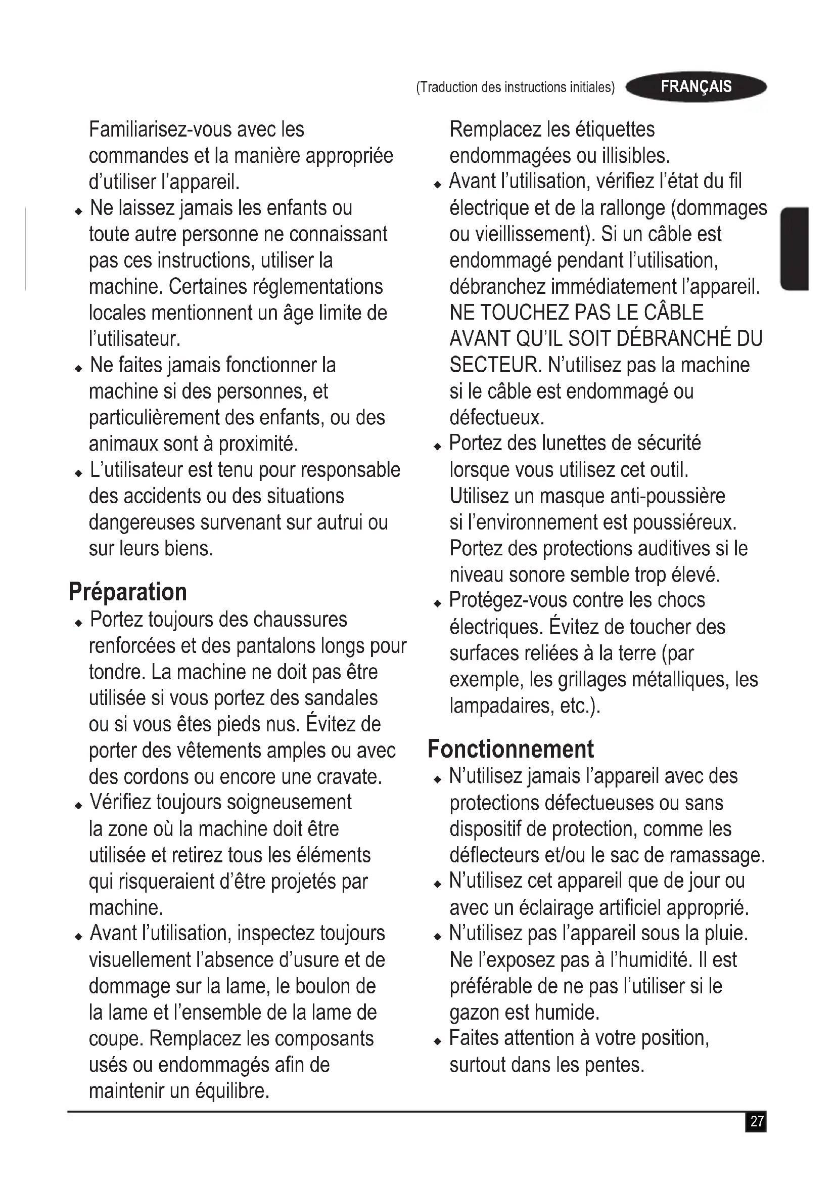 AVANT QU’IL SOIT DÉBRANCHÉ DU SECTEUR. N’utilisez pas la machine si le câble est endommagé ou défectueux. u Portez des lunettes de sécurité lorsque vous utilisez cet outil. Utilisez un masque anti-poussière si l’environnement est poussiéreux. Portez des protections auditives si le niveau sonore semble trop élevé. u Protégez-vous contre les chocs électriques. Évitez de toucher des surfaces reliées à la terre (par exemple, les grillages métalliques, les lampadaires, etc.). Fonctionnement u N’utilisez jamais l’appareil avec des protections défectueuses ou sans dispositif de protection, comme les déecteurs et/ou le sac de ramassage. u N’utilisez cet appareil que de jour ou avec un éclairage articiel approprié. u N’utilisez pas l’appareil sous la pluie. Ne l’exposez pas à l’humidité. Il est préférable de ne pas l’utiliser si le gazon est humide. u Faites attention à votre position, surtout dans les pentes.28 (Traduction des instructions initiales) FRANÇAIS N’oubliez pas que l’herbe fraîchement coupée est glissante. Ne travaillez pas sur des pentes trop raides. u Ne travaillez jamais de haut en bas. Prenez toutes les précautions nécessaires quand vous changez de direction dans la pente. u Ne tondez pas sur des pentes trop raides. u Ne jamais courir en poussant l’outil, marchez. Ne tirez pas l’appareil vers vous. Ne marchez pas à reculons en utilisant l’outil. u Mettez l’outil en marche en suivant les instructions et en éloignant vos pieds de la lame. u Ne restez pas debout devant l’ouverture de refoulement. u N’inclinez pas l’outil en le mettant en marche, sauf s’il doit être incliné pour le démarrage. Dans ce cas, ne l’inclinez pas plus que nécessaire et ne levez que la partie éloignée de l’utilisateur. Vos mains doivent être en position pour le fonctionnement avant de reposer l’outil au sol. u Éteignez l’outil. Si l’outil a été incliné pour traverser une surface autre que de la pelouse et pendant le transport vers et depuis la zone à tondre, attendez que la lame s’arrête. u Ne levez pas ou ne portez pas l’outil avant l’arrêt complet de la lame. u Éloignez vos mains et vos pieds de la lame. u Ne posez pas vos mains ou vos pieds à côté ou sous les pièces en mouvement. u Gardez-les en permanence éloignés des ouvertures d’évacuation. u Vous devez arrêter l’appareil, débrancher la prise et vérier que les parties en mouvement ne sont plus en rotation avant de laisser l’outil sans surveillance et de changer, nettoyer ou vérier des pièces de l’appareil ou encore de le débloquer. Après avoir heurté un corps étranger. Vériez l’état de la machine et effectuez les réparations avant de redémarrer et d’utiliser la machine ; u Si l’appareil commence à vibrer de manière anormale ou si vous touchez un corps étranger, éteignez-le et débranchez la prise. Vériez l’état de la machine, remplacez ou réparez les pièces endommagées, vériez et serrez les pièces desserrées. u Prenez les précautions nécessaires pour que le câble de secteur soit éloigné de la lame. Vériez toujours la position du câble. u Le moteur continue de tourner pendant quelques secondes après avoir éteint l’outil. N’arrêtez jamais la lame de force. Entretien et rangement u Avant d’utiliser l’appareil, vériez qu’aucune de ses pièces n’est endommagée ou défectueuse. Vériez que les pièces mobiles sont bien alignées et xées, qu’elles ne sont pas cassées, que les dispositifs de protection et les interrupteurs ne sont pas endommagés et l’absence de29 (Traduction des instructions initiales) FRANÇAIS toute autre condition qui pourrait nuire au bon fonctionnement de l’appareil. Assurez-vous du bon fonctionnement de l’appareil, comme prévu. N’utilisez jamais l’appareil si l’un des dispositifs de protection ou l’un des capots est endommagé ou manquant. N’utilisez pas l’appareil si l’une de ses pièces est endommagée ou défectueuse. N’utilisez pas l’appareil si son interrupteur ne permet plus de le mettre en marche et de l’éteindre. Faites réparer ou remplacer les pièces défectueuses ou endommagées par un réparateur agréé. u Vériez régulièrement l’état du câble. Si le câble est endommagé, il doit être remplacé par un réparateur agréé an d’éviter tout risque. Vériez régulièrement les rallonges. Remplacez immédiatement la rallonge si elle est en mauvais état. u Les écrous, boulons et vis doivent être correctement vissés pour travailler en toute sécurité. u Vériez l’absence d’usure ou de dommage sur le bac de récupération d’herbe et changez-le si nécessaire. N’utilisez jamais l’appareil sans le bac de récupération d’herbe. u Prenez les précautions nécessaires pendant le réglage de la machine pour ne pas coincer vos doigts entre les lames en mouvement et les pièces xes de la machine. u Pendant l’entretien des lames, n’oubliez pas que même si l’alimentation est coupée, les lames peuvent encore bouger. u Quand il n’est pas utilisé, l’appareil doit être rangé dans un endroit sec. Rangez vos appareils hors de portée des enfants. u Laissez la machine refroidir avant de la ranger. u Les organes de coupe utilisés doivent être appropriés. u N’utilisez que des pièces détachées et des accessoires recommandés par BLACK+DECKER. Consignes de sécurité supplémentaires pour l’utilisation des tondeuses u Utilisez toujours une rallonge homologuée et adaptée à la puissance de cet outil (voir les caractéristiques techniques). La rallonge doit être homologuée pour une utilisation en extérieur et marquée en conséquence. Une rallonge HO5VV-F de 1,5 mm² allant jusqu’à 30 m peut être utilisée sans que les performances de l’appareil ne soient limitées. Avant utilisation, vériez la rallonge et assurez-vous qu’elle est ne présente aucun signe d’endommagement, d’us