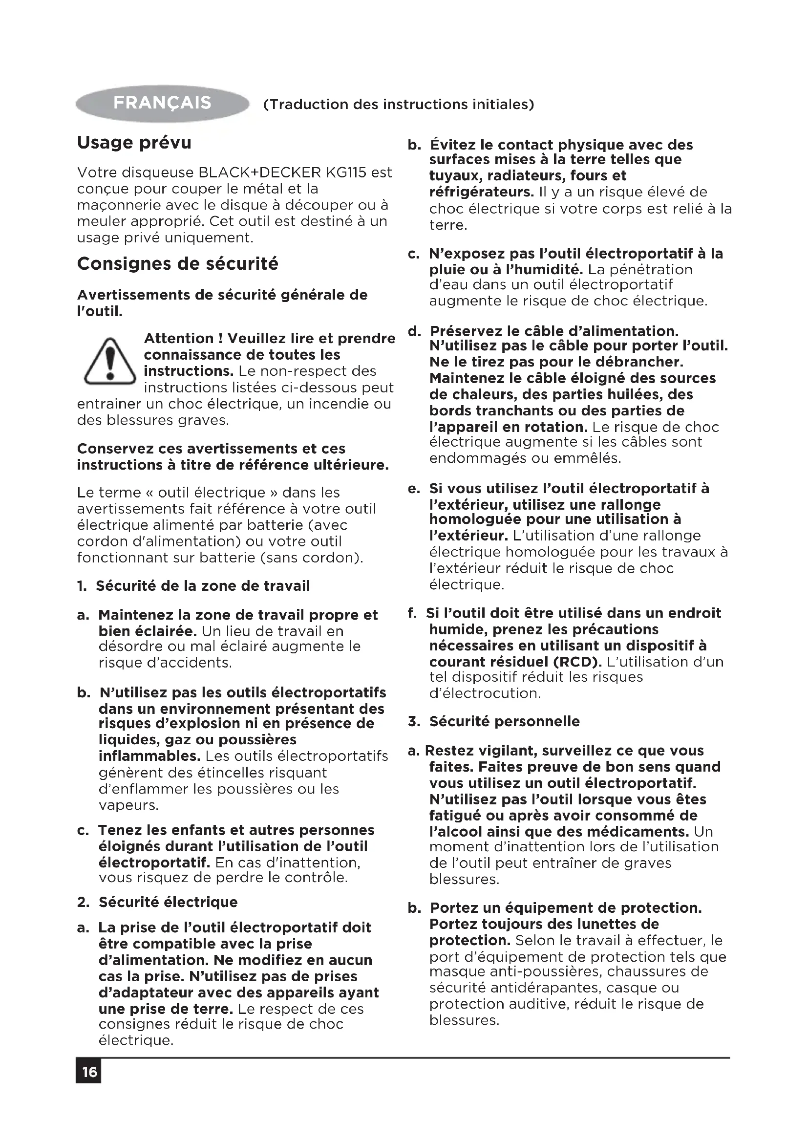 - Repairs have been attempted by persons other than authorised repair agents or Black + Decker service sta. To claim on the guarantee, you will need to submit proof of purchase to the seller or an authorised repair agent. You can check the location of your nearest authorised repair agent by contacting your local BLACK+DECKER oce at the address indicated in this manual. Alternatively, a list of authorised BLACK+DECKER repair agents and full details of our aftersales service and contacts are available on the Internet at: www.2helpU.com16 FRANÇAIS (Traduction des instructions initiales) Usage prévu Votre disqueuse BLACK+DECKER KG115 est conçue pour couper le métal et la maçonnerie avec le disque à découper ou à meuler approprié. Cet outil est destiné à un usage privé uniquement. Consignes de sécurité Avertissements de sécurité générale de l'outil. Attention ! Veuillez lire et prendre connaissance de toutes les instructions. Le non-respect des instructions listées ci-dessous peut entrainer un choc électrique, un incendie ou des blessures graves. Conservez ces avertissements et ces instructions à titre de référence ultérieure. Le terme « outil électrique » dans les avertissements fait référence à votre outil électrique alimenté par batterie (avec cordon d'alimentation) ou votre outil fonctionnant sur batterie (sans cordon).