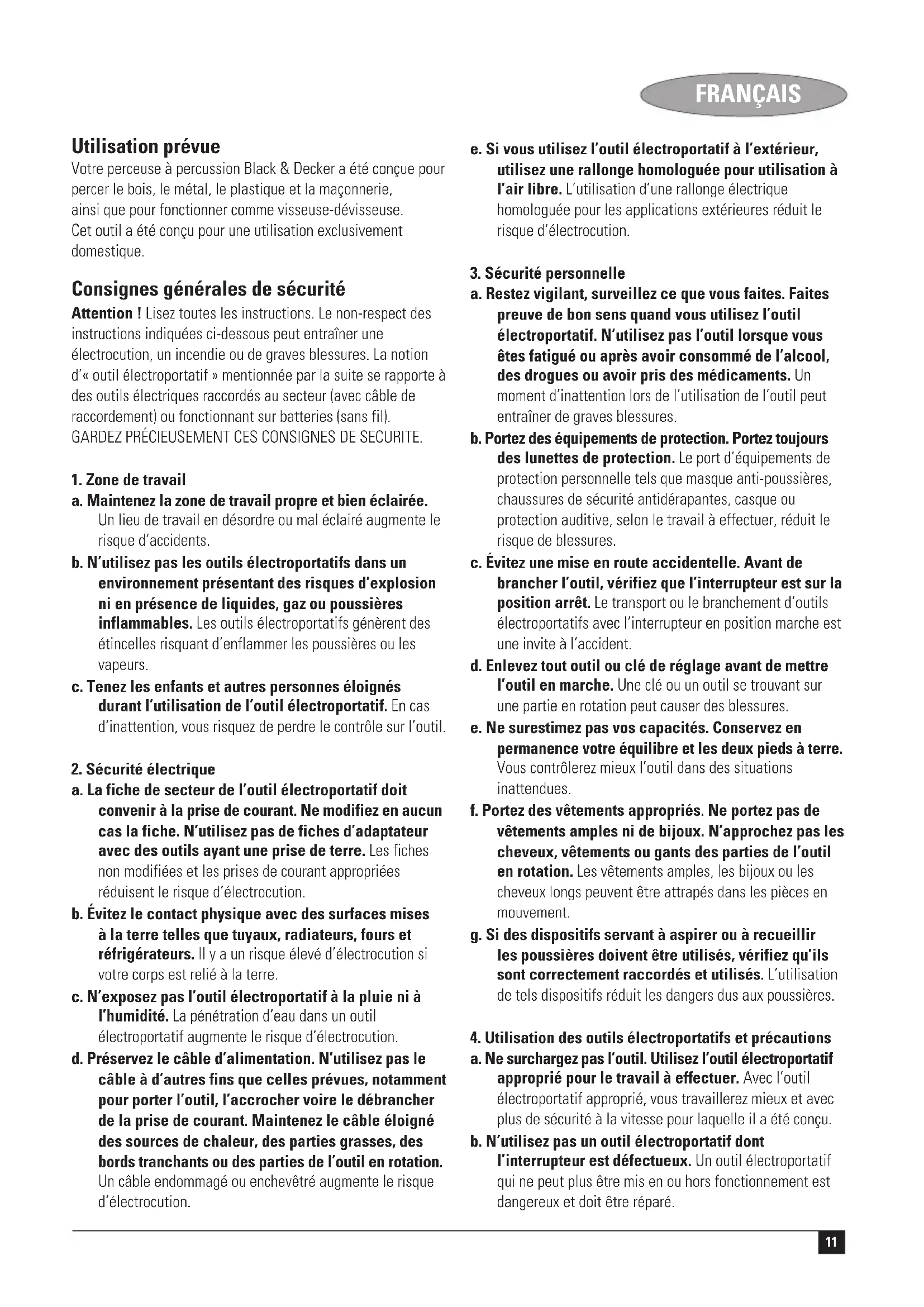a. Faites réparer votre outil électroportatif uniquement par du personnel qualifié et seulement avec des pièces de rechange d’origine. Cela garantira le maintien de la sécurité de votre outil. Instructions de sécurité supplémentaires pour les perceuses à percussion ◆ Portez une protection auditive avec les perceuses à percussion. L’exposition au bruit peut causer des pertes de l’audtion. ◆ Utilisez les poignées additionnelles fournies avec l’outil. Une perte de contrôle peut provoquer des blessures. Sécurité électrique L’outil est doublement isolé ; par conséquent, aucun câble de masse n’est nécessaire. Vérifiez si le voltage mentionné sur la plaque signalétique correspond bien à la tension de réseau sur site. ◆ Cet appareil n’est pas destiné à être utilisé par des jeunes ou des personnes infirmes sans supervision. Les enfants ne doivent pas jouer avec l’appareil. ◆ Si le câble d’alimentation est endommagé, il doit être remplacé par le fabricant ou par un centre de réparation agréé Black & Decker afin d’éviter tout accident. Caractéristiques Cet outil comprend toutes ou certaines des caractéristiques suivantes.