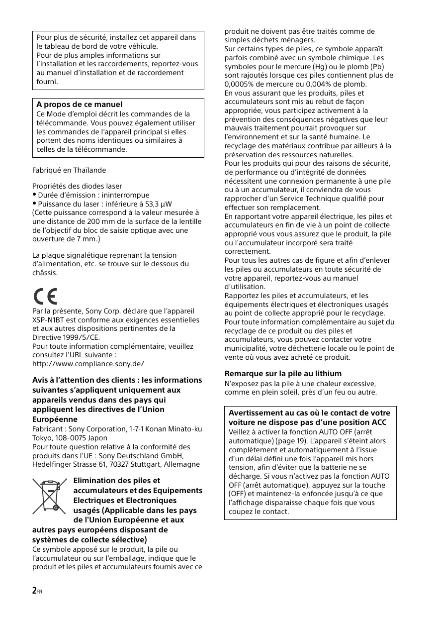 Das Zeichen lässt sich nicht anzeigen. WITHHELD Der Anrufer hat die Telefonnummernanzeige unterdrückt. BLUETOOTH-Funktion: BT BUSY (BLUETOOTH-Funktion belegt) Auf das Telefonbuch und die Rufliste des Mobiltelefons kann von diesem Gerät aus nicht zugegriffen werden. Warten Sie eine Weile und versuchen Sie es dann erneut. ERROR Die BT-Initialisierung ist fehlgeschlagen. Auf das Telefonbuch konnte nicht zugegriffen werden. Der Inhalt des Telefonbuchs wurde während des Zugriffs auf das Mobiltelefon geändert. Greifen Sie erneut auf das Telefonbuch im Mobiltelefon zu. MEM FAILURE (Speicherfehler) Das Speichern des Kontakts in der Kurzwahl dieses Geräts ist fehlgeschlagen. Vergewissern Sie sich, dass die zu speichernde Nummer richtig ist (Seite 15). MEMORY BUSY Auf diesem Gerät werden gerade Daten gespeichert. Warten Sie, bis der Speichervorgang abgeschlossen ist. NO DEV (kein Gerät) Sie versuchen, ein BLUETOOTH-Audiogerät als Tonquelle auszuwählen, aber es besteht keine Verbindung zu einem BLUETOOTH-Audiogerät. Die Verbindung zum BLUETOOTH-Audiogerät wurde während eines Anrufs getrennt. Stellen Sie eine Verbindung zu einem BLUETOOTH-Audiogerät her. Sie versuchen, ein BLUETOOTH-Telefon als Tonquelle auszuwählen, aber es besteht keine Verbindung zu einem Mobiltelefon. Die Verbindung zum Mobiltelefon wurde während eines Anrufs getrennt. Stellen Sie eine Verbindung zu einem Mobiltelefon her. P EMPTY (Kurzwahlnummer leer) Es sind keine Kurzwahlnummern gespeichert. 30DE Beim Verwenden von App Remote: APP -------- (Anwendung) Die Verbindung zur Anwendung wurde nicht hergestellt. Stellen Sie die iPhone-Verbindung erneut her. APP DISCNCT (Anwendung ohne Verbindung) Es besteht keine App Remote-Verbindung. Stellen Sie die App Remote-Verbindung her (Seite 17). APP MENU (Anwendungsmenü) Die Tastenfunktion steht nicht zur Verfügung, solange ein Menü am iPhone/AndroidMobiltelefon geöffnet ist. Schließen Sie das Menü am iPhone/AndroidMobiltelefon. APP NO DEV (kein Gerät mit Anwendung) Es wurde keine Verbindung zum Gerät mit der installierten Anwendung hergestellt. Schließen Sie das Gerät an und stellen Sie dann die iPhone-Verbindung her. APP SOUND (Klang der Anwendung) Die Tastenfunktion steht nicht zur Verfügung, solange ein Klang-Menü am iPhone/AndroidMobiltelefon geöffnet ist. Schließen Sie das Klang-Menü am iPhone/ Android-Mobiltelefon. OPEN APP (Anwendung öffnen) Die Anwendung „App Remote“ läuft nicht. Starten Sie die iPhone-Anwendung. Wenn sich das Problem mit diesen Abhilfemaßnahmen nicht beheben lässt, wenden Sie sich an einen Sony-Händler. Wenn Sie das Gerät aufgrund einer Störung bei der CD-Wiedergabe zur Reparatur bringen, bringen Sie bitte auch die CD mit, die eingelegt war, als das Problem zum ersten Mal auftrat. Pour plus de sécurité, installez cet appareil dans le tableau de bord de votre véhicule. Pour de plus amples informations sur l’installation et les raccordements, reportez-vous au manuel d’installation et de raccordement fourni. A propos de ce manuel Ce Mode d’emploi décrit les commandes de la télécommande. Vous pouvez également utiliser les commandes de l’appareil principal si elles portent des noms identiques ou similaires à celles de la télécommande. Fabriqué en Thaïlande Propriétés des diodes laser Durée d’émission : ininterrompue Puissance du laser : inférieure à 53,3 μW (Cette puissance correspond à la valeur mesurée à une distance de 200 mm de la surface de la lentille de l’objectif du bloc de saisie optique avec une ouverture de 7 mm.) La plaque signalétique reprenant la tension d’alimentation, etc. se trouve sur le dessous du châssis. Par la présente, Sony Corp. déclare que l’appareil XSP-N1BT est conforme aux exigences essentielles et aux autres dispositions pertinentes de la Directive 1999/5/CE. Pour toute information complémentaire, veuillez consultez l’URL suivante : http://www.compliance.sony.de/ Avis à l’attention des clients : les informations suivantes s’appliquent uniquement aux appareils vendus dans des pays qui appliquent les directives de l’Union Européenne Fabricant : Sony Corporation, 1-7-1 Konan Minato-ku Tokyo, 108-0075 Japon Pour toute question relative à la conformité des produits dans l’UE : Sony Deutschland GmbH, Hedelfinger Strasse 61, 70327 Stuttgart, Allemagne Elimination des piles et accumulateurs et des Equipements Electriques et Electroniques usagés (Applicable dans les pays de l'Union Européenne et aux autres pays européens disposant de systèmes de collecte sélective) Ce symbole apposé sur le produit, la pile ou l’accumulateur ou sur l’emballage, indique que le produit et les piles et accumulateurs fournis avec ce 2FR produit ne doivent pas être traités comme de simples déchets ménagers. Sur certains types de piles, ce symbole apparaît parfois combiné avec un symbole chimique. Les symboles pour le mercure (Hg) ou le plomb (Pb) sont rajoutés lorsque ces piles contiennent plus de 0,0005% de mercure ou 0,004% de plomb. En vous assurant que les produits, piles et accumulateurs sont mis au rebut de façon appropriée, vous participez activement à la prévention des conséquences négatives que leur mauvais traitement pourrait provoquer sur l’environnement et sur la santé humaine. Le recyclage des matériaux contribue par ailleurs à la préservation des ressources naturelles. Pour les produits qui pour des raisons de sécurité, de performance ou d’intégrité de données nécessitent une connexion permanente à une pile ou à un accumulateur, il conviendra de vous rapprocher d’un Service Technique qualifié pour effectuer son remplacement. En rapportant votre appareil électrique, les piles et accumulateurs en fin de vie à un point de collecte approprié vous vous assurez que le produit, la pile ou l'accumulateur incorporé sera traité correctement. Pour tous les autres cas de figure et afin d’enlever les piles ou accumulateurs en