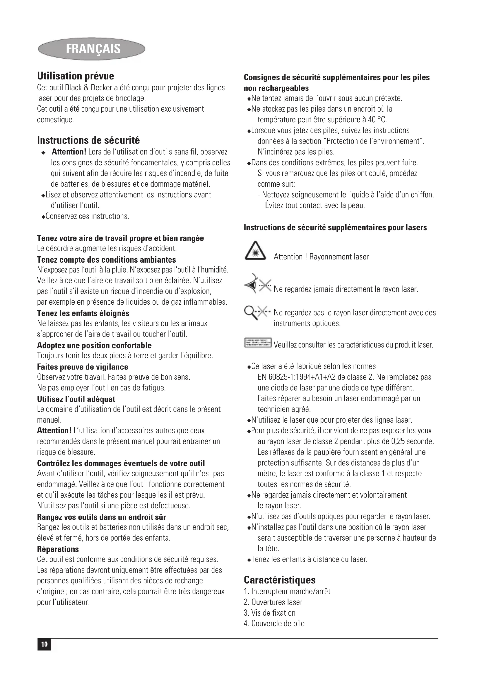 Kevin Hewitt Director of Consumer Engineering Spennymoor, County Durham DL16 6JG, United Kingdom 1-12-2004 Garantie Black & Decker vertraut auf die Qualität der eigenen Geräte und bietet dem Käufer eine außergewöhnliche Garantie. Diese Garantiezusage versteht sich unbeschadet der gesetzlichen Gewährleistungsansprüche und schränkt diese keinesfalls ein. Sie gilt in sämtlichen Mitgliedsstaaten der Europäischen Union und der Europäischen Freihandelszone EFTA.9 DEUTSCH Tritt innerhalb von 24 Monaten ab Kaufdatum an einem Gerät von Black & Decker ein auf Material- oder Verarbeitungsfehler zurückzuführender Mangel auf, garantiert Black & Decker den Austausch defekter Teile, die Reparatur von Geräten mit üblichem Verschleiß bzw. den Austausch eines mangelhaften Geräts, ohne den Kunden dabei mehr als unbedingt nötig in Anspruch zu nehmen, allerdings vorbehaltlich folgender Ausnahmen: ◆ wenn das Gerät gewerblich, beruflich oder im Verleihgeschäft benutzt wurde; ◆ wenn das Gerät mißbräuchlich verwendet oder mit mangelnder Sorgfalt behandelt wurde; ◆ wenn das Gerät durch irgendwelche Fremdeinwirkung beschädigt wurde; ◆ wenn ein unbefugter Reparaturversuch durch anderes Personal als das einer Vertragswerkstatt oder des Black & Decker-Kundendienstes unternommen wurde. Zur Inanspruchnahme dieser Garantie ist dem Verkäufer bzw. der Vertragswerkstatt ein Kaufnachweis vorzulegen. Der Kaufnachweis muß Kaufdatum und Gerätetyp bescheinigen. Die Adresse des zuständigen Büros von Black & Decker steht in dieser Anleitung, darüber läßt sich die nächstgelegene Vertragswerkstatt ermitteln. Außerdem ist eine Liste der Vertragswerkstätten und aller Kundendienststellen von Black & Decker sowie der zuständigen Ansprechpartner im Internet zu finden unter: www.2helpU.com Bitte besuchen Sie untere Webseite www.blackanddecker.de, um Ihr neues Black & Decker Produkt zu registrieren und über neue Produkte und Sonderangebote aktuell informiert zu werden. Weitere Informationen über die Marke Black & Decker und unsere Produkte finden Sie unter www.blackanddecker.de10 FRANÇAIS Utilisation prévue Cet outil Black & Decker a été conçu pour projeter des lignes laser pour des projets de bricolage. Cet outil a été conçu pour une utilisation exclusivement domestique. Instructions de sécurité ◆ Attention! Lors de l’utilisation d’outils sans fil, observez les consignes de sécurité fondamentales, y compris celles qui suivent afin de réduire les risques d’incendie, de fuite de batteries, de blessures et de dommage matériel. ◆ Lisez et observez attentivement les instructions avant d’utiliser l’outil. ◆ Conservez ces instructions. Tenez votre aire de travail propre et bien rangée Le désordre augmente les risques d’accident. Tenez compte des conditions ambiantes N’exposez pas l’outil à la pluie. N’exposez pas l’outil à l’humidité. Veillez à ce que l’aire de travail soit bien éclairée. N’utilisez pas l’outil s’il existe un risque d’incendie ou d’explosion, par exemple en présence de liquides ou de gaz inflammables. Tenez les enfants éloignés Ne laissez pas les enfants, les visiteurs ou les animaux s’approcher de l’aire de travail ou toucher l’outil. Adoptez une position confortable Toujours tenir les deux pieds à terre et garder l’équilibre. Faites preuve de vigilance Observez votre travail. Faites preuve de bon sens. Ne pas employer l’outil en cas de fatigue. Utilisez l’outil adéquat Le domaine d’utilisation de l’outil est décrit dans le présent manuel. Attention! L’utilisation d’accessoires autres que ceux recommandés dans le présent manuel pourrait entrainer un risque de blessure. Contrôlez les dommages éventuels de votre outil Avant d’utiliser l’outil, vérifiez soigneusement qu’il n’est pas endommagé. Veillez à ce que l’outil fonctionne correctement et qu’il exécute les tâches pour lesquelles il est prévu. N’utilisez pas l’outil si une pièce est défectueuse. Rangez vos outils dans un endroit sûr Rangez les outils et batteries non utilisés dans un endroit sec, élevé et fermé, hors de portée des enfants. Réparations Cet outil est conforme aux conditions de sécurité requises. Les réparations devront uniquement être effectuées par des personnes qualifiées utilisant des pièces de rechange d’origine ; en cas contraire, cela pourrait être très dangereux pour l’utilisateur. Consignes de sécurité supplémentaires pour les piles non rechargeables ◆ Ne tentez jamais de l’ouvrir sous aucun prétexte. ◆ Ne stockez pas les piles dans un endroit où la température peut être supérieure à 40 °C. ◆ Lorsque vous jetez des piles, suivez les instructions données à la section “Protection de l’environnement”. N’incinérez pas les piles. ◆ Dans des conditions extrêmes, les piles peuvent fuire. Si vous remarquez que les piles ont coulé, procédez comme suit: - Nettoyez soigneusement le liquide à l’aide d’un chiffon. Évitez tout contact avec la peau. Instructions de sécurité supplémentaires pour lasers Attention ! Rayonnement laser Ne regardez jamais directement le rayon laser. Ne regardez pas le rayon laser directement avec des instruments optiques. Veuillez consulter les caractéristiques du produit laser. ◆ Ce laser a été fabriqué selon les normes EN 60825-1:1994+A1+A2 de classe 2. Ne remplacez pas une diode de laser par une diode de type différent. Faites réparer au besoin un laser endommagé par un technicien agréé. ◆ N’utilisez le laser que pour projeter des lignes laser. ◆ Pour plus de sécurité, il convient de ne pas exposer les yeux au rayon laser de classe 2 pendant plus de 0,25 seconde. Les réflexes de la paupière fournissent en général une protection suffisante. Sur des distances de plus d’un mètre, le laser est conforme à la classe 1 et respecte toutes les normes de sécurité. ◆ Ne regardez jamais direct