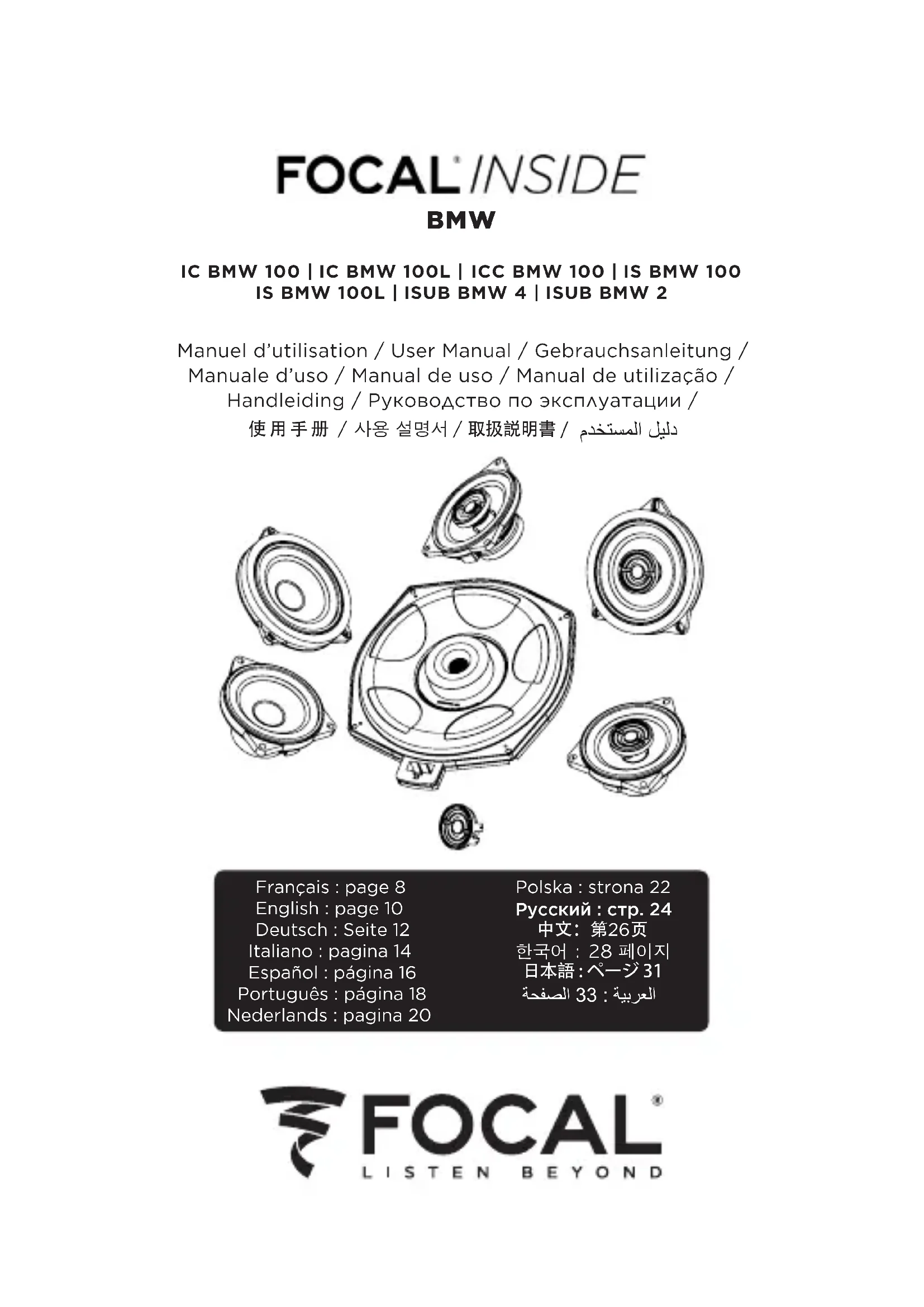 Manuel d’utilisation Nous vous remercions d’avoir choisi les kits IC BMW 100, IC BMW 100L, ICC BMW 100, IS BMW 100, IS BMW 100L, ISUB BMW 4 & ISUB BMW 2 et de partager avec nous notre passion du son, de la musique, révélés avec precision et pureté : "Listen Beyond". Ces haut-parleurs de haute technicité intègrent les perfectionnements Focal en matière de conception de haut- parleurs pour l’obtention d’un son puissant et de très haute qualité. Afin de tirer le meilleur de votre système et d’exploiter toutes leurs performances, nous vous conseillons de lire ce livret, puis de le conserver avec précaution pour pouvoir vous y référer ultérieurement. Tout problème dû au non-respect des règles d’utilisation peut entraîner l’invalidation de la garantie. Pour un résultat optimal, nous vous recommandons de faire effectuer l'installation par un professionnel. Conditions de garantie La garantie pour la France sur tout matériel Focal est de 2 ans. En cas de matériel défectueux, celui-ci doit être expédié à vos frais, dans son emballage d’origine auprès du revendeur, lequel analysera le matériel et déterminera la nature de la panne. Si celui- ci est sous garantie, le matériel sera réparé ou remplacé et vous sera rendu. Dans le cas contraire, un devis de réparation vous sera proposé. La garantie ne couvre pas les dommages résultant d’une mauvaise utilisation ou d’un branchement incorrect (bobines mobiles brûlées par exemple...). En dehors de la France, le matériel Focal est couvert par une garantie dont les conditions sont fixées localement par le distributeur officiel Focal de chaque pays, en accord avec les lois en vigueur sur le territoire concerné. Pour validation de la garantie Focal-JMlab, il est maintenant possible d’enregistrer son produit en ligne : www.focal.com/garantie Dans un but d'évolution, Focal-JMlab se réserve le droit de modifier les spécifications techniques de ses produits sans préavis. Images non contractuelles. FrançaisREAD FIRST! IMPORTANT SAFETY INSTRUCTIONS! The exclamation mark represented in an equilateral triangle is intended to alert users to the existence of important instructions in the user manual relating to the use and maintenance of the device.