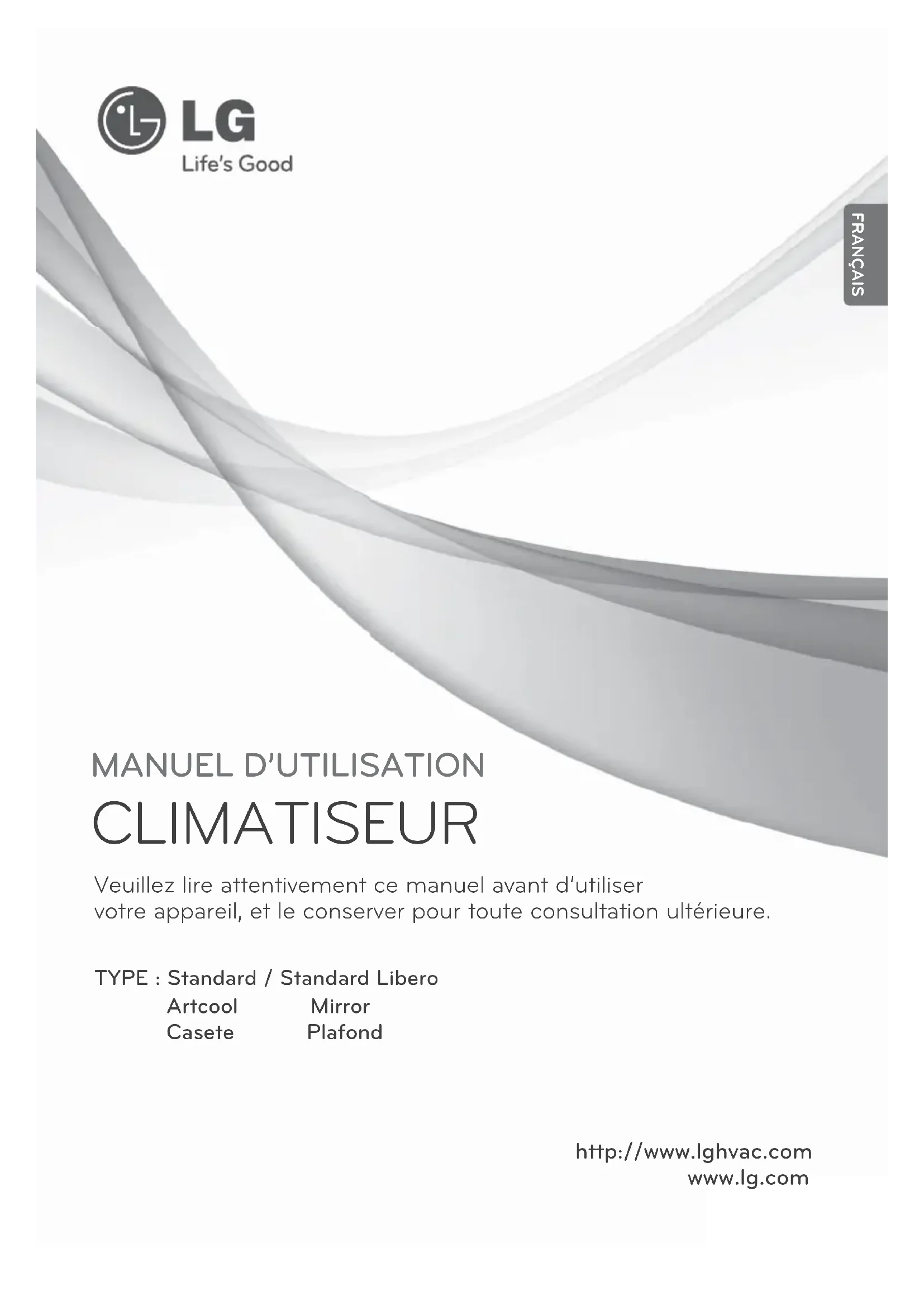 Retrait des filtres. Retirer les onglets et tirer doucement pourenlever le filtre. ATTENTION : Lors du retrait dufiltre à air ne pas toucher les partiesmétalliques de l’unité d’entrée.Risque de blessure. Nettoyer le filtre à air à l’aide d’un aspirateurou le laver à l’eau claire. Si la saleté est profonde, le laver avec unesolution d’eau tiède et de détergent. Ne pas utiliser d’eau chaude (50ºC ou plus)qui pourrait le déformer. Après le lavage du filtre à air, le fairesécher à l’ombre. Ne pas exposer le filtre à air directementaux rayons du soleil ou à la chaleur d’un feulors du séchage. Installation du filtre à air.[Type Standard Libero] Filtre tripleFiltre Plasma /Filtre antiallergique Attendez au moins 10 secondes avant de toucher au filtre plasma après ouverture de la grille d’entrée d’air ;autrement, vous risquez de subir un choc électrique. ATTENTION Type cassette plafondEntretien et service 22 Climatiseur Mural Conseils d’utilisation Ne refroidissez pas à l’excès la pièce. Ce n'est pas bon pour la santé et cela vous fera gaspiller l'électricité. Maintenez fermés stores et rideaux. Veillez à ce que le soleil n’entre pas directement dans la pièce lorsque le climatiseur est en fonctionnement. Gardez une température ambiante uniforme. Réglez la direction du flux d’air vertical et horizontal afin d’assurer une température ambiante uniforme. Veillez à ce que les portes et les fenêtres soient bien fermées. Évitez autant que possible d’ouvrir les portes et les fenêtres afin de conserver l'air froid dans la pièce. Nettoyez régulière- ment les filtres à air. Les obstructions dans le filtre à air réduisent le flux d'air ainsi que les effets de refroidissement et de déshumidification. Nettoyez-les au moins une fois tous les quinze jours. Aérez la salle de temps en temps. Puisque les fenêtres restent fermées, il est conseillé de les ouvrir et d'aérer la pièce de temps en temps. Utilisez la vitesse élevée du ventilateur pour un refroidissement rapide et efficace. La capacité de refroidissement de l’unité est d’autant plus grande que le ventilateur tourne à une vitesse élevée.MANUAL DEL PROPIETARIO AIRE ACONDICIONADO Por favor lea este manual detenidamente antes de utilizar su equipo y guárdelo para consultas futuras. TIPO: Estándar / Estándar Libero Artcool Mirror Casete de Techo http://www.lghvac.com www.lg.com ESPAÑOL2 Aire acondicionado Manual de usuario para varios tipos de sistemas de aire acondicionado CONTENIDO