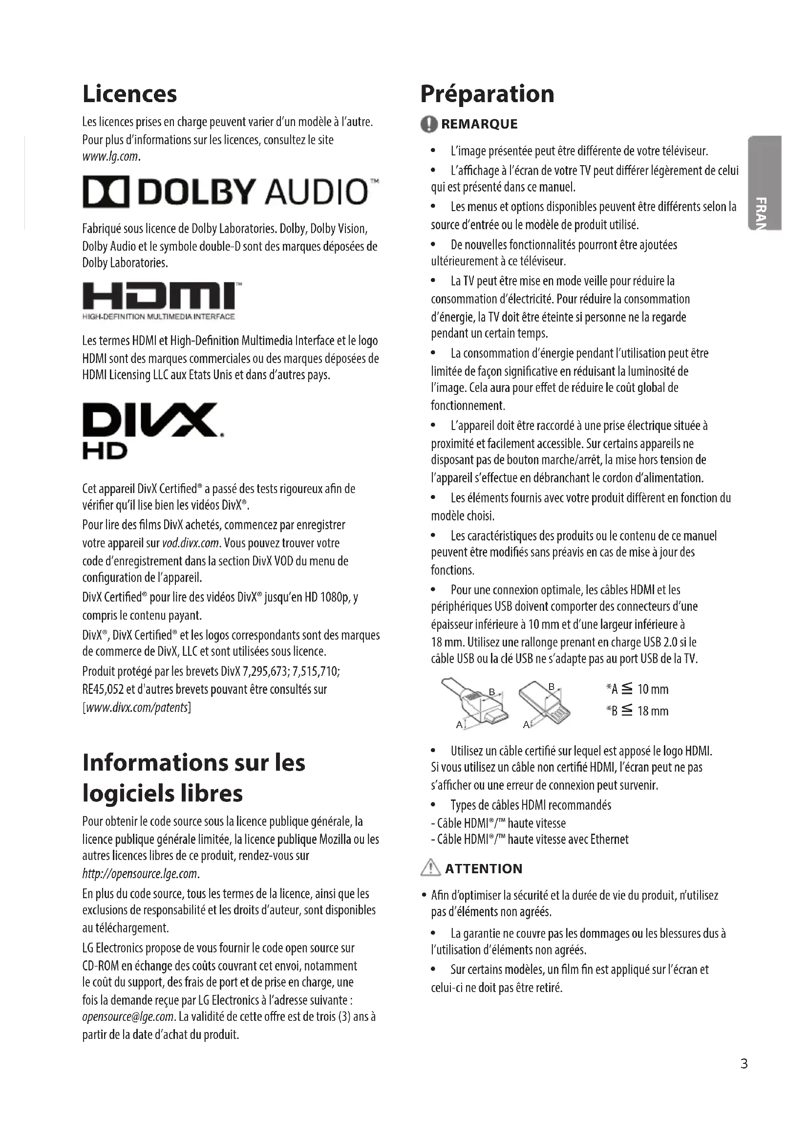 Licences Les licences prises en charge peuvent varier d’un modèle à l’autre. Pour plus d’informations sur les licences, consultez le site ww w.lg.com. Fabriqué sous licence de Dolby Laboratories. Dolby, Dolby Vision, Dolby Audio et le symbole double-D sont des marques déposées de Dolby Laboratories. Les termes HDMI et High-Denition Multimedia Interface et le logo HDMI sont des marques commerciales ou des marques déposées de HDMI Licensing LLC aux Etats Unis et dans d’autres pays. Cet appareil DivX Certied® a passé des tests rigoureux an de vérier qu’il lise bien les vidéos DivX®. Pour lire des lms DivX achetés, commencez par enregistrer votre appareil sur vod.divx.com. Vous pouvez trouver votre code d’enregistrement dans la section DivX VOD du menu de conguration de l’appareil. DivX Certied® pour lire des vidéos DivX® jusqu’en HD 1080p, y compris le contenu payant. DivX®, DivX Certied® et les logos correspondants sont des marques de commerce de DivX, LLC et sont utilisées sous licence. Produit protégé par les brevets DivX 7,295,673; 7,515,710; RE45,052 et d'autres brevets pouvant être consultés sur [ww w.divx.com/patents] Informations sur les logiciels libres Pour obtenir le code source sous la licence publique générale, la licence publique générale limitée, la licence publique Mozilla ou les autres licences libres de ce produit, rendez-vous sur http://opensource.lge.com. En plus du code source, tous les termes de la licence, ainsi que les exclusions de responsabilité et les droits d’auteur, sont disponibles au téléchargement. LG Electronics propose de vous fournir le code open source sur CD-ROM en échange des coûts couvrant cet envoi, notamment le coût du support, des frais de port et de prise en charge, une fois la demande reçue par LG Electronics à l’adresse suivante : opensource@lge.com. La validité de cette ore est de trois (3) ans à partir de la date d’achat du produit. Préparation REMARQUE y L’image présentée peut être diérente de votre téléviseur. y L’achage à l’écran de votre TV peut diérer légèrement de celui qui est présenté dans ce manuel. y Les menus et options disponibles peuvent être diérents selon la source d’entrée ou le modèle de produit utilisé. y De nouvelles fonctionnalités pourront être ajoutées ultérieurement à ce téléviseur. y La TV peut être mise en mode veille pour réduire la consommation d’électricité. Pour réduire la consommation d’énergie, la TV doit être éteinte si personne ne la regarde pendant un certain temps. y La consommation d’énergie pendant l’utilisation peut être limitée de façon signicative en réduisant la luminosité de l’image. Cela aura pour eet de réduire le coût global de fonctionnement. y L’appareil doit être raccordé à une prise électrique située à proximité et facilement accessible. Sur certains appareils ne disposant pas de bouton marche/arrêt, la mise hors tension de l’appareil s’eectue en débranchant le cordon d’alimentation. y Les éléments fournis avec votre produit dièrent en fonction du modèle choisi. y Les caractéristiques des produits ou le contenu de ce manuel peuvent être modiés sans préavis en cas de mise à jour des fonctions. y Pour une connexion optimale, les câbles HDMI et les périphériques USB doivent comporter des connecteurs d’une épaisseur inférieure à 10mm et d’une largeur inférieure à 18mm. Utilisez une rallonge prenant en charge USB 2.0 si le câble USB ou la clé USB ne s’adapte pas au port USB de la TV.