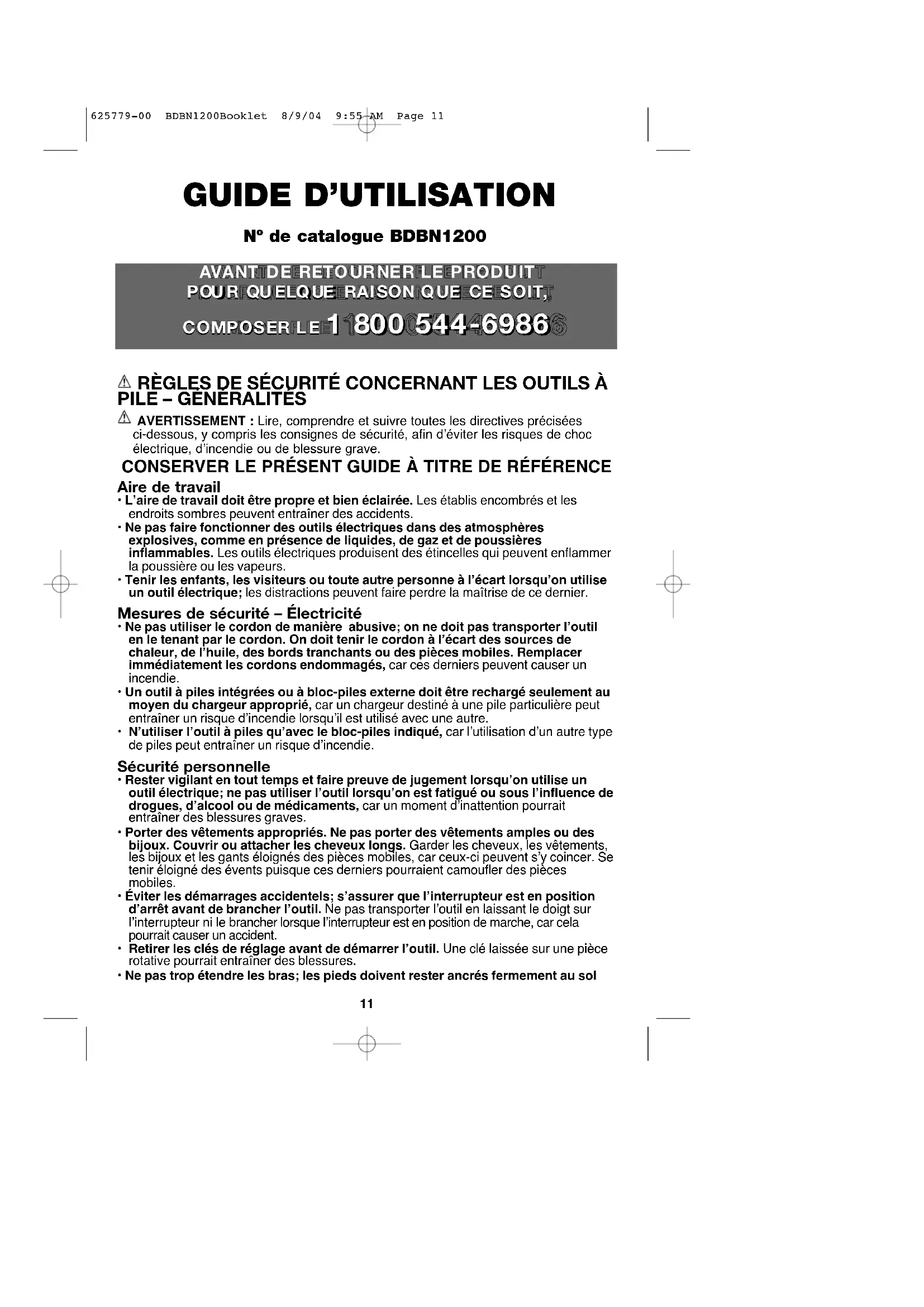 présenter un danger. Information sur les services Black & Decker dispose d'un réseau complet composé de centres de service et de centres autorisés situés partout en Amérique du Nord. Tous les centres de service Black & Decker sont dotés de personnel qualifié en matière d'outillage électrique; ils sont donc en mesure d'offrir à leur clientèle un service efficace et fiable. Pour obtenir un conseil technique ou une pièce d'origine ou pour faire réparer un outil, on peut communiquer avec le centre Black & Decker le plus près. Pour obtenir le numéro de téléphone, consulter les pages jaunes sous la rubrique "Outils - électriques" ou composer le 1 800 544-6986 (1-800-54-HOW-TO). Garantie complète de deux ans pour usage résidentiel Black & Decker (U.S.) Inc. garantit ce produit pour une période de deux ans contre tout défaut de matériel ou de fabrication. Le produit défectueux sera remplacé ou réparé sans frais, suivant l’une des deux méthodes suivantes. La première méthode consiste en un échange seulement. On doit retourner le produit au détaillant qui l’a vendu (pourvu qu’il s’agisse d’un détaillant participant), en respectant les délais stipulés dans sa politique relative aux échanges (normalement de 30 à 90 jours après la vente). Une preuve d’achat peut être requise. On doit vérifier la politique de retour du détaillant pour tout produit retourné après le délai prescrit pour les échanges. La deuxième méthode consiste à apporter ou à envoyer le produit (prépayé) à un centre Black & Decker ou à un centre de service autorisé aux fins de réparation ou de remplacement, selon notre choix. Une preuve d’achat peut être requise. Les centres Black & Decker et les centres de service autorisés sont répertoriés dans les pages jaunes sous la rubrique «Outils - électriques». Cette garantie ne s’applique pas aux accessoires. Elle confère des droits légaux particuliers à l’acheteur, mais celui-ci pourrait aussi bénéficier d’autres droits variant d’un territoire à l’autre. Toute question doit être adressée au gérant du centre Black & Decker le plus près. Ce produit n’est pas destiné à un usage commercial. REMPLACEMENT GRATUIT DE L’ÉTIQUETTE D’AVERTISSEMENT : En cas de perte ou d’endommagement des étiquettes d’avertissement, composer le 1 800 544-6986 afin d’en obtenir de nouvelles sans frais. Imported by / Importé par Black & Decker Canada Inc. 100 Central Ave. Brockville (Ontario) K6V 5W6 Voir la rubrique “Outils électriques” des Pages Jaunes pour le service et les ventes. 625779-00 BDBN1200Booklet 8/9/04 9:55 AM Page 2021