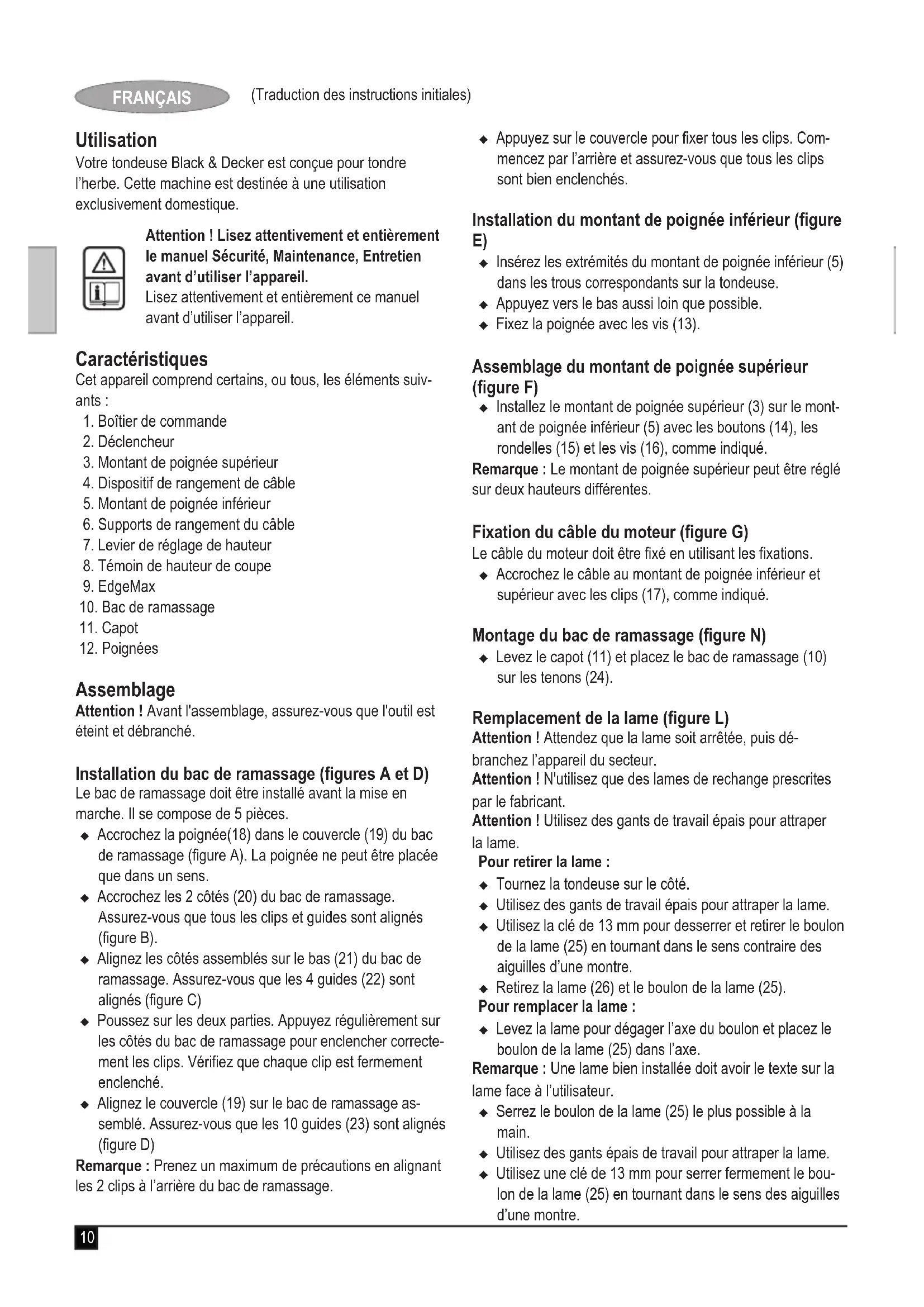 (Traduction des instructions initiales) FRANÇAIS Utilisation Votre tondeuse Black & Decker est conçue pour tondre l’herbe. Cette machine est destinée à une utilisation exclusivement domestique. Attention ! Lisez attentivement et entièrement le manuel Sécurité, Maintenance, Entretien avant d’utiliser l’appareil. Lisez attentivement et entièrement ce manuel avant d’utiliser l’appareil. Caractéristiques Cet appareil comprend certains, ou tous, les éléments suiv- ants :