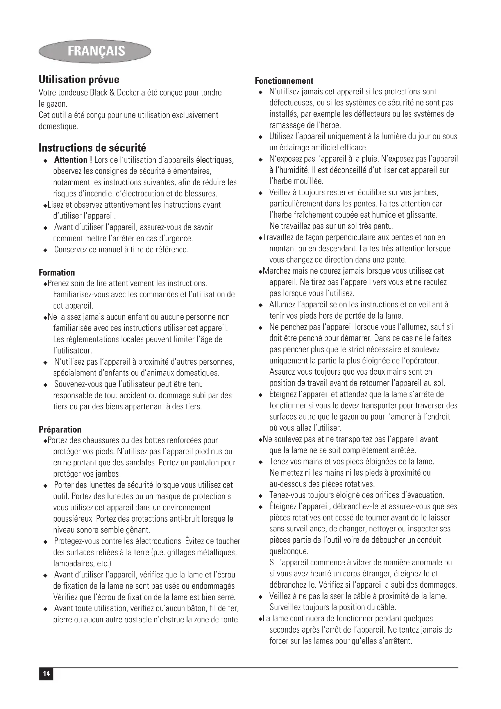 Kevin Hewitt Director of Consumer Engineering Spennymoor, County Durham DL16 6JG, Vereinigtes Königreich 1-8-2004 Garantie Black & Decker vertraut auf die Qualität der eigenen Geräte und bietet dem Käufer eine außergewöhnliche Garantie. Diese Garantiezusage versteht sich unbeschadet der gesetzlichen Gewährleistungsansprüche und schränkt diese keinesfalls ein. Sie gilt in sämtlichen Mitgliedsstaaten der Europäischen Union und der Europäischen Freihandelszone EFTA. Tritt innerhalb von 24 Monaten ab Kaufdatum an einem Gerät von Black & Decker ein auf Material- oder Verarbeitungsfehler zurückzuführender Mangel auf, garantiert Black & Decker den Austausch defekter Teile, die Reparatur von Geräten mit üblichem Verschleiß bzw. den Austausch eines mangelhaften Geräts, ohne den Kunden dabei mehr als unbedingt nötig in Anspruch zu nehmen, allerdings vorbehaltlich folgender Ausnahmen: ◆ wenn das Gerät gewerblich, beruflich oder im Verleihgeschäft benutzt wurde; ◆ wenn das Gerät mißbräuchlich verwendet oder mit mangelnder Sorgfalt behandelt wurde; ◆ wenn das Gerät durch irgendwelche Fremdeinwirkung beschädigt wurde; ◆ wenn ein unbefugter Reparaturversuch durch anderes Personal als das einer Vertragswerkstatt oder des Black & Decker-Kundendienstes unternommen wurde. Zur Inanspruchnahme dieser Garantie ist dem Verkäufer bzw. der Vertragswerkstatt ein Kaufnachweis vorzulegen. Der Kaufnachweis muß Kaufdatum und Gerätetyp bescheinigen. Die Adresse des zuständigen Büros von Black & Decker steht in dieser Anleitung, darüber läßt sich die nächstgelegene Vertragswerkstatt ermitteln. Außerdem ist eine Liste der Vertragswerkstätten und aller Kundendienststellen von Black & Decker sowie der zuständigen Ansprechpartner im Internet zu finden unter: www.2helpU.com Bitte besuchen Sie untere Webseite www.blackanddecker.de, um Ihr neues Black & Decker Produkt zu registrieren und über neue Produkte und Sonderangebote aktuell informiert zu werden. Weitere Informationen über die Marke Black & Decker und unsere Produkte finden Sie unter www.blackanddecker.de14 FRANÇAIS Utilisation prévue Votre tondeuse Black & Decker a été conçue pour tondre le gazon. Cet outil a été conçu pour une utilisation exclusivement domestique. Instructions de sécurité ◆ Attention ! Lors de l’utilisation d’appareils électriques, observez les consignes de sécurité élémentaires, notamment les instructions suivantes, afin de réduire les risques d’incendie, d’électrocution et de blessures. ◆ Lisez et observez attentivement les instructions avant d’utiliser l’appareil. ◆ Avant d’utiliser l’appareil, assurez-vous de savoir comment mettre l’arrêter en cas d’urgence. ◆ Conservez ce manuel à titre de référence. Formation ◆ Prenez soin de lire attentivement les instructions. Familiarisez-vous avec les commandes et l’utilisation de cet appareil. ◆ Ne laissez jamais aucun enfant ou aucune personne non familiarisée avec ces instructions utiliser cet appareil. Les réglementations locales peuvent limiter l’âge de l’utilisateur. ◆ N’utilisez pas l’appareil à proximité d’autres personnes, spécialement d’enfants ou d’animaux domestiques. ◆ Souvenez-vous que l’utilisateur peut être tenu responsable de tout accident ou dommage subi par des tiers ou par des biens appartenant à des tiers. Préparation ◆ Portez des chaussures ou des bottes renforcées pour protéger vos pieds. N’utilisez pas l’appareil pied nus ou en ne portant que des sandales. Portez un pantalon pour protéger vos jambes. ◆ Porter des lunettes de sécurité lorsque vous utilisez cet outil. Portez des lunettes ou un masque de protection si vous utilisez cet appareil dans un environnement poussiéreux. Portez des protections anti-bruit lorsque le niveau sonore semble gênant. ◆ Protégez-vous contre les électrocutions. Évitez de toucher des surfaces reliées à la terre (p.e. grillages métalliques, lampadaires, etc.) ◆ Avant d’utiliser l’appareil, vérifiez que la lame et l’écrou de fixation de la lame ne sont pas usés ou endommagés. Vérifiez que l’écrou de fixation de la lame est bien serré. ◆ Avant toute utilisation, vérifiez qu’aucun bâton, fil de fer, pierre ou aucun autre obstacle n’obstrue la zone de tonte. Fonctionnement ◆ N’utilisez jamais cet appareil si les protections sont défectueuses, ou si les systèmes de sécurité ne sont pas installés, par exemple les déflecteurs ou les systèmes de ramassage de l’herbe. ◆ Utilisez l’appareil uniquement à la lumière du jour ou sous un éclairage artificiel efficace. ◆ N’exposez pas l’appareil à la pluie. N’exposez pas l’appareil à l’humidité. Il est déconseillé d’utiliser cet appareil sur l’herbe mouillée. ◆ Veillez à toujours rester en équilibre sur vos jambes, particulièrement dans les pentes. Faites attention car l’herbe fraîchement coupée est humide et glissante. Ne travaillez pas sur un sol très pentu. ◆ Travaillez de façon perpendiculaire aux pentes et non en montant ou en descendant. Faites très attention lorsque vous changez de direction dans une pente. ◆ Marchez mais ne courez jamais lorsque vous utilisez cet appareil. Ne tirez pas l’appareil vers vous et ne reculez pas lorsque vous l’utilisez. ◆ Allumez l’appareil selon les instructions et en veillant à tenir vos pieds hors de portée de la lame. ◆ Ne penchez pas l’appareil lorsque vous l’allumez, sauf s’il doit être penché pour démarrer. Dans ce cas ne le faites pas pencher plus que le strict nécessaire et soulevez uniquement la partie la plus éloignée de l’opérateur. Assurez-vous toujours que vos deux mains sont en position de travail avant de retourner l’appareil au sol. ◆ Éteignez l’appareil et attendez que la lame s’arrête de fonctionner si vous le devez transporter pour traverser des surfaces autre que le gazon ou pour l’amener à