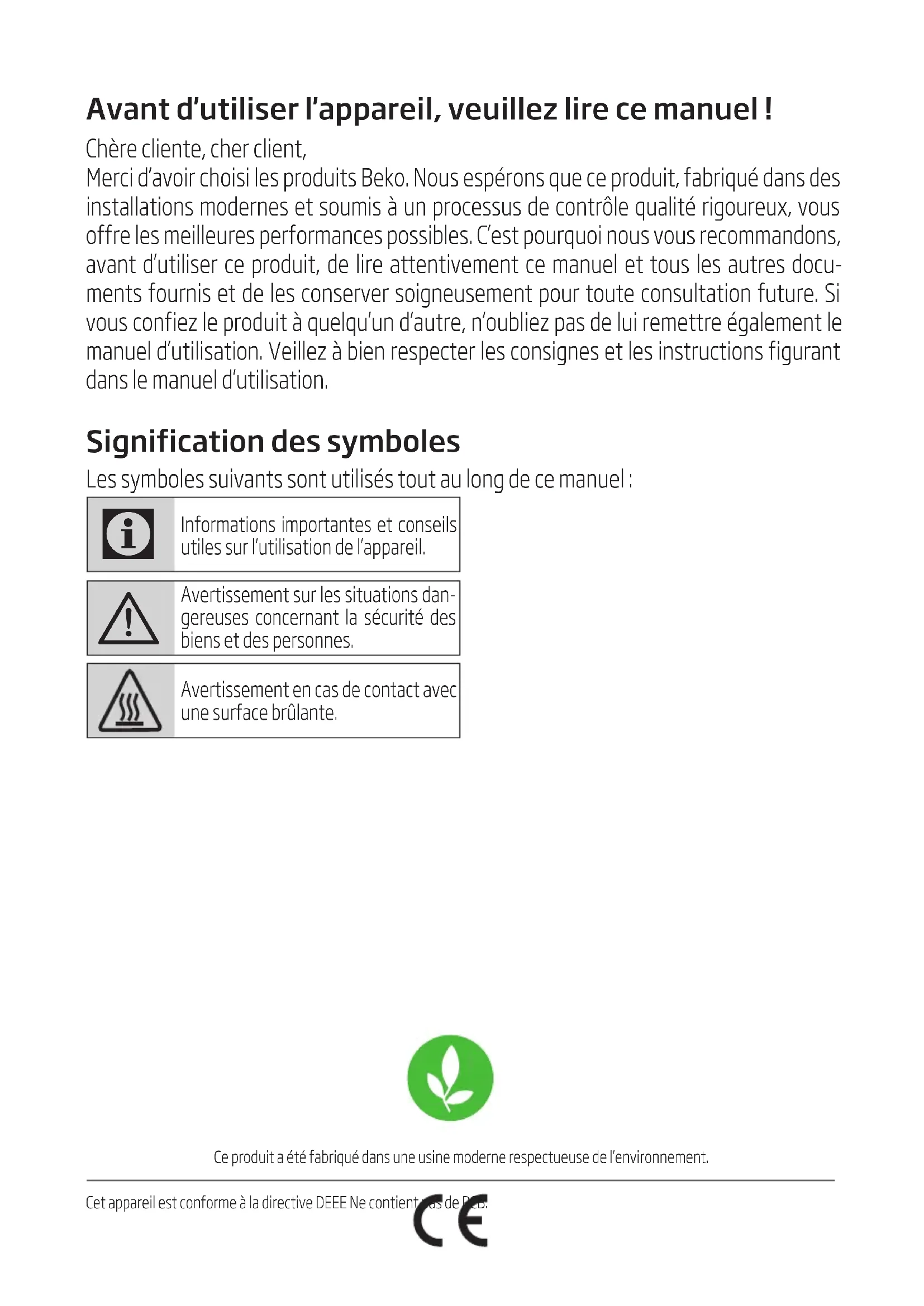 Gerätes sind verschmutzt. Verschmutzte Teile entspre- chend dem Abschnitt „Reinigung und Pflege“ reinigen.Avant d'utiliser l'appareil, veuillez lire ce manuel ! Chère cliente, cher client, Merci d’avoir choisi les produits Beko. Nous espérons que ce produit, fabriqué dans des installations modernes et soumis à un processus de contrôle qualité rigoureux, vous offre les meilleures performances possibles. C’est pourquoi nous vous recommandons, avant d’utiliser ce produit, de lire attentivement ce manuel et tous les autres docu- ments fournis et de les conserver soigneusement pour toute consultation future. Si vous confiez le produit à quelqu’un d’autre, n’oubliez pas de lui remettre également le manuel d’utilisation. Veillez à bien respecter les consignes et les instructions figurant dans le manuel d’utilisation. Signification des symboles Les symboles suivants sont utilisés tout au long de ce manuel :