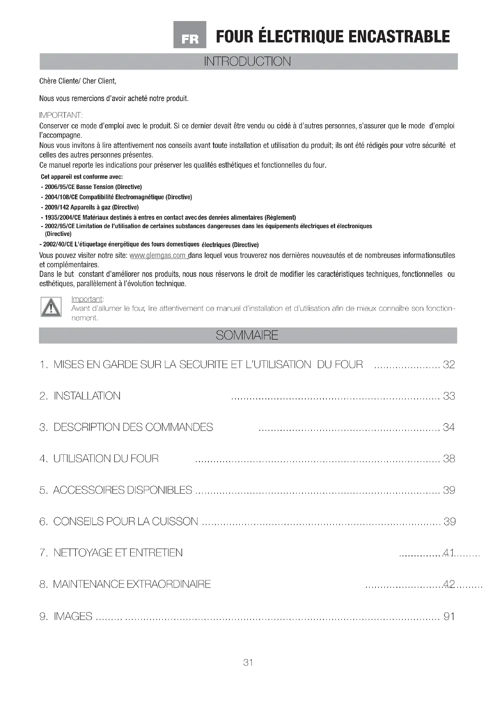 Cet appareil est conforme avec:- 2006/95/CE Basse Tension (Directive)- 2004/108/CE Compatibilité Electromagnétique (Directive)- 2009/142 Appareils à gaz (Directive)- 1935/2004/CE Matériaux destinés à entres en contact avec des denrées alimentaires (Règlement)- 2002/95/CE Limitation de l’utilisation de certaines substances dangereuses dans les équipements électriques et électroniques (Directive)- 2002/40/CE L’étiquetage énergétique des fours domestiques électriques (Directive)32 INSTRUCTIONS POUR L’INSTALLATEUR: Elles indiquent les opérations destinées au TECHNICIEN QUALIFIE qui doit effectuer l’installation, la mise en service et l’essai de l’appareil. INSTRUCTIONS POUR L’UTILISATEUR: Elles indiquent les conseils d’utilisation, la description des commandes et les opérations de nettoyage et de maintenance du four.