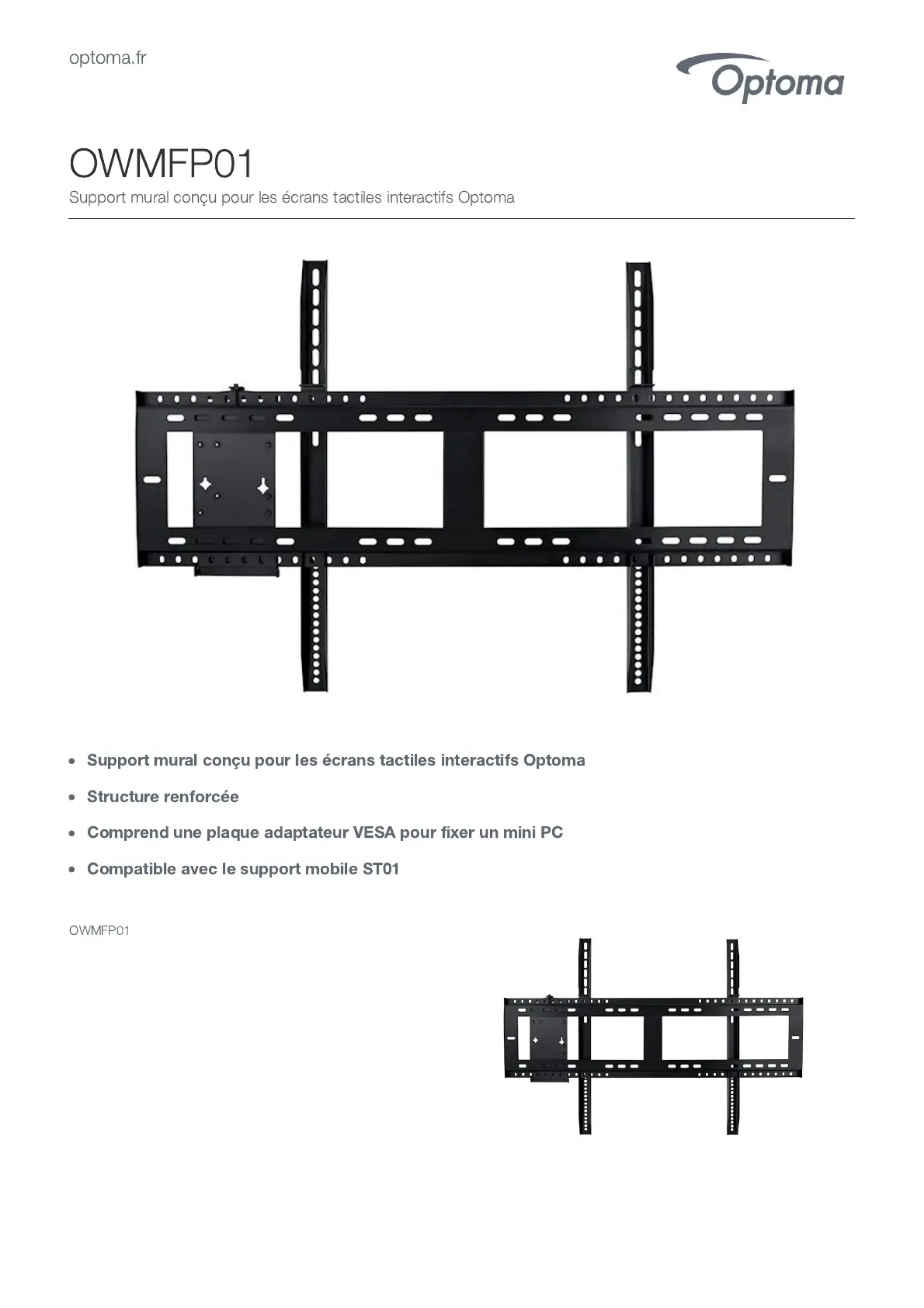 optoma.fr OWMFP01 Support mural conçu pour les écrans tactiles interactifs Optoma Support mural conçu pour les écrans tactiles interactifs Optoma Structure renforcée Comprend une plaque adaptateur VESA pour