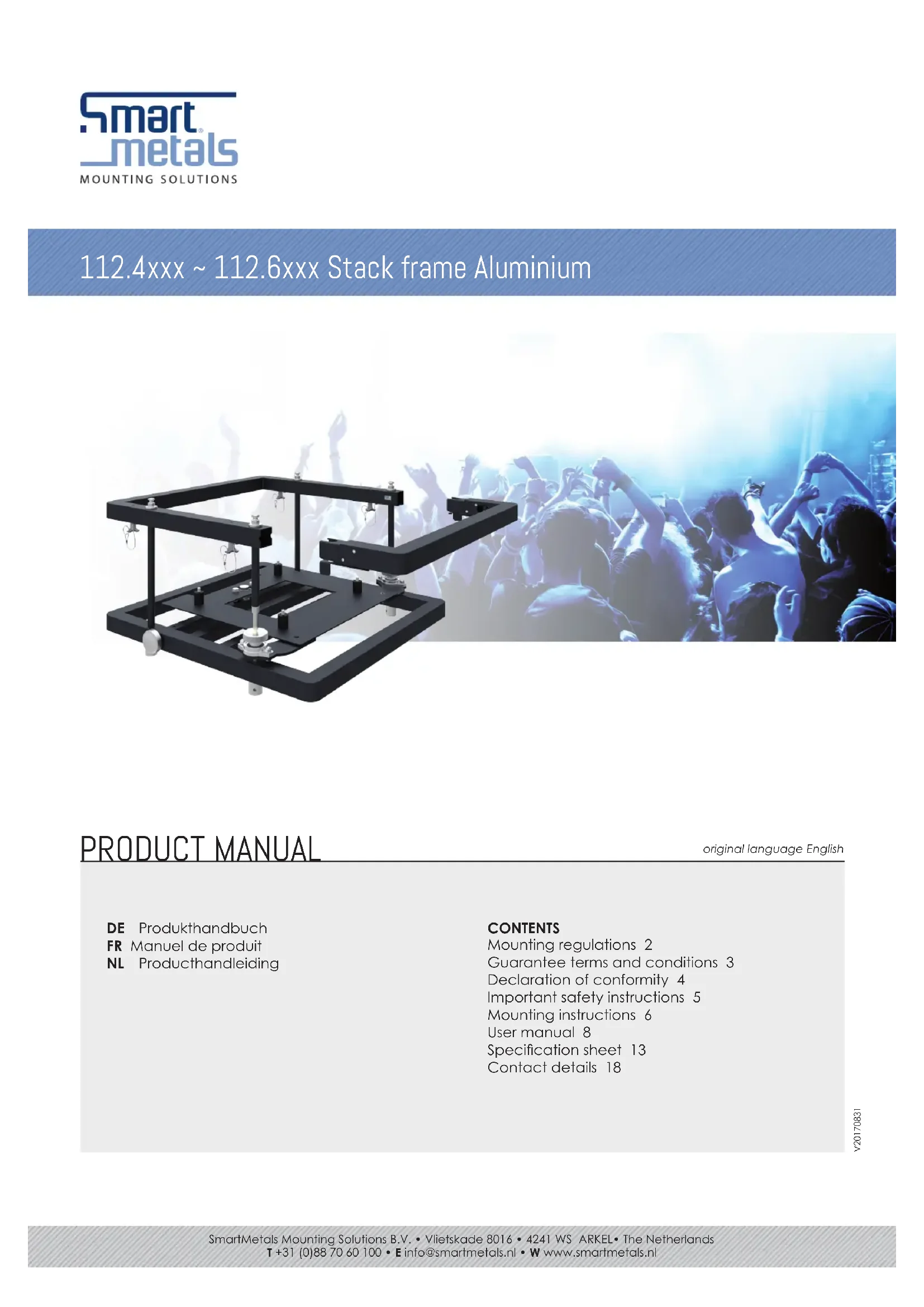 Montagevorschriften WARNUNG Le montage doit impérativement être effectué de façon correcte et ne relève pas de la responsabilité de SmartMetals Mounting Solutions. Un mauvais montage peut occasionner des blessures corporelles et des dommages matériels. SmartMetals décline toute responsabilité en cas de montage incorrect de ses produits. Pour des raisons de sécurité, aucun matériel de montage n’est livré avec les produits, car la nature et la capacité de soutien des murs/plafonds varient. Le matériel de montage est choisi en fonction de la composition du mur/plafond. Pour vous aider à choisir le bon matériel, consultez un expert dans ce domaine ou un magasin spécialisé. Il est de la responsabilité de l’installateur de veiller à ce que le mur/plafond puisse supporter au moins quatre fois le poids total de l’écran/ vidéo-projecteur et de son support. Charge max. pour ce produit, d’après l’information dans ce guide d’installation. Lors du montage, les instructions d’installation et d’utilisation de l’écran/vidéo-projecteur doivent elles aussi être suivies.