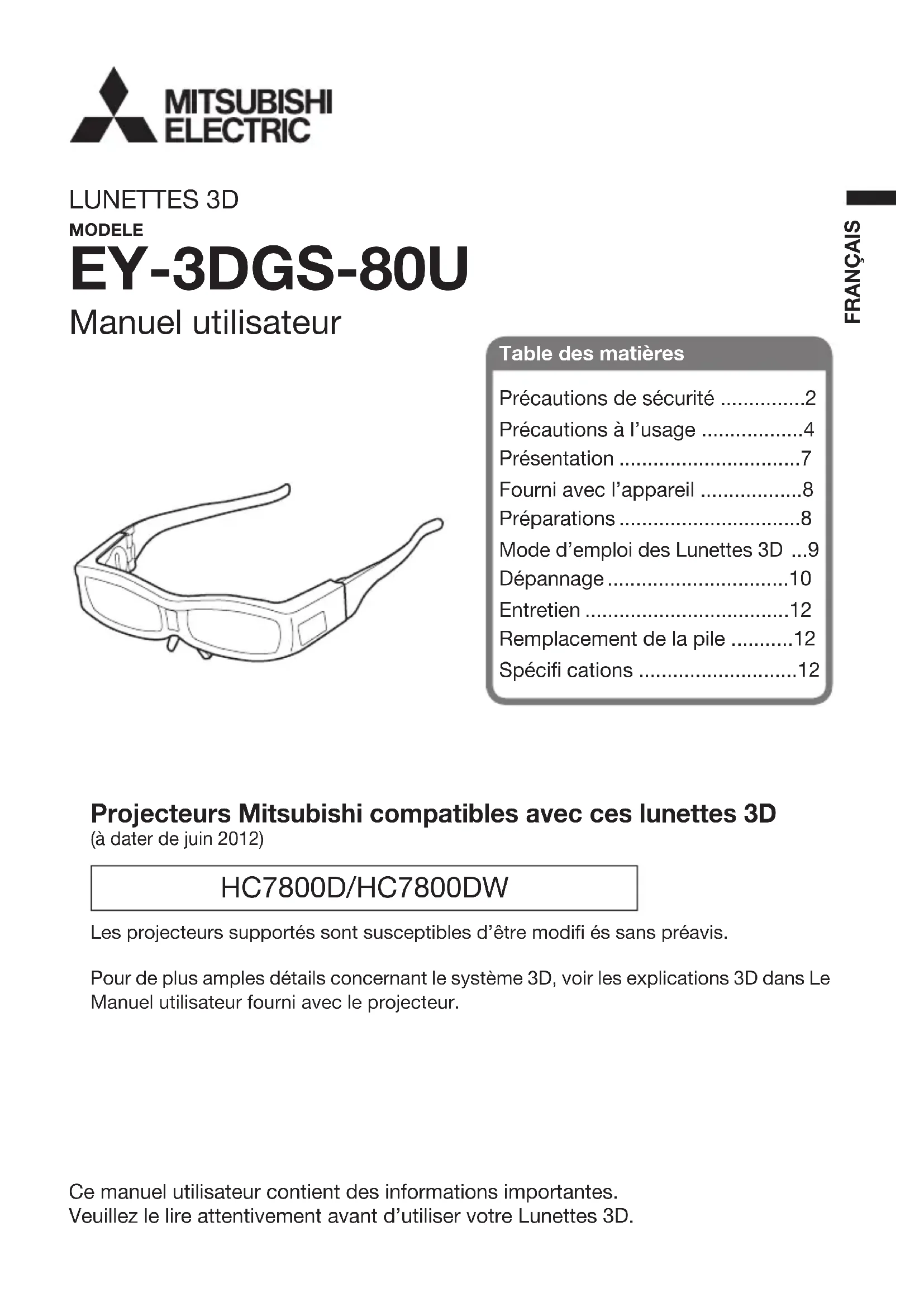 EY3DGS80U - Lunettes 3D MITSUBISHI - Notice d'utilisation et mode d'emploi gratuit