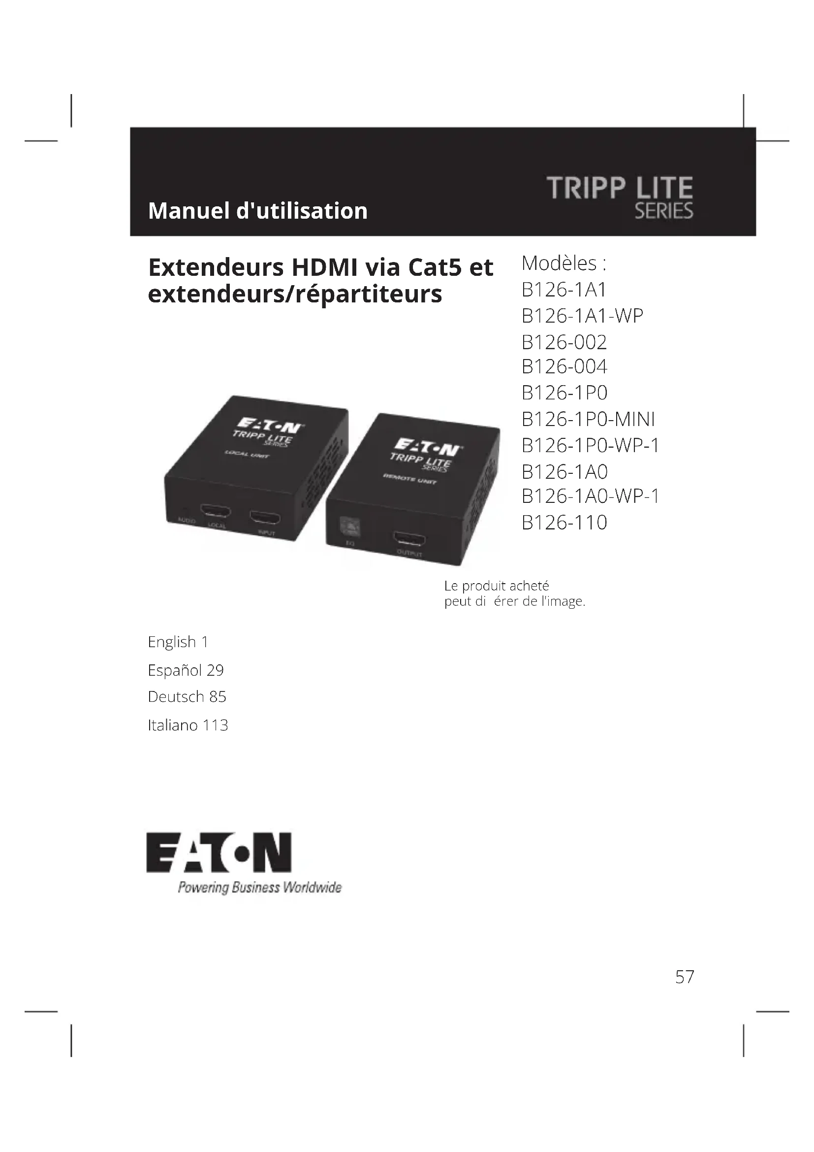 Assurez-vous que la source HDMI est hors tension. Connectez la source HDMI au port INPUT de l'unité locale B126-1A1 ou B126-1A1-WP à l'aide d'un cable HDMI série P568. 3 Facultatif pour le B126-1A1: connectez un moniteur local au port LOCAL de l'unité locale B126-1A1 à l'aide d'un cable HDMI série P568. Connectez l'alimentation électrique externe à l'unité locale et branchez-la à un parasurtenseur, à une unité de distribution d'énergie (PDU) ou à une alimentation sans interruption (onduleur). Le voyant vert s'allume pour indiquer que l'unité est alimentée par l'alimentation électrique externe. À l'aide d'un cable Cat5e/6, connectez le port RJ45 de l'unité locale au port RJ45 de l'unité distante. 6 Connectez l'alimentation électrique externe à l'unité distante et branchez-la à un parasurtenseur, à une unité de distribution d'énergie (PDU) ou à un onduleur. Le voyant vert s'allume pour indiquer que l'unité est alimentée par l'alimentation électrique externe. Le voyant orange s'allume pour indiquer que l'unité est connectée à une unité locale sous tension. Connectez le port HDMI de l'unité distante à un moniteur à l'aide d'un cable HDMI série P568. 8 Mettez la source HDMI sous tension. Le voyant orange de l'unité locale s'allume pour indiquer qu'un signal est reçu de la source. Si nécessaire, utilisez le contrôle d'égalisation sur l'unité distante pour régler l'image vidéo.