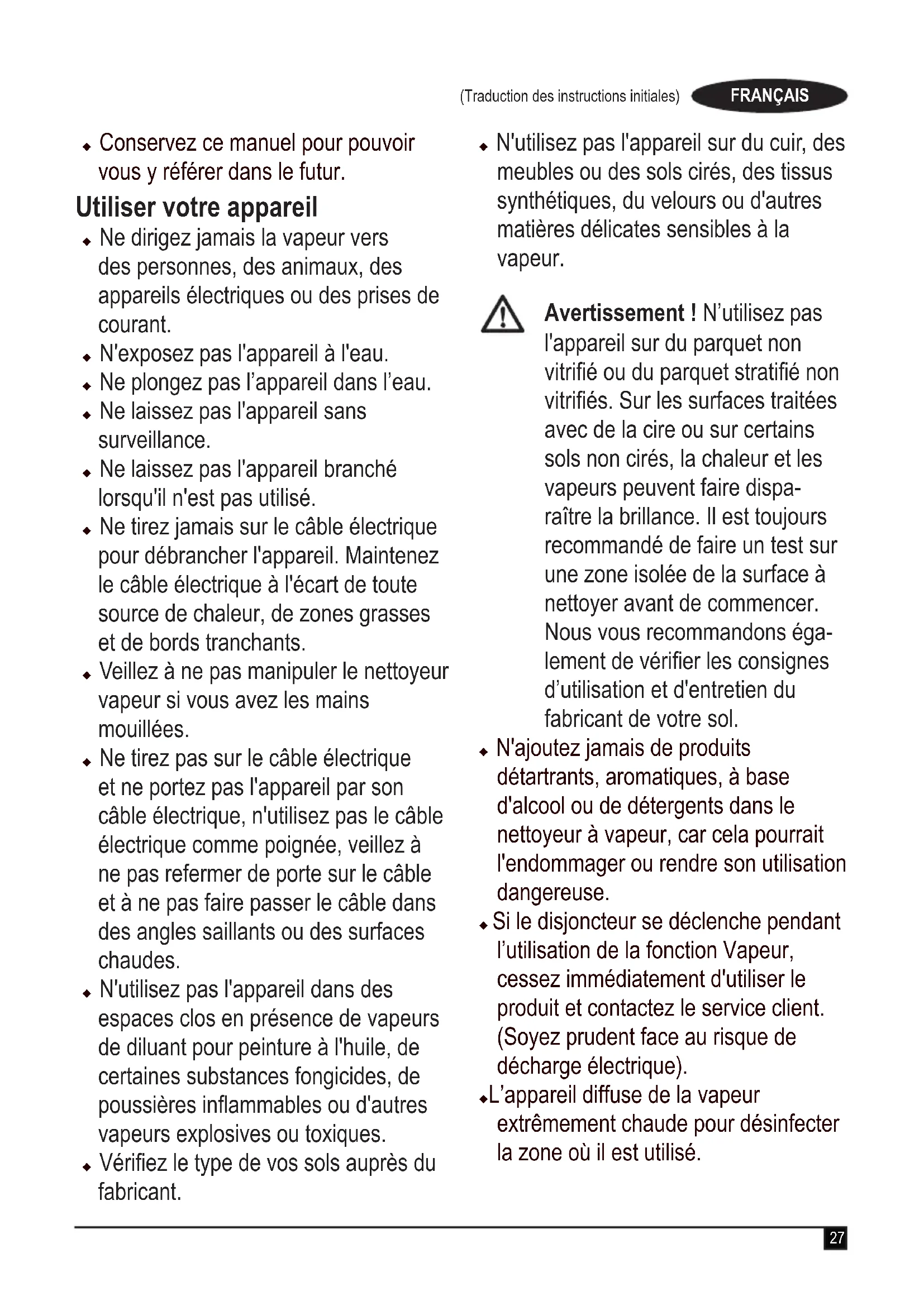 FSMH1321,BHSM166DSM, BHSM168D, BHSM168DSM, BHSM168U, BHSM169DSM, BHSM1610DSM, BHSM1615DSM, BHSM1615DSG, BHSM1615DAM a été conçu pour désinfecter et laver les parquetsenboisdurvitriés,lesparquetsstratiésvitriés, les sols en linoléum, en vinyle, en carrelage, en pierre et en marbre. Cet appareil est exclusivement destiné à une utilisationdomestique,àl’intérieur. Consignes de sécurité Avertissement ! Veillez à lire tous les avertissements sur la sécurité et toutes les instruc- tions. Le non-respect des aver- tissements et des instructions listés ci-dessous peut entraîner des décharges électriques, des incendies et/ou de graves blessures. Avertissement !L'utilisation d'appareilsalimentéssur secteur implique le respect de certaines précautions de sécu- rité élémentaires, dont celles quisuivent,anderéduireles risquesd'incendie,dedécharge électrique, de blessures et de dégâts matériels. u Cemanueldécritlamanièred’utiliser cet appareil. u L'utilisationd'unaccessoireou d'unéquipementautrequeceux recommandés dans ce manuel et l'utilisationdecetappareilàd'autres nsquecellesrecommandéesdansce manueld'utilisationpeuvententraîner un risque de blessures. Pegen der Bodentücher Pegehinweise - Die Tücher können bei 60°C gewaschen werden. Keinen Weichspüler verwenden. Vor der erneuten Verwendung vollständig trocknen lassen. Achtung!BefolgenSiediePegehinweiseaufdem Bodentuch. Austauschen des Netzsteckers (nur Großbritannien und Irland) Wenn ein neuer Netzstecker angebracht werden muss: u Entsorgen Sie den alten Stecker auf sachgerechte Weise.u Verbinden Sie die braune Leitung mit dem spannungsführenden Anschluss des Steckers. u Verbinden Sie die blaue Leitung mit dem neutralen Anschluss. u Verbinden Sie die grün/gelbe Leitung mit dem Masseanschluss. Warnung! Befolgen Sie die Montageanweisungen, die mit hochwertigen Steckern mitgeliefert werden. Empfohlene Sicherung: 13A. Umweltschutz Getrennte Entsorgung. Produkte und Akkus mit diesem Symbol dürfen nicht mit dem normalen Hausmüll entsorgt werden. Produkte und Akkus enthalten Materialien, die wiederverwertet werden können, um den Bedarf an Rohstoffen zu verringern. Bitte recyceln Sie elektrische Produkte und Akkus gemäß den örtlichen Bestimmungen. WeitereInformationenndenSieauf www.2helpU.com Garantie Black & Decker vertraut auf die Qualität der eigenen Geräte und bietet dem Käufer eine außergewöhnliche Garantie von 24 Monaten ab Kaufdatum. Diese Garantie versteht sich unbeschadet der gesetzlichen Gewährleistungsansprüche und schränkt diese keinesfalls ein. Diese Garantie gilt innerhalb der Staatsgebiete der Mitgliedstaaten der Europäischen Union und der Europäischen Freihandelszone. Zur Inanspruchnahme dieser Garantie muss sie den allgemeinen Geschäftsbedingungen von Black + Decker entsprechen und dem Verkäufer bzw. der Vertragswerkstatt ist ein Kaufnachweis vorzulegen. Die Bedingungen für die 2-jährige Garantie von Black&Decker und den Standort Ihrer nächstgelegenenVertragswerkstattndenSieimInternet unter www.2helpU.com oder indem Sie sich an die lokale Black&Decker-Niederlassung wenden, deren Adresse Sie in dieserAnleitungnden. Ihr neues Black & Decker Produkt können Sie auf unserer Website unter www.blackanddecker.de registrieren. Dort erhalten Sie auch Informationen über neue Produkte und Sonderangebote.27 (Traduction des instructions initiales) FRANÇAIS u Conservez ce manuel pour pouvoir vous y référer dans le futur. Utiliser votre appareil u Ne dirigez jamais la vapeur vers des personnes, des animaux, des appareils électriques ou des prises de courant. u N'exposezpasl'appareilàl'eau. u Neplongezpasl’appareildansl’eau. u Nelaissezpasl'appareilsans surveillance. u Nelaissezpasl'appareilbranché lorsqu'iln'estpasutilisé. u Ne tirez jamais sur le câble électrique pourdébrancherl'appareil.Maintenez lecâbleélectriqueàl'écartdetoute source de chaleur, de zones grasses et de bords tranchants. u Veillez à ne pas manipuler le nettoyeur vapeur si vous avez les mains mouillées. u Ne tirez pas sur le câble électrique etneportezpasl'appareilparson câbleélectrique,n'utilisezpaslecâble électrique comme poignée, veillez à ne pas refermer de porte sur le câble et à ne pas faire passer le câble dans des angles saillants ou des surfaces chaudes. u N'utilisezpasl'appareildansdes espaces clos en présence de vapeurs dediluantpourpeintureàl'huile,de certaines substances fongicides, de poussièresinammablesoud'autres vapeurs explosives ou toxiques. u Vériezletypedevossolsauprèsdu fabricant. u N'utilisezpasl'appareilsurducuir,des meubles ou des sols cirés, des tissus synthétiques,duveloursoud'autres matières délicates sensibles à la vapeur. Avertissement !N’utilisezpas l'appareilsurduparquetnon vitriéouduparquetstratiénon vitriés.Surlessurfacestraitées avec de la cire ou sur certains sols non cirés, la chaleur et les vapeurs peuvent faire dispa- raître la brillance. Il est toujours recommandé de faire un test sur une zone isolée de la surface à nettoyer avant de commencer. Nous vous recommandons éga- lementdevérierlesconsignes d’utilisationetd'entretiendu fabricant de votre sol. u N'ajoutezjamaisdeproduits détartrants, aromatiques, à base d'alcooloudedétergentsdansle nettoyeur à vapeur, car cela pourrait l'endommagerourendresonutilisation dangereuse. u Si le disjoncteur se déclenche pendant l’utilisationdelafonctionVapeur, cessezimmédiatementd'utiliserle produit et contactez le service client. (Soyez prudent face au risque de décharge électrique). uL’appareildiffusedelavapeur extrêmement chaude pour désinfecter la zone où il est utilisé.28 (Traduction des instructions initiales) FRANÇAIS Celasigniequelatêtequidiffuse lavapeur,leslavettesetl'accessoire pour tapis et moquette deviennent très chaudspendantl'utilisation. Attention ! Portez toujours des chaussures adaptées pour utiliser le balai vapeur ainsi que pour changer les acces