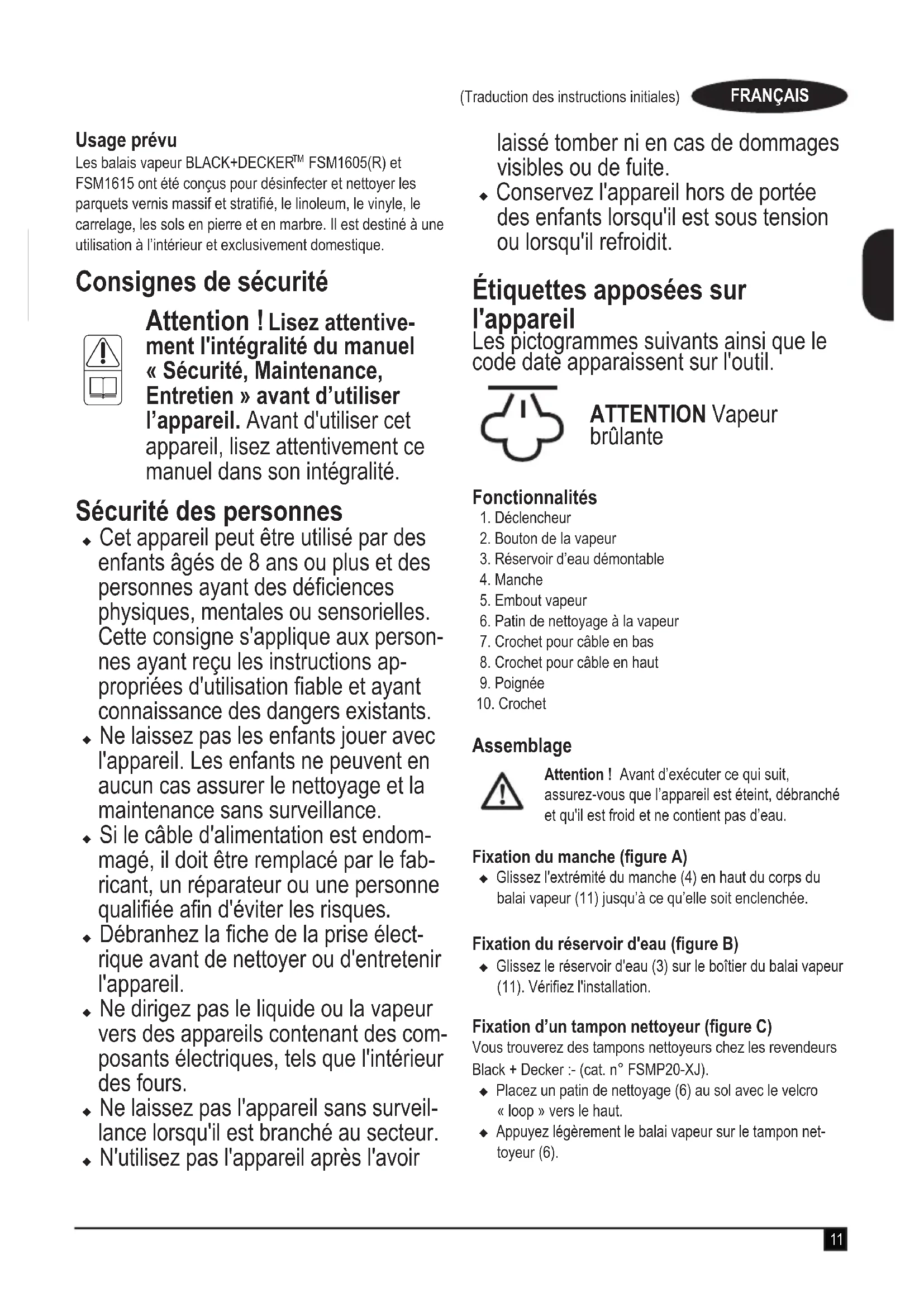 Attention ! Lisez attentive- ment l'intégralité du manuel « Sécurité, Maintenance, Entretien » avant d’utiliser l’appareil. Avant d'utiliser cet appareil, lisez attentivement ce manuel dans son intégralité. Sécurité des personnes u Cet appareil peut être utilisé par des enfants âgés de 8 ans ou plus et des personnes ayant des déciences physiques, mentales ou sensorielles. Cette consigne s'applique aux person- nes ayant reçu les instructions ap- propriées d'utilisation able et ayant connaissance des dangers existants. u Ne laissez pas les enfants jouer avec l'appareil. Les enfants ne peuvent en aucun cas assurer le nettoyage et la maintenance sans surveillance. u Si le câble d'alimentation est endom- magé, il doit être remplacé par le fab- ricant, un réparateur ou une personne qualiée an d'éviter les risques. u Débranhez la che de la prise élect- rique avant de nettoyer ou d'entretenir l'appareil. u Ne dirigez pas le liquide ou la vapeur vers des appareils contenant des com- posants électriques, tels que l'intérieur des fours. u Ne laissez pas l'appareil sans surveil- lance lorsqu'il est branché au secteur. u N'utilisez pas l'appareil après l'avoir laissé tomber ni en cas de dommages visibles ou de fuite. u Conservez l'appareil hors de portée des enfants lorsqu'il est sous tension ou lorsqu'il refroidit. Étiquettes apposées sur l'appareil Les pictogrammes suivants ainsi que le code date apparaissent sur l'outil. ATTENTION Vapeur brûlante Fonctionnalités 1. Déclencheur 2. Bouton de la vapeur 3. Réservoir d’eau démontable 4. Manche 5. Embout vapeur 6. Patin de nettoyage à la vapeur 7. Crochet pour câble en bas 8. Crochet pour câble en haut 9. Poignée 10. Crochet Assemblage Attention ! Avant d’exécuter ce qui suit, assurez-vous que l’appareil est éteint, débranché et qu'il est froid et ne contient pas d’eau. Fixation du manche (gure A) u Glissez l'extrémité du manche (4) en haut du corps du balai vapeur (11) jusqu’à ce qu’elle soit enclenchée. Fixation du réservoir d'eau (gure B) u Glissez le réservoir d'eau (3) sur le boîtier du balai vapeur (11). Vériez l'installation. Fixation d’un tampon nettoyeur (gure C) Vous trouverez des tampons nettoyeurs chez les revendeurs Black + Decker :- (cat. n° FSMP20-XJ).u Placez un patin de nettoyage (6) au sol avec le velcro « loop » vers le haut. u Appuyez légèrement le balai vapeur sur le tampon net- toyeur (6).12 (Traduction des instructions initiales) FRANÇAIS Attention : À l’arrêt, placez toujours le balai vapeur avec le manche (4) maintenu en position verticale et assurez-vous qu’il est éteint quand il n’est pas utilisé. Retrait d'un patin nettoyeur Attention ! Portez toujours des chaussures adaptées pour changer le tampon nettoyeur du balai vapeur. Ne portez pas de chaussons ou de sandalettes. u Placez le manche (4) en position verticale et éteignez le balai vapeur. u Attendez que le balai vapeur refroidisse (environ cinq minutes). u Soulevez le balai vapeur pour retirer le patin nettoyeur en détachant la xation velcro. Attention ! À l’arrêt, placez toujours le balai vapeur avec le manche (4) maintenu en position verticale et assurez-vous qu’il est éteint quand il n’est pas utilisé. Remplissage du réservoir d’eau (gure D) Le réservoir d'eau sur le balai vapeur peut être retiré pour faciliter le remplissage. Remarque ! Remplissez le réservoir avec de l’eau du robinet. Remarque ! Dans les zones où l’eau est très calcaire, l’utilisation d’eau distillée est recommandée. u Retirez le réservoir d’eau (3). u Retirez le couvercle de remplissage en le dévissant dans le sens contraire des aiguilles d'une montre. u Remplissez le réservoir d'eau (3) avec de l’eau. Attention ! La capacité du réservoir d'eau est de 350 ml. Ne remplissez pas trop le réservoir. u Remettez le couvercle de remplissage en le vissant dans le sens des aiguilles d'une montre. u Réinstallez le réservoir d’eau (3). Remarque ! Vériez l'installation du couvercle de remplis- sage. Remarque ! N'utilisez pas de nettoyants chimiques avec le réservoir d'eau du balai vapeur. Utilisation Important ! Cet appareil détruit 99.9 % des bactéries et ger- mes pour autant qu'il soit utilisé conformément aux consignes décrites dans le présent manuel, avec un ltre en microbre et en fonctionnement continu pendant 90 secondes. Mise en marche et arrêt u Pour mettre l’appareil en marche, appuyez sur le bouton marche/arrêt (1). Le balai vapeur prend environ 15 sec- ondes pour chauffer. u Appuyez sur le bouton de la vapeur (2). Celui-ci action- nera la pompe et l'appareil se mettra à produire de la vapeur. u Pour arrêter la production de vapeur, mettez le bouton de la vapeur (2) en position arrêt. La résistance sera ainsi maintenue sous tension et le redémarrage sera plus rapide. u Pour éteindre l’appareil, appuyez sur le bouton marche/ arrêt (1). Attention ! Ne laissez jamais longtemps le balai vapeur au même endroit. À l’arrêt, placez toujours le balai vapeur avec le manche (4) maintenu en position verticale et assurez-vous qu’il est éteint quand il n’est pas utilisé. Attention ! Videz toujours le balai vapeur après l’utilisation. Remarque ! Au premier remplissage ou après une utilisa- tion à sec, la production de vapeur peut prendre jusqu'à 45 minutes. Conseils pour une utilisation optimale Généralités Attention : N’utilisez jamais le balai vapeur sans avoir d’abord xé un patin de nettoyage. u Aspirez toujours ou balayez le sol avant d’utiliser le balai vapeur. u Le moyen le plus simple d’utiliser l’appareil est d’incliner le manche de 45º et de nettoyer lentement par petites zones. u N'utilisez pas de nettoyants chimiques avec le balai va- peur. Pour éliminer les taches qui résistent sur des sols en vinyle ou en lino, vous pouvez prétraiter avec un mélange détergent doux et eau avant d’utiliser le balai vapeur. Netto