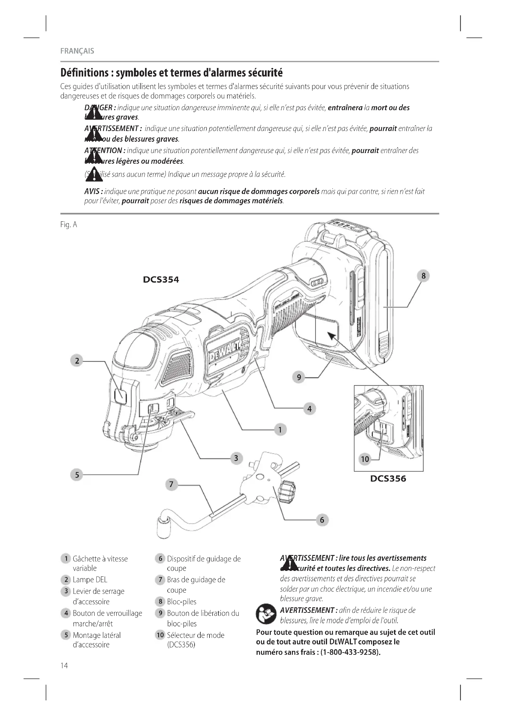 blessures, lire le mode d’emploi del’outil. Pour toute question ou remarque au sujet de cet outil ou de tout autre outil DeWALT composez le numéro sans frais : (1-800-433-9258).