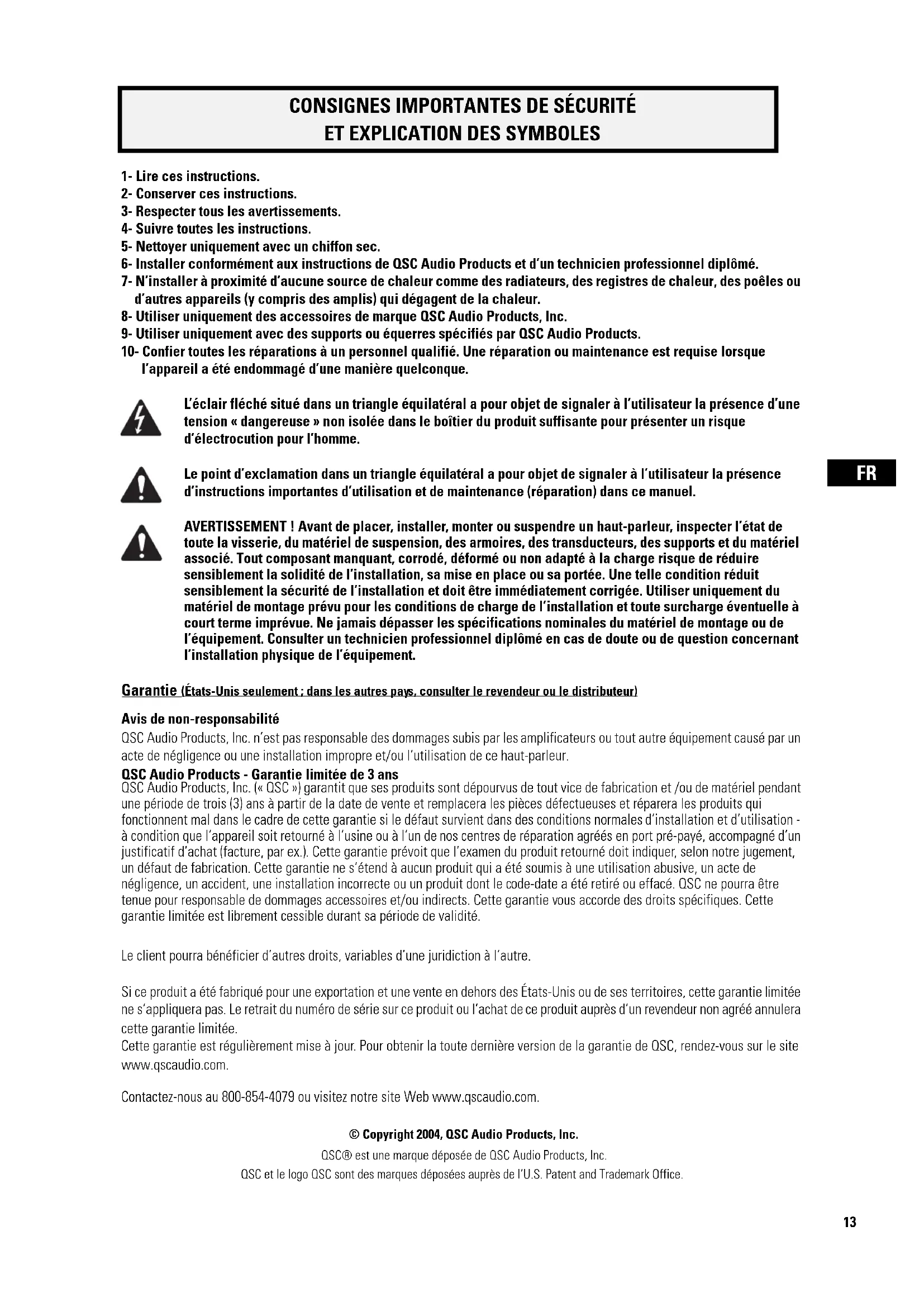 l’appareil a été endommagé d’une manière quelconque. L’éclair fléché situé dans un triangle équilatéral a pour objet de signaler à l’utilisateur la présence d’une tension « dangereuse » non isolée dans le boîtier du produit suffisante pour présenter un risque d’électrocution pour l’homme. Le point d’exclamation dans un triangle équilatéral a pour objet de signaler à l’utilisateur la présence d’instructions importantes d’utilisation et de maintenance (réparation) dans ce manuel. AVERTISSEMENT ! Avant de placer, installer, monter ou suspendre un haut-parleur, inspecter l’état de toute la visserie, du matériel de suspension, des armoires, des transducteurs, des supports et du matériel associé. Tout composant manquant, corrodé, déformé ou non adapté à la charge risque de réduire sensiblement la solidité de l’installation, sa mise en place ou sa portée. Une telle condition réduit sensiblement la sécurité de l’installation et doit être immédiatement corrigée. Utiliser uniquement du matériel de montage prévu pour les conditions de charge de l’installation et toute surcharge éventuelle à court terme imprévue. Ne jamais dépasser les spécifications nominales du matériel de montage ou de l’équipement. Consulter un technicien professionnel diplômé en cas de doute ou de question concernant l’installation physique de l’équipement. Garantie (États-Unis seulement ; dans les autres pays, consulter le revendeur ou le distributeur) Avis de non-responsabilité QSC Audio Products, Inc. n’est pas responsable des dommages subis par les amplificateurs ou tout autre équipement causé par un acte de négligence ou une installation impropre et/ou l’utilisation de ce haut-parleur. QSC Audio Products - Garantie limitée de 3 ans QSC Audio Products, Inc. (« QSC ») garantit que ses produits sont dépourvus de tout vice de fabrication et /ou de matériel pendant une période de trois (3) ans à partir de la date de vente et remplacera les pièces défectueuses et réparera les produits qui fonctionnent mal dans le cadre de cette garantie si le défaut survient dans des conditions normales d’installation et d’utilisation - à condition que l’appareil soit retourné à l’usine ou à l’un de nos centres de réparation agréés en port pré-payé, accompagné d’un justificatif d’achat (facture, par ex.). Cette garantie prévoit que l’examen du produit retourné doit indiquer, selon notre jugement, un défaut de fabrication. Cette garantie ne s’étend à aucun produit qui a été soumis à une utilisation abusive, un acte de négligence, un accident, une installation incorrecte ou un produit dont le code-date a été retiré ou effacé. QSC ne pourra être tenue pour responsable de dommages accessoires et/ou indirects. Cette garantie vous accorde des droits spécifiques. Cette garantie limitée est librement cessible durant sa période de validité. Le client pourra bénéficier d’autres droits, variables d’une juridiction à l’autre. Si ce produit a été fabriqué pour une exportation et une vente en dehors des États-Unis ou de ses territoires, cette garantie limitée ne s’appliquera pas. Le retrait du numéro de série sur ce produit ou l’achat de ce produit auprès d’un revendeur non agréé annulera cette garantie limitée. Cette garantie est régulièrement mise à jour. Pour obtenir la toute dernière version de la garantie de QSC, rendez-vous sur le site www.qscaudio.com. Contactez-nous au 800-854-4079 ou visitez notre site Web www.qscaudio.com. © Copyright 2004, QSC Audio Products, Inc. QSC® est une marque déposée de QSC Audio Products, Inc. QSC et le logo QSC sont des marques déposées auprès de l’U.S. Patent and Trademark Office.FR