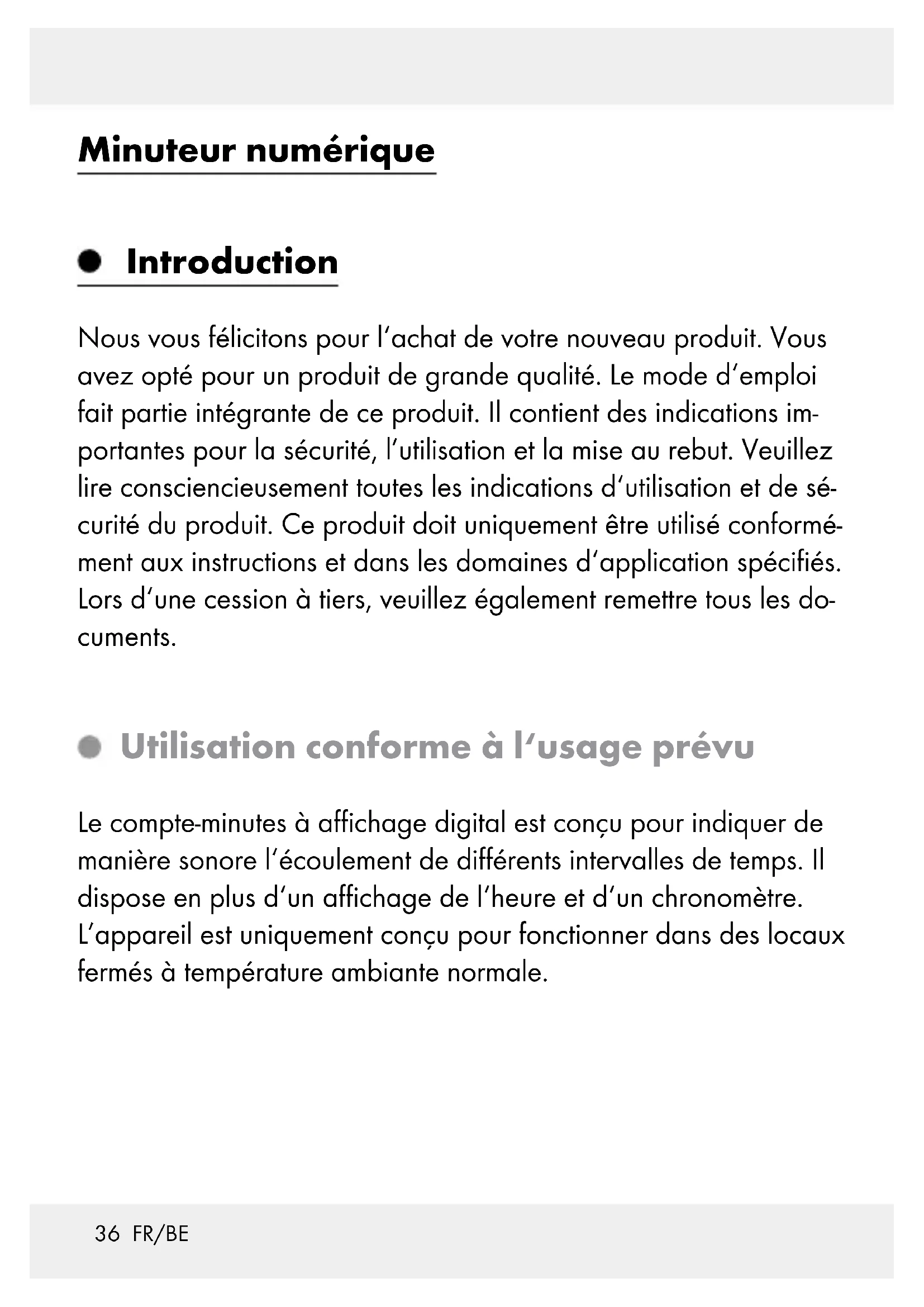 Contenu de la livraison 1 compte-minutes digital 2 piles, de type LR44 (déjà insérées) 1 mode d‘emploi Instructions générales de sécurité Prenez connaissance de toutes les indications de maniement et de sécurité avant d’utiliser l’appareil pour la première fois ! Remettez également tous ces documents en cas de transmission du produit à une personne tierce ! Avant la mise en service, vérifiez si le pro- duit présente des dommages ! Ne mettez pas un appareil endommagé en service!39 FR/BE N‘exposez l‘appareil à aucune humidité ! Cela risque de l‘endommager. Cet appareil peut être utilisé par les en- fants de 8 ans et plus ainsi que par des personnes ayant des capacités physiques, psychiques ou sensorielles limitées ou man- quant d‘expérience ou de connaissances, s‘ils sont surveillés ou s‘ils ont été informés de l‘utilisation de l‘appareil de manière sûre et comprennent les risques découlant de son utilisation. Les enfants ne doivent pas jouer avec cet appareil. Le nettoyage et la maintenance domestique de l’appareil ne doivent pas être effectués par un enfant sans surveillance.40 FR/BE Consignes de sécurité sur l‘usage des piles DANGER DE MORT ! Les piles ne doivent pas être ma- nipulées par des enfants. En cas d’ingestion, consultez immédiatement un médecin ! DANGER D’EXPLOSION ! Ne rechargez jamais les piles à usage unique, ni ne les courtcircuitez et / ou ne les ouvrez! Ne jetez jamais les piles au feu ou dans l‘eau ! Ne soumettez pas les piles à une charge mécanique ! Danger de fuite des piles En cas de fuite des piles, retirez-les aussitôt de l‘appareil pour éviter tout endommage- ment !41 FR/BE Évitez tout contact avec la peau, les yeux et les muqueuses ! En cas de contact avec l’acide d’une pile, rincez la zone touchée avec de l’eau claire et contactez immédia- tement un médecin ! Utilisez uniquement des piles du même type ! Ne mélangez pas des piles usées et des piles neuves ! Évitez les conditions et les températures ex- trêmes pouvant avoir un effet sur les piles, par ex. les radiateurs ! Les piles inutilisées pendant une période prolongée doivent être retirées de l’appa- reil ! Danger d’endommagement de l’appareil Utilisez exclusivement le type de pile indiqué !42 FR/BE Lors de la mise en place des piles, veillez à respecter la polarité ! Celle-ci est indiquée sur le compartiment à piles ! Si nécessaire, nettoyez les contacts des piles et de l’appareil avant de les mettre en place ! Retirez immédiatement les piles usagées de l‘appareil !