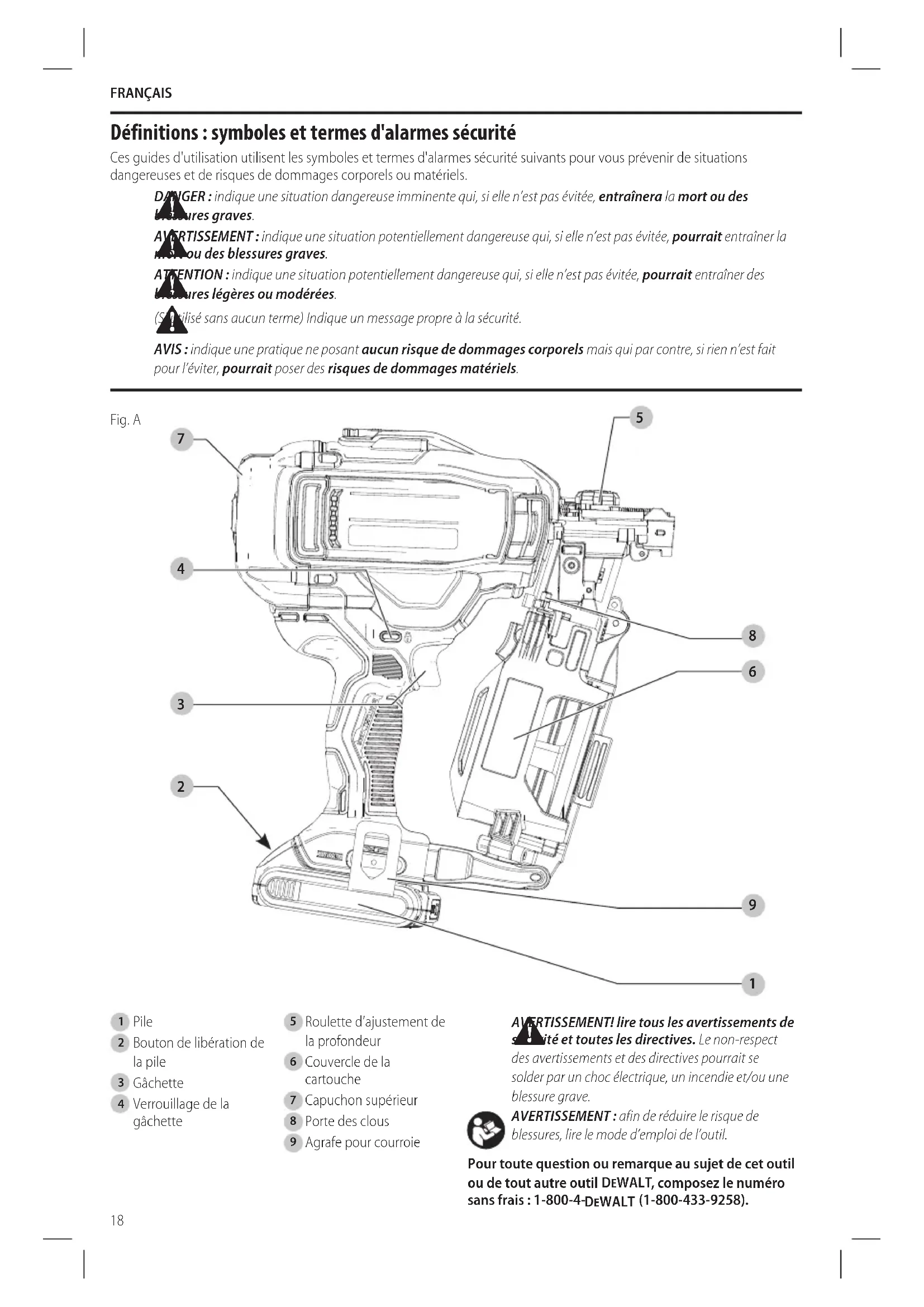 blessures, lire le mode d’emploi del’outil. Pour toute question ou remarque au sujet de cet outil ou de tout autre outil DeWALT , composez le numéro sans frais : 1-800-4- DeWALT (1-800-433-9258).