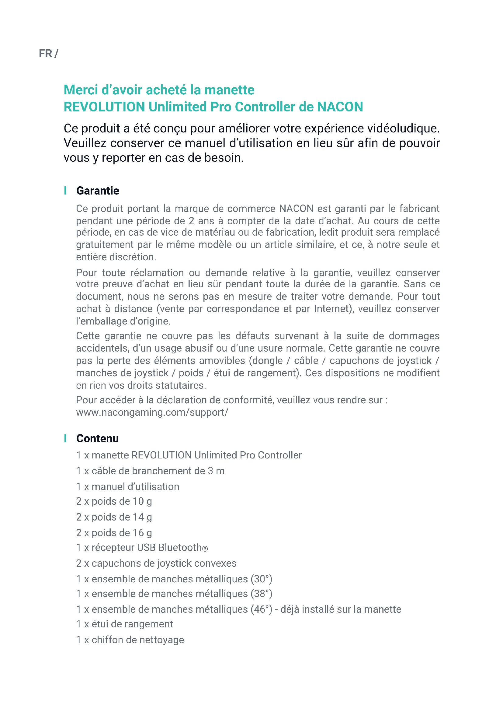 Recycling This product should not be disposed of in normal household rubbish. Please take it to a nominated collection point. Recycling is important and will help to protect our environment from reduced landfill waste. EU and Turkey only. I Important Safeguards & Precautions 1/ This controller is for indoor use only. Never expose to direct sunlight or wet weather conditions. 2/ Do not expose the controller to splashing, dripping, rain or moisture. Do not immerse in liquid. 3/ Do not expose to dust, high humidity, high temperatures or mechanical shock. 4/ Do not use if the equipment is damaged. 5/ For external cleaning, use a soft, clean, damp cloth only. Use of detergents may damage the finish and leak inside. 6/ Never carry the product by its cable. 7/ This device is not designed to be used by anyone (including children) with impaired physical, sensory or mental capacity, or by anyone without appropriate experience or knowledge unless they have received prior guidance or instructions related to the use of this device from someone who is responsible for their safety. Do not leave the REVOLUTION Unlimited Pro Controller unattended, keep this device out of the reach of children. I Ergonomics Holding your hand in the same position for a long period of time can lead to aching and pain. If this occurs repeatedly please consult your doctor. As a preventive measure, we recommend that you take a 15-minute break every hour. I Technical Helpline Information Email: support@nacongaming.com Website: www.nacongaming.comFR / Merci d’avoir acheté la manette REVOLUTION Unlimited Pro Controller de NACON Ce produit a été conçu pour améliorer votre expérience vidéoludique. Veuillez conserver ce manuel d’utilisation en lieu sûr afin de pouvoir vous y reporter en cas de besoin. I Garantie Ce produit portant la marque de commerce NACON est garanti par le fabricant pendant une période de 2 ans à compter de la date d’achat. Au cours de cette période, en cas de vice de matériau ou de fabrication, ledit produit sera remplacé gratuitement par le même modèle ou un article similaire, et ce, à notre seule et entière discrétion. Pour toute réclamation ou demande relative à la garantie, veuillez conserver votre preuve d’achat en lieu sûr pendant toute la durée de la garantie. Sans ce document, nous ne serons pas en mesure de traiter votre demande. Pour tout achat à distance (vente par correspondance et par Internet), veuillez conserver l’emballage d’origine. Cette garantie ne couvre pas les défauts survenant à la suite de dommages accidentels, d’un usage abusif ou d’une usure normale. Cette garantie ne couvre pas la perte des éléments amovibles (dongle / câble / capuchons de joystick / manches de joystick / poids / étui de rangement). Ces dispositions ne modifient en rien vos droits statutaires. Pour accéder à la déclaration de conformité, veuillez vous rendre sur : www.nacongaming.com/support/ I Contenu 1 x manette REVOLUTION Unlimited Pro Controller 1 x câble de branchement de 3 m 1 x manuel d’utilisation 2 x poids de 10 g 2 x poids de 14 g 2 x poids de 16 g 1 x récepteur USB Bluetooth