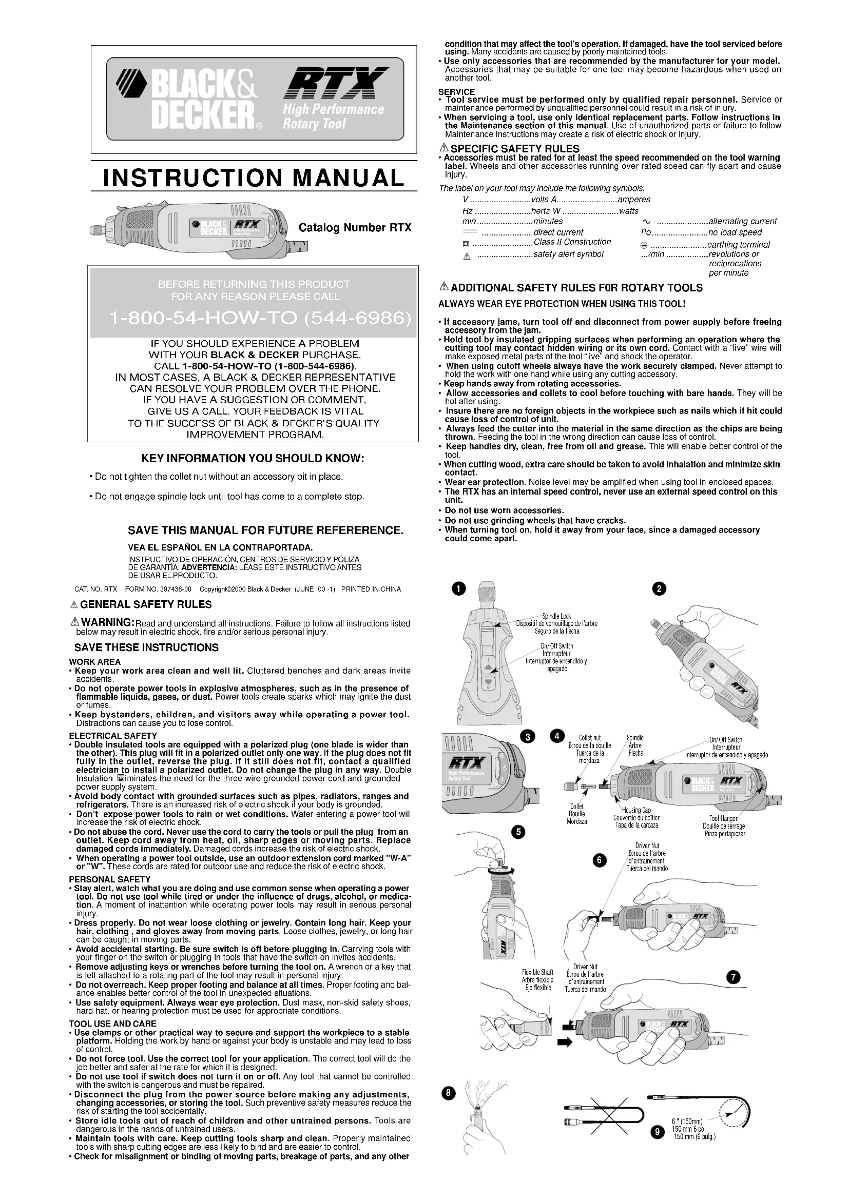 suspension (fig. 4) est fourni pour permettre d’immobiliser l’outil lorsqu’on utilise un arbre flexible et pour empêcher les courbures trop prononcées de se former. REMARQUE: il peut arriver que le noyau central rotatif sorte de l’arbre flexible; si tel est le cas, on n’a qu’à le réinsérer. Au besoin, nettoyer le noyau en l’essuyant au moyen d’un linge et y appliquer une fine pellicule de graisse haute température. Il se peut que le dispositif d’entraînement carré du noyau central ne bloque pas la pièce à main; si cela se produit, appliquer une légère pression sur l’extrémité du noyau tout en tournant l’écrou de la douille de serrage de la pièce à main. ENTRETIEN Nettoyer l’outil au moyen d’un savon doux et d’un linge humide seulement. Ne jamais laisser de liquide s’infiltrer à l’intérieur de l’outil ni tremper ce dernier dans un liquide quelconque. IMPORTANT: pour assurer la SÉCURITÉ et la FIABILITÉ de cet outil, toutes les opérations de réparation, d’entretien et de réglage (autres que celles décrites aux présentes) doivent être effectuées par un centre de service autorisé ou qualifié; seules des pièces de rechange identiques doivent être utilisées. L’outil ne comprend aucune pièce interne destinée à être entretenue par l’utilisateur. ACCESSOIRES Black & Decker offre une vaste sélection d’accessoires vendus séparément chez les dépositaires locaux ou les centres de service autorisés. On ne doit utiliser que les accessoires Black & Decker recommandés pour le modèle RTX ou l’arbre flexible. Pour obtenir de l’aide concernant l’achat d’un accessoire, composer le 1 800 544-6986. MISE EN GARDE : n’utiliser que les accessoires ayant une vitesse de rotation de 30 000 t / min ou plus, à l’exception de ce qui suit: ne pas utiliser de brosse en métal ou en soie, de ponceuse avec dôme au diamant ni de meule au diamant de 3,18 cm (1-1/4 po) à des vitesses supérieures à 15 0000 t / min. (réglage no 2). Ne jamais dépasser la vitesse recommandée pour l’accessoire utilisé.