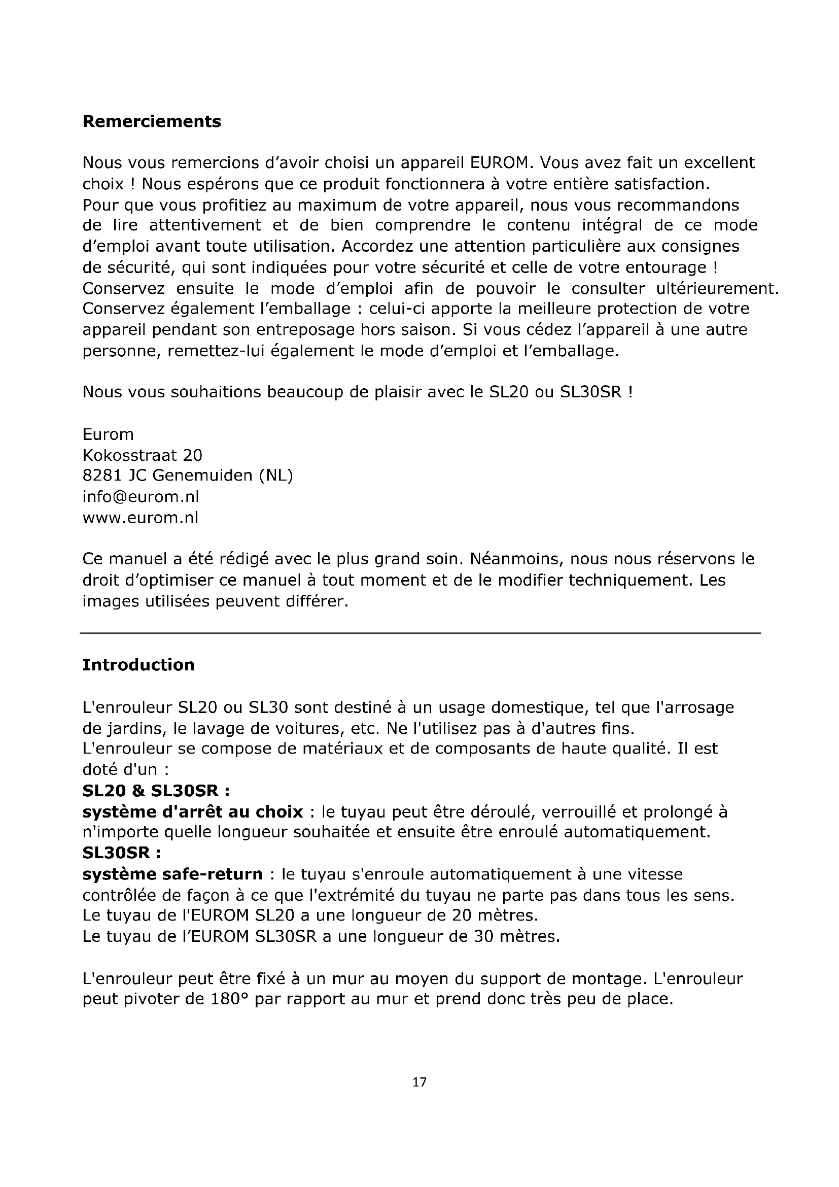 Introduction L'enrouleur SL20 ou SL30 sont destiné à un usage domestique, tel que l'arrosage de jardins, le lavage de voitures, etc. Ne l'utilisez pas à d'autres fins. L'enrouleur se compose de matériaux et de composants de haute qualité. Il est doté d'un : SL20 & SL30SR : système d'arrêt au choix : le tuyau peut être déroulé, verrouillé et prolongé à n'importe quelle longueur souhaitée et ensuite être enroulé automatiquement. SL30SR : système safe-return : le tuyau s'enroule automatiquement à une vitesse contrôlée de façon à ce que l'extrémité du tuyau ne parte pas dans tous les sens. Le tuyau de l'EUROM SL20 a une longueur de 20 mètres. Le tuyau de l’EUROM SL30SR a une longueur de 30 mètres. L'enrouleur peut être fixé à un mur au moyen du support de montage. L'enrouleur peut pivoter de 180° par rapport au mur et prend donc très peu de place.18 Caractéristiques techniques Modele SL20 SL30SR Longueur tuyau 20 m 30 m Matériau tuyau PVC PVC Matériau logement