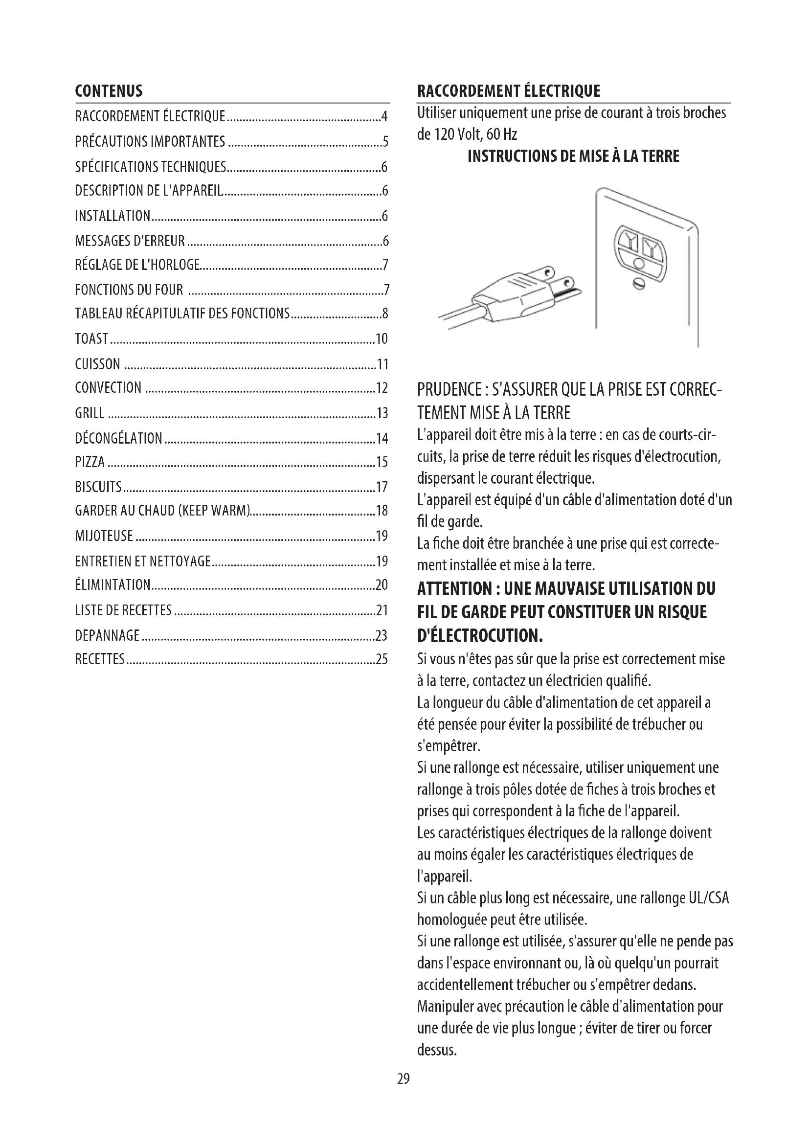 FIL DE GARDE PEUT CONSTITUER UN RISQUE D'ÉLECTROCUTION. Si vous n'êtes pas sûr que la prise est correctement mise à la terre, contactez un électricien qualié. La longueur du câble d'alimentation de cet appareil a été pensée pour éviter la possibilité de trébucher ou s'empêtrer. Si une rallonge est nécessaire, utiliser uniquement une rallonge à trois pôles dotée de ches à trois broches et prises qui correspondent à la che de l'appareil. Les caractéristiques électriques de la rallonge doivent au moins égaler les caractéristiques électriques de l'appareil. Si un câble plus long est nécessaire, une rallonge UL/CSA homologuée peut être utilisée. Si une rallonge est utilisée, s'assurer qu'elle ne pende pas dans l'espace environnant ou, là où quelqu'un pourrait accidentellement trébucher ou s'empêtrer dedans. Manipuler avec précaution le câble d'alimentation pour une durée de vie plus longue ; éviter de tirer ou forcer dessus.30