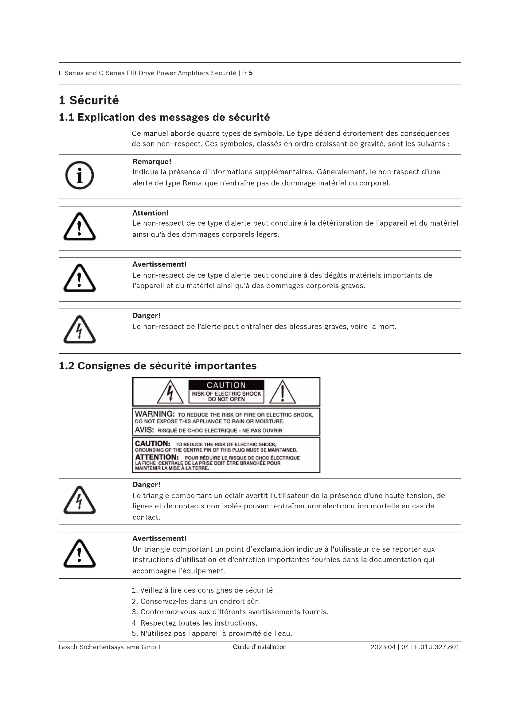 de sécurité spécifiées dans la norme EN 60065 (VDE0860).L Series and C Series FIR-Drive Power Amplifiers Sécurité | fr 7 Bosch Sicherheitssysteme GmbH Guide d'installation 2023-04 | 04 | F.01U.327.801