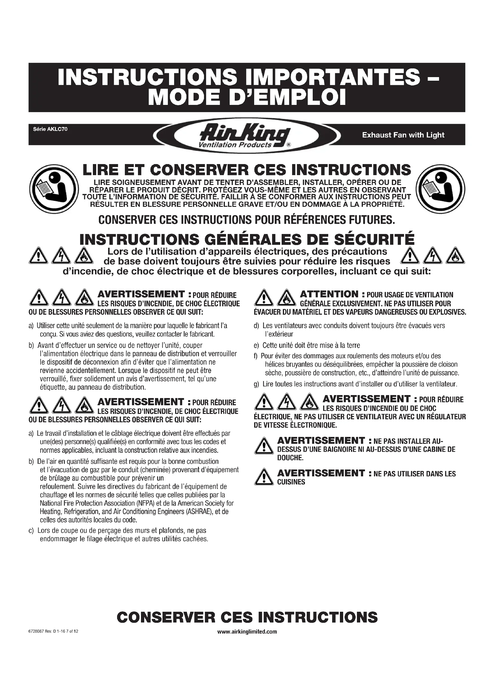 QUE COUVRE CETTE GARANTIE : Ce produit est garanti contre tout vice de fabrication ou de matière. COMBIEN DE TEMPS CETTE GARANTIE DURE : Cette garantie se rapporte seulement à l’acheteur original du produit et dure pendant un (1) an de la date de l’achat original ou jusqu’à ce que l’acheteur original du produit vend ou transfère le produit, celui qui se produit en premier. QUE FERA AIR KING : Au cours de la période de garantie, Air King, à son choix, réparera ou remplacera n’importe quelle partie ou pièces qui s’avèrent défectueuses ou remplacera le produit entier par le même modèle ou un modèle comparable. CE QUE CETTE GARANTIE NE COUVRE PAS : Cette garantie ne s’applique pas si le produit était endommagé ou arrête de fonctionner en raison d’un accident, d’une mauvaise manipulation ou opération, de dommages d’expédition, d’abus, de mauvaise utilisation, de réparation faite ou tentées non autorisées. Cette garantie ne couvre pas les coûts d’expédition pour le retour des produits à Air King pour la réparation ou le remplacement. Air King payera les frais d’expédition de retour de Air King après les réparations ou le remplacement de garantie. TOUTES LES GARANTIES, EXPRESSES OU TACITES (COMPRENANT, SANS LIMITATION, TOUTE GARANTIE TACITE DE VALEUR MARCHANDE), DURENT UN AN DE LA DATE DE L’ACHAT ORIGINAL OU JUSQU’À CE QUE L’ACHETEUR ORIGINAL DU PRODUIT VEND OU TRANSFÈRE LE PRODUIT, CELUI QUI SE PRODUIT EN PREMIER ET DANS AUCUN CAS AIR KING N’ASSUME AUCUNE RESPONSABILITÉ EXPRESSE OU TACITE POUR (I) DES DOMMAGES ACCIDENTELS OU INDIRECTS DE N’IMPORTE QUELLE CAUSE, OU (II) LE REPLACEMENT OU LA RÉPARATION DE TOUS FUSIBLES, DISJONCTEURS OU RÉCEPTACLES DE MAISON. MALGRÉ N’IMPORTE QUOI À L’EFFET CONTRAIRE, DANS AUCUN CAS LA RESPONSABILITÉ D’AIR KING, SOUS UNE GARANTIE EXPRESSE OU TACITE, NE DÉPASSERA LE PRIX D’ACHAT DU PRODUIT ET UNE TELLE RESPONSABILITÉ SE TERMINERA AVEC L’EXPIRATION DE LA PÉRIODE DE GARANTIE. Certains états et provinces ne permettent pas les limitations de la période de garantie, ou l’exclusion ou la restriction des dommages accidentels ou indirects, et, par conséquent, les présentes restrictions ne peuvent pas s’appliquer. La présente garantie vous donne des droits légaux spécifiques et peut-être certains autres droits qui peuvent varier selon la province. La preuve d’achat est exigée avant qu’une réclamation de garantie ne soit acceptée. SERVICE À LA CLIENTÈLE : Sans frais (800) 465-7300 Notre équipe de service à la clientèle est disponible pour vous aider avec des questions sur le produit, les adresses des centres de service, et les pièces de rechange. Vous pouvez la rejoindre, du lundi au vendredi, de 8h:00 à 16h:00 HNE. Veuillez avoir le numéro du modèle disponible, ainsi que le genre et le style (qui se trouvent sur l’étiquette à l’intérieur de votre produit). Veuillez ne pas renvoyer le produit à l’endroit de l’achat. www.airkinglimited.com IL SE PEUT QUE LES PIÈCES POUR LES PRODUITS DISCONTINUÉS, OBSOLÈTES ET AUTRES PRODUITS NE SOIENT PAS DISPONIBLES. POUR DES RAISONS DE SÛRETÉ, BEAUCOUP DE COMPOSANTS ÉLECTRONIQUES ET LA PLUPART DES COMPOSANTS DES CHAUFFAGES NE SONT PAS À LA DISPOSITION DES CONSOMMATEURS POUR L’INSTALLATION OU LE REMPLACEMENT. Installateur : Date d’installation : Endroit de l’achat : Numéro de modèle : Guide de dépannage Trouble Cause Possible Solution Suggérée 1. Le ventilateur ne fonctionne pas lorsque 1a. Un fusible peut être grillé ou un disjoncteur 1a. Remplacer le fusible ou réinitialiser le disjoncteur. l’interrupteur est à la position en marche. peut être décle.nché. 1b. La fiche de raccord du moteur n’est 1b. Couper l’alimentation à l’unité. Retirer la grille et brancher le moteur dans pas connectée. le réceptacle dans le cabinet. Remettre l’alimentation sur l’unité. 1c. Le câblage n’est pas raccordé correctement. 1c. Couper l’alimentation de l’unité. Vérifier que tous les fils sont raccordés. 1d. La moteur est terminee 1d. Remplacez la moteur 2. Le ventilateur fonctionne, mais l’air circule 2. Obstruction dans les conduits d’évacuation. 2. Vérifier pour toute obstruction dans les conduits. Les plus courantes sont plus lentement que la normale. des nids d’oiseau dans le chapeau de toit ou mural là où le ventilateur s’évacue vers l’extérieur. 3. Le ventilateur fonctionne de manière plus 3a. Le moteur est lâche. 3a. Couper l’alimentation à l’unité. Retirer la grille et vérifier que toutes les bruyante que la normale. vis sont complètement serrées. Remettre l’alimentation sur l’unité. 3b. L’hélice du ventilateur frotte contre le cabinet de l’unité. 3b. Appeler votre marchand pour un service.www.airkinglimited.com 6728087 Rev. D 1-16 12 of 12
