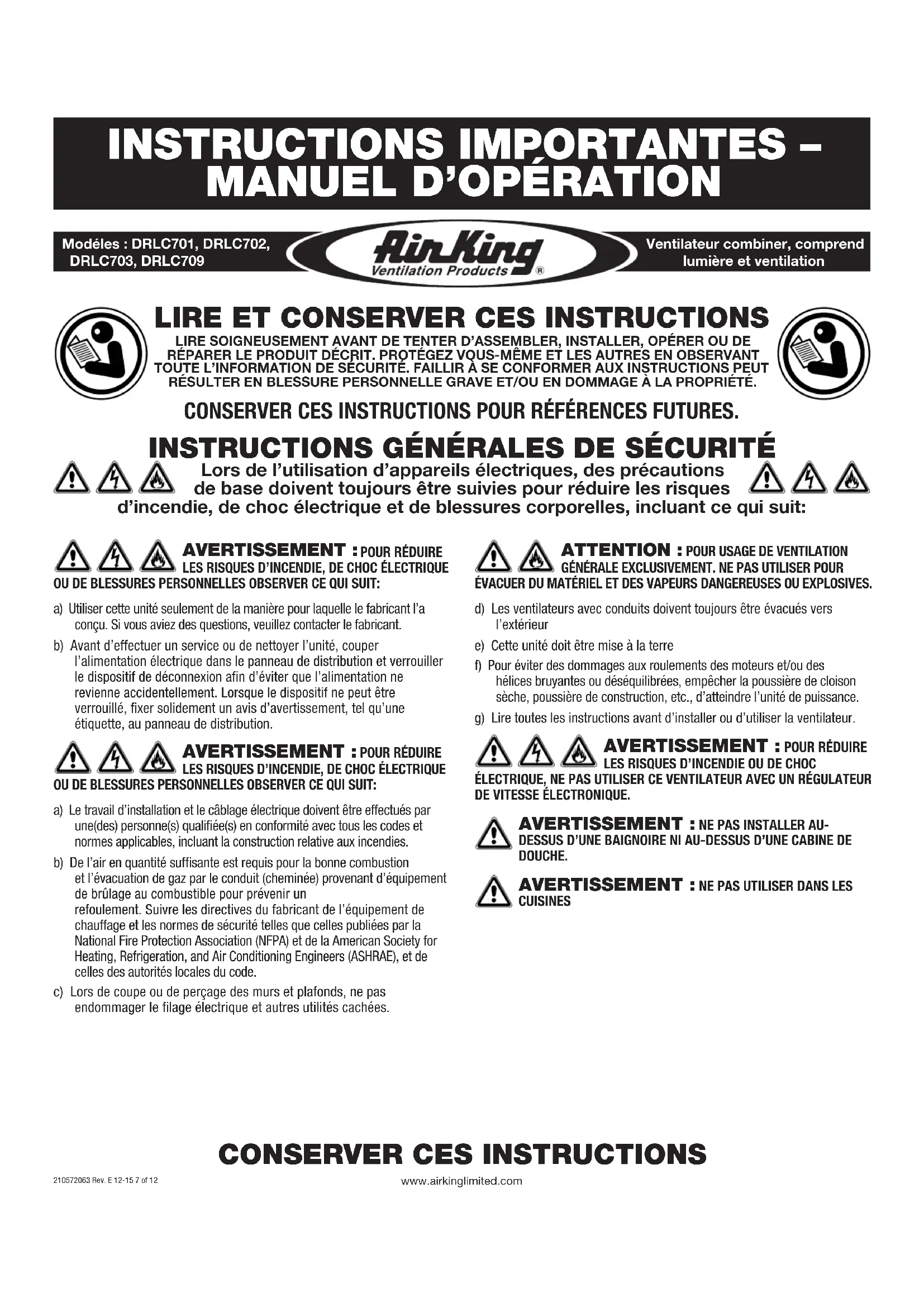 À UN PRODUIT CHIMIQUE [OU À DES PRODUITS CHIMIQUES] CONNU(S) PAR L’ÉTAT DE LA CALIFORNIE POUR CAUSER LA TOXICITÉ ENVERS LES FONCTIONS DE LA REPRODUCTION. Guide de dépannage Trouble Cause Possible Solution Suggérée 1. Le ventilateur ne fonctionne pas lorsque 1a. Un fusible peut être grillé ou un disjoncteur 1a. Remplacer le fusible ou réinitialiser le disjoncteur. l’interrupteur est à la position en marche. peut être décle.nché. 1b. La fiche de raccord du moteur n’est 1b. Couper l’alimentation à l’unité. Retirer la grille et brancher le moteur dans pas connectée. le réceptacle dans le cabinet. Remettre l’alimentation sur l’unité. 1c. Le câblage n’est pas raccordé correctement. 1c. Couper l’alimentation de l’unité. Vérifier que tous les fils sont raccordés. 1d. La moteur est terminee 1d. Remplacez la moteur 2. Le ventilateur fonctionne, mais l’air circule 2. Obstruction dans les conduits d’évacuation. 2. Vérifier pour toute obstruction dans les conduits. Les plus courantes sont plus lentement que la normale. des nids d’oiseau dans le chapeau de toit ou mural là où le ventilateur s’évacue vers l’extérieur. 3. Le ventilateur fonctionne de manière plus 3a. Le moteur est lâche. 3a. Couper l’alimentation à l’unité. Retirer la grille et vérifier que toutes les bruyante que la normale. vis sont complètement serrées. Remettre l’alimentation sur l’unité. 3b. L’hélice du ventilateur frotte contre le cabinet de l’unité. 3b. Appeler votre marchand pour un service. Figure 14 Barre Lentilles de Verre Trou Bouton GrilleGARANTIE LIMITÉE CE QUE COUVRE CETTE GARANTIE : Ce produit est garanti contre tout vice de fabrication ou de matière. COMBIEN DE TEMPS CETTE GARANTIE DURE : Cette garantie se rapporte seulement à l’acheteur original du produit et dure pendant une (1) année de la date de l’achat original ou jusqu’à ce que l’acheteur original du produit vend ou transfère le produit, celui qui se produit en premier. QUE FERA AIR KING : Au cours de la période de garantie, Air King, à son choix, réparera ou remplacera n’importe quelle partie ou pièces qui s’avèrent défectueuses ou remplacera le produit entier par le même modèle ou un modèle comparable. CE QUE CETTE GARANTIE NE COUVRE PAS : Cette garantie ne s’applique pas si le produit était endommagé ou arrête de fonctionner en raison d’un accident, d’une mauvaise manipulation ou opération, de dommages d’expédition, d’abus, de mauvaise utilisation, de réparation faite ou tentées non autorisées. Cette garantie ne couvre pas les coûts d’expédition pour le retour des produits à Air King pour la réparation ou le remplacement. Air King payera les frais d’expédition de retour de Air King après les réparations ou le remplacement de garantie. TOUTES LES GARANTIES, EXPRESSES OU TACITES (COMPRENANT, SANS LIMITATION, TOUTE GARANTIE TACITE DE VALEUR MARCHANDE), DURENT UN AN DE LA DATE DE L’ACHAT ORIGINAL OU JUSQU’À CE QUE L’ACHETEUR ORIGINAL DU PRODUIT VEND OU TRANSFÈRE LE PRODUIT, CELUI QUI SE PRODUIT EN PREMIER ET DANS AUCUN CAS AIR KING N’ASSUME AUCUNE RESPONSABILITÉ EXPRESSE OU TACITE POUR (I) DES DOMMAGES ACCIDENTELS OU INDIRECTS DE N’IMPORTE QUELLE CAUSE, OU (II) LE REPLACEMENT OU LA RÉPARATION DE TOUS FUSIBLES, DISJONCTEURS OU RÉCEPTACLES DE MAISON. MALGRÉ N’IMPORTE QUOI À L’EFFET CONTRAIRE, DANS AUCUN CAS LA RESPONSABILITÉ D’AIR KING, SOUS UNE GARANTIE EXPRESSE OU TACITE, NE DÉPASSERA LE PRIX D’ACHAT DU PRODUIT ET UNE TELLE RESPONSABILITÉ SE TERMINERA AVEC L’EXPIRATION DE LA PÉRIODE DE GARANTIE. Certains états et provinces ne permettent pas les limitations de la période de garantie, ou l’exclusion ou la restriction des dommages accidentels ou indirects, et, par conséquent, les présentes restrictions ne peuvent pas s’appliquer. La présente garantie vous donne des droits légaux spécifiques et peut-être certains autres droits qui peuvent varier selon la province. La preuve d’achat est exigée avant qu’une réclamation de garantie ne soit acceptée. SERVICE À LA CLIENTÈLE : Sans frais (800) 465-7300 Notre équipe de service à la clientèle est disponible pour vous aider avec des questions sur le produit, les adresses des centres de service, et les pièces de rechange. Vous pouvez la rejoindre, du lundi au vendredi, de 8h:00 à 16h:00 HNE. Veuillez avoir le numéro du modèle disponible, ainsi que le genre et le style (qui se trouvent sur l’étiquette à l’intérieur de votre produit). Veuillez ne pas renvoyer le produit à l’endroit de l’achat. www.airkinglimited.com IL SE PEUT QUE LES PIÈCES POUR LES PRODUITS DISCONTINUÉS, OBSOLÈTES ET AUTRES PRODUITS NE SOIENT PAS DISPONIBLES. POUR DES RAISONS DE SÛRETÉ, BEAUCOUP DE COMPOSANTS ÉLECTRONIQUES ET LA PLUPART DES COMPOSANTS DES CHAUFFAGES NE SONT PAS À LA DISPOSITION DES CONSOMMATEURS POUR L’INSTALLATION OU LE REMPLACEMENT. www.airkinglimited.com 210572063 Rev. E 12-15 11 of 12 Installateur: Date d’installation: Endroit de l’achat: Numéro de modèle:www.airkinglimited.com 210572063 Rev. E 12-15 12 of 12 # de pièce # Qte. Description de remplacement 1 4 Traverses de Montage 5S1299002 2 1 Assemblée de collier 5S1201110 3 1 Venturi 5S1201014 4 1 Couvre fil en col-de-cygne 5S1201004 5 1 Réceptacle 5S1999001 6 1 Connecteur 2P Polarisé 5S1201012