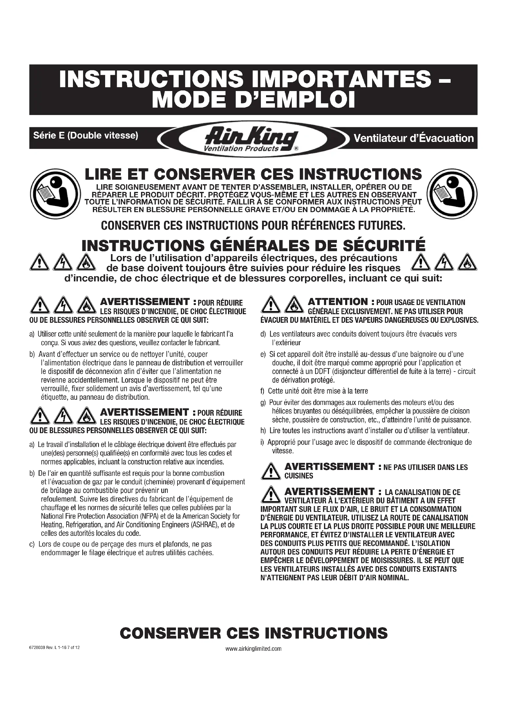 CE QUE CETTE GARANTIE NE COUVRE PAS: Cette garantie ne s'applique pas si le produit était endommagé ou arrêté de fonctionner en raison d'un accident, d'une mauvaise manipulation ou opération, de dommages d'expédition, d'abus, de mauvaise utilisation, de réparation faite ou tentées non autorisées. Cette garantie ne couvre pas les coûts d'expédition pour le retour des produits à Air King pour la réparation ou le remplacement. Air King payera les frais d'expédition de retour de Air King après les réparations ou le remplacement de garantie.