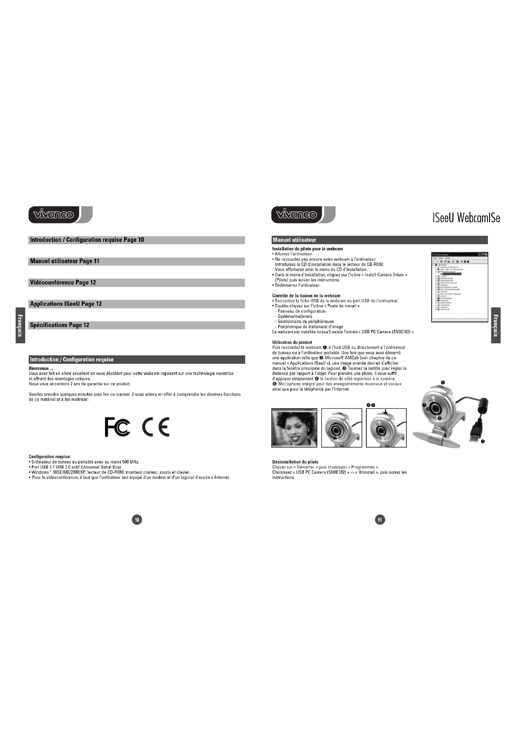 Français Français Introduction / Configuration requise Page 10 Manuel utilisateur Page 11 Vidéoconférence Page 12 Applications ISeeU Page 12 Spécifications Page 12 Introduction / Configuration requise Bienvenue ... Vous avez fait un choix excellent en vous décidant pour cette webcam reposant sur une technologie novatrice et offrant des avantages uniques. Nous vous accordons 2 ans de garantie sur ce produit. Veuillez prendre quelques minutes pour lire ce manuel. Il vous aidera en effet à comprendre les diverses fonctions de ce matériel et à les maîtriser. Configuration requise: