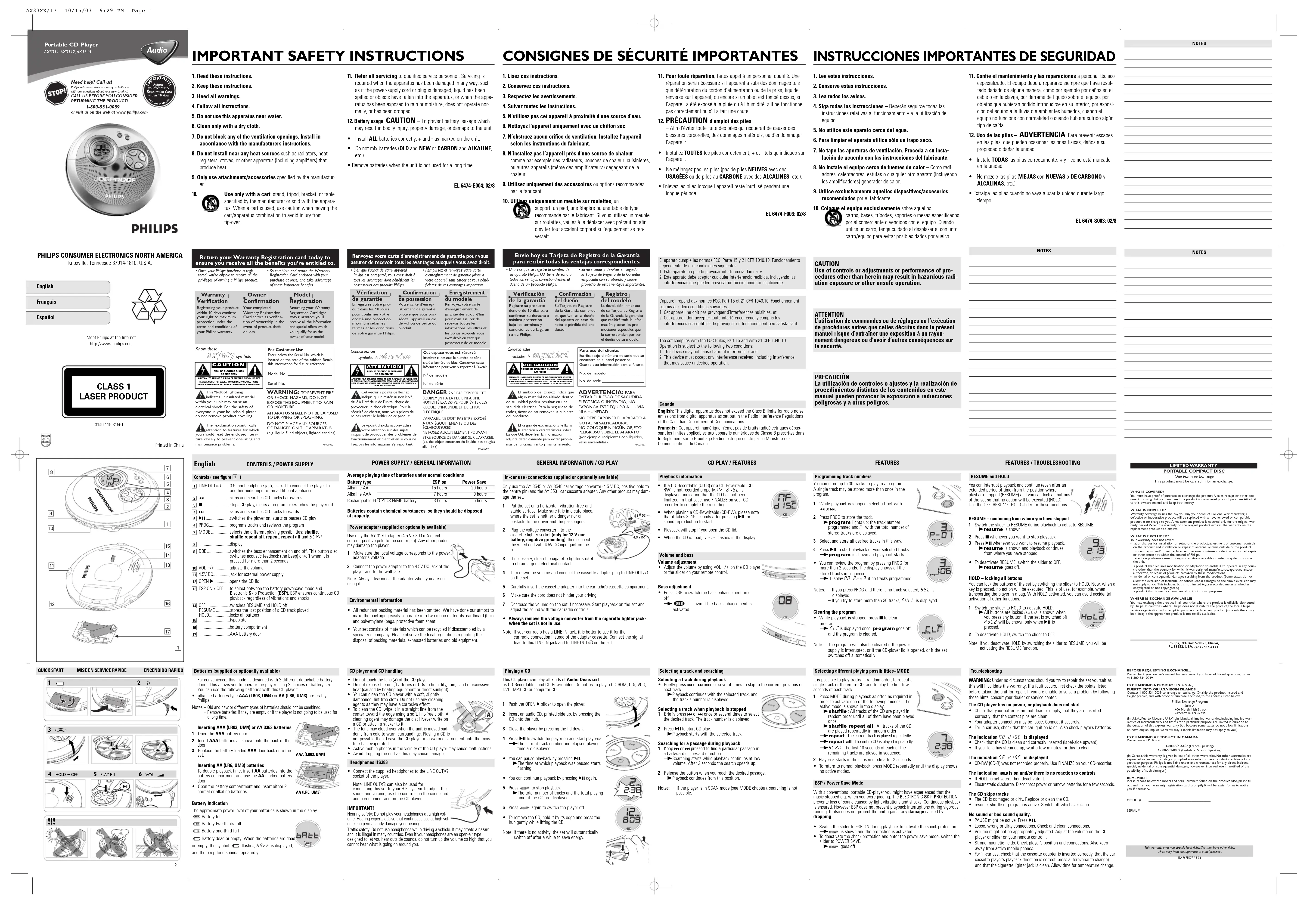 Échange gratuite pendant un anIl faut porter ce produit à un centre de service pour l’échanger.GARANTIE LIMITÉEQUI EST COUVERT ?Il faudra présenter une preuve d’achat pour pouvoir bénéficier des services de lagarantie. Le reçu, la facture ou un autre document portant la date d’achat qui prouve quevous avez bien acheté le produit est considéré comme preuve d’achat. L’attacher à cemanuel d’emploi et les garder tous les deux à portée de main.QU’EST-CE QUI EST COUVERT ?La couverture de la garantie entre en vigueur le jour où vous achetez le produit. Pendantun an à compter de cette date, tout produit défectueux ou qui ne fonctionne pas seraremplacé par un produit neuf, renouvelé ou un produit comparable sans frais aucun auconsommateur. Un produit de remplacement n’est couvert que pendant la période non-écoulée de garantie d’origine. Lorsque la garantie du produit d’origine vient à terme, lagarantie du produit de remplacement est terminée aussi.QU’EST-CE QUI EST EXCLU DE LA GARANTIE ?La garantie ne couvre pas :• les frais de main d’œuvre pour installer ou préparer, pour régler les commandes etpour installer ou réparer les systèmes d’antenne à l’extérieur du produit.• la réparation du produit et/ou d’une pièce pour cause du mauvais emploi, d’accident,de réparations non-agréées ou d’une autre raison qui ne peut pas être contrôlée parPhilips.• des problèmes de réception dûs à des conditions de signal, au câble ou aux systèmesd’antenne à l’extérieur de l’unité.• un produit qui nécessite des modifications ou adaptations pour lui permettre de fonc-tionner dans un pays autre que le pays pour lequel il a été conçu, fabriqué, agréé et/ouautorisé, ou la réparation des produits endommagés par de telles modifications.• des dommages indirects ou conséquents qui résultent du produit. (Certains états ouprovinces ne permettent pas l’exclusion de dommages indirects ou conséquents. Il estdonc possible que l’exclusion ci-dessus ne s’applique pas au cas présent. Cela com-prend, mais de façon non-limitative, des enregistrements, qu’ils soient protégés ou nonpar les lois sur les droits d’auteur). un produit utilisé pour des raisons commerciales ou institutionnelles.OÙ L’ÉCHANGE EST-ELLE PROPOSÉE ?Le produit pourra s’échanger dans tous les pays où le produit est distribué officiellementpar Philips. Dans des pays où Philips ne distribue pas le produit, l’organisme local de servicePhilips tentera de fournir un produit de remplacement (mais il pourra y avoir des retards sile bon produit n’est pas facilement disponible).Philips, P.O. Box 520890, Miami,FL 33152, É.-U.,(402) 536-4171 TOCADISCOS DE CD PORTATILCambio gratis por un añoSe necesita presentarse en persona con este producto para cambiarlo.GARANTIA LIMITADA¿QUIEN TIENE PROTECCION? Usted debe tener su comprobante de venta para cambiar el producto. Una nota de ventau otro documento mostrando que usted compró el producto se considera un compro-bante de venta.Adjúntelo a este manual de instrucciones y reténgalo a la mano.¿QUE CUBRE?La protección bajo la garantía comienza el mismo día en que usted compra el producto.Durante un año a partir de esta fecha, se reemplazará un producto inoperante o defectuosocon otro nuevo, renovado o comparable sin cargo alguno. Un producto de reemplazo tienecobertura sólo durante el período de la garantía original. Una vez que venza la garantía origi-nal del producto, también habrá vencido la garantía del producto de reemplazo.¿QUE EXCLUYE LA GARANTIA?Su garantía no cubre:• cobros por mano de obra durante la instalación o montaje del producto, ajuste de loscontroles del cliente o de preferencia e instalación o reparación de los sistemas conantena fuera de la unidad.