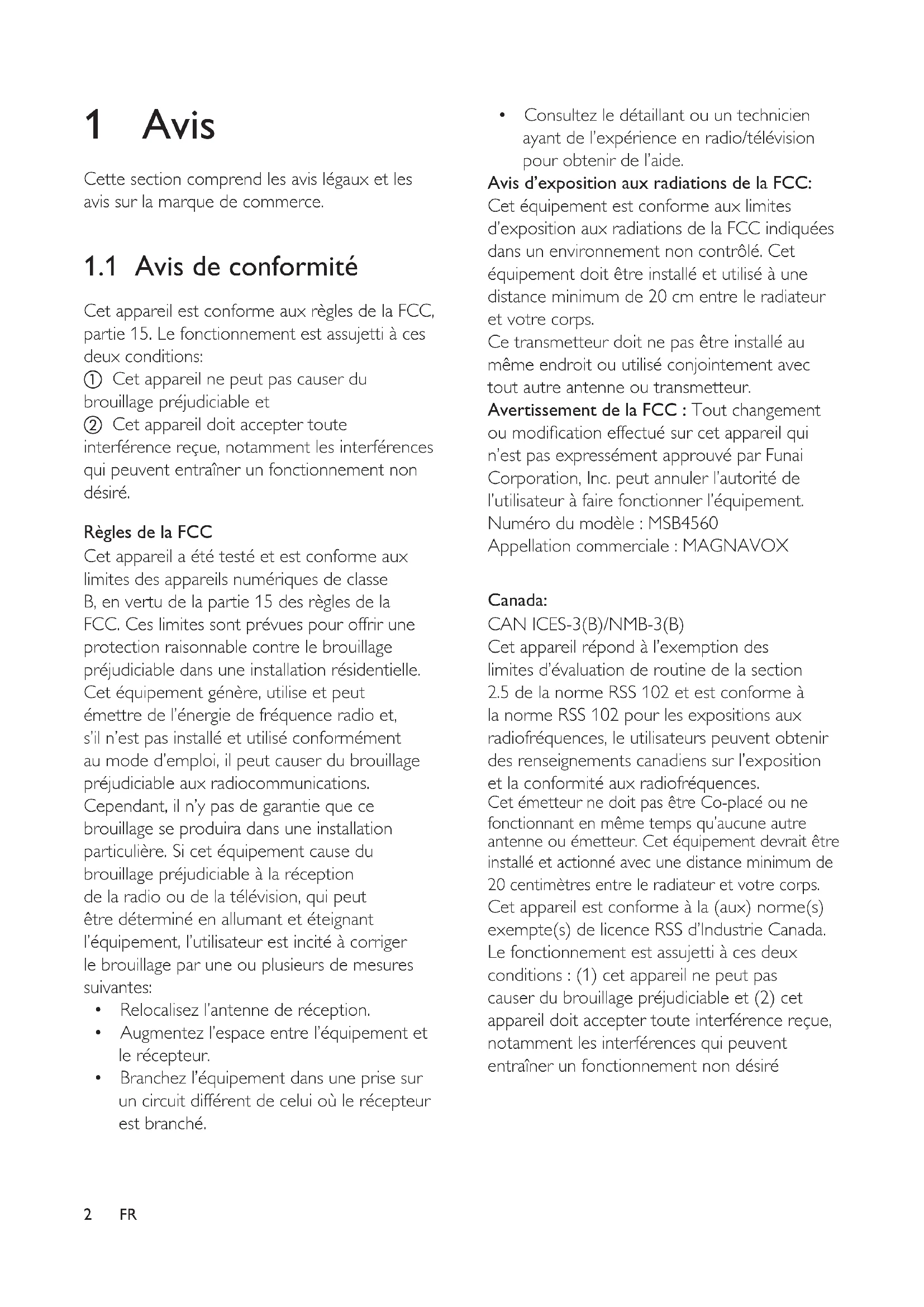 - Consultez le détaillant ou un technicien ayant de l’expérience en radio/télévision pour obtenir de l’aide. Avis d’exposition aux radiations de la FCC: Cet équipement est conforme aux limites d’exposition aux radiations de la FCC indiquées dans un environnement non contrôlé. Cet équipement doit être installé et utilisé à une distance minimum de 20 cm entre le radiateur et votre corps. Ce transmetteur doit ne pas être installé au même endroit ou utilisé conjointement avec tout autre antenne ou transmetteur. Avertissement de la FCC : Tout changement ou modication effectué sur cet appareil qui n’est pas expressément approuvé par Funai Corporation, Inc. peut annuler l’autorité de l’utilisateur à faire fonctionner l’équipement. Numéro du modèle : MSB4560 Appellation commerciale : MAGNAVOX Canada: CAN ICES-3(B)/NMB-3(B) Cet appareil répond à l’exemption des limites d’évaluation de routine de la section
