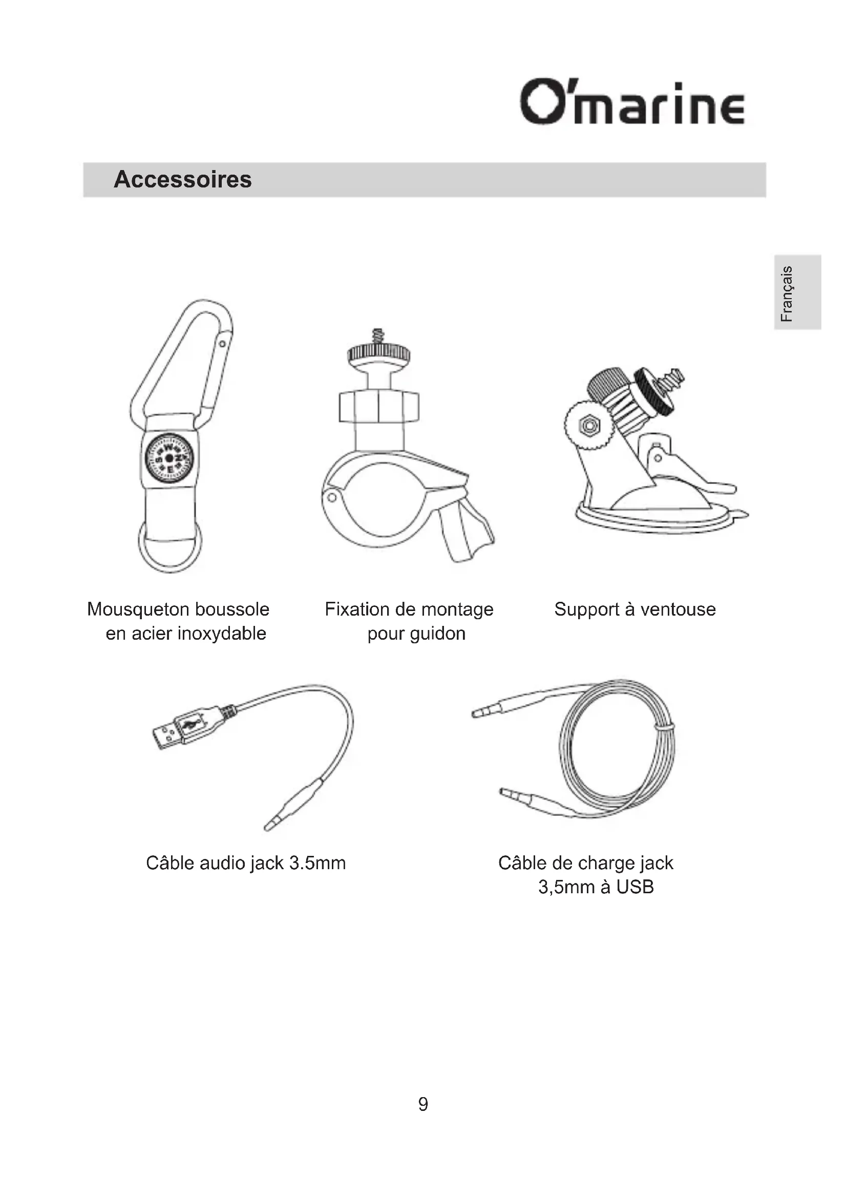Portée 30m (dépend de facteurs environnementaux) Specications *Fonction de la boussole pour la référence seulement *La garantie ne couvre pas les accessoires13 Accessori Moschettone in acciaio inox con bussola Cavo di ricarica 3.5mm a USB Supporto per Manubrio Supporto con Ventosa Cavo audio da 3.5mm Italiano14