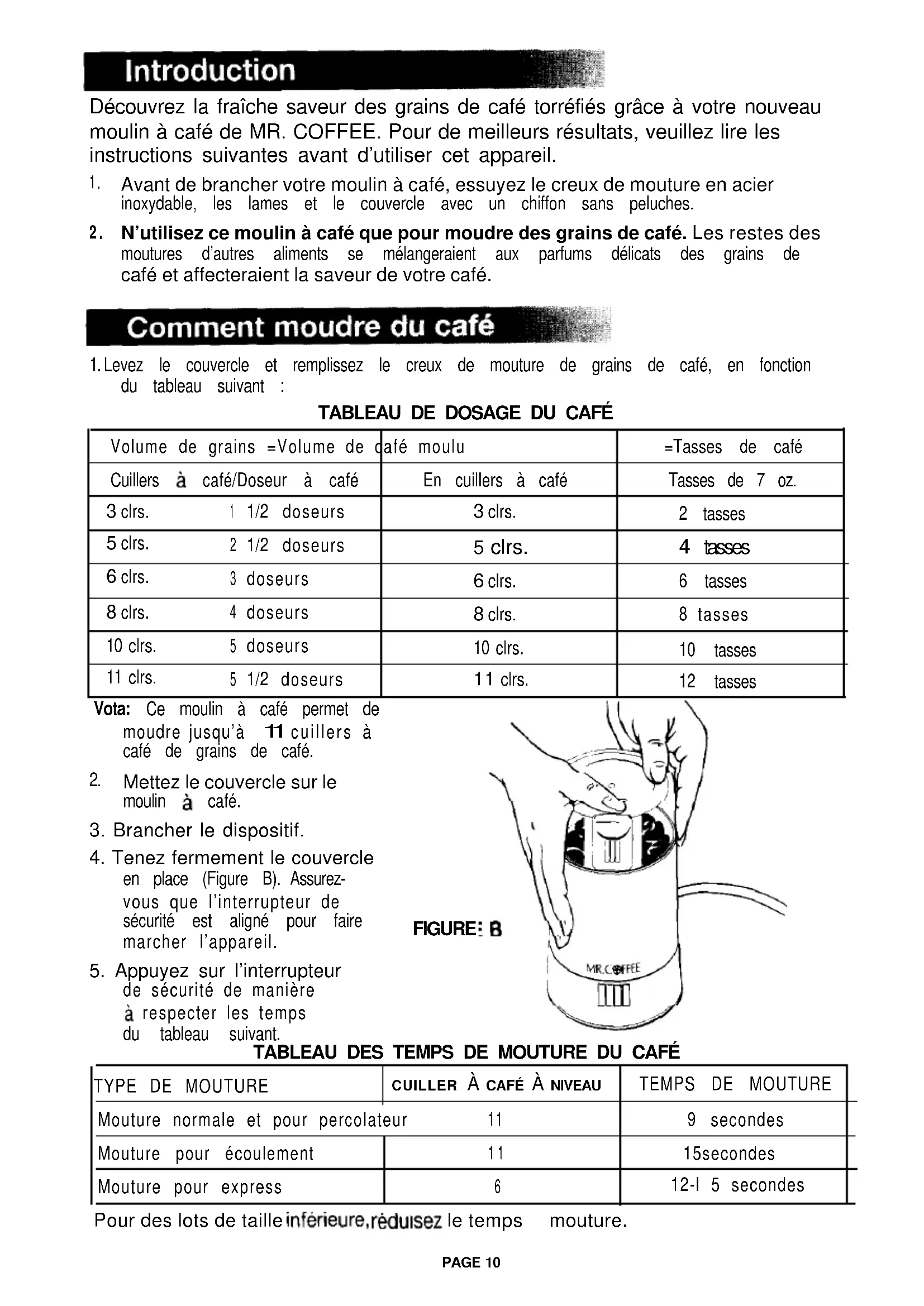 Lame Câble PAGE 9Découvrez la fraîche saveur des grains de café torréfiés grâce à votre nouveau moulin à café de MR. COFFEE. Pour de meilleurs résultats, veuillez lire les instructions suivantes avant d’utiliser cet appareil.