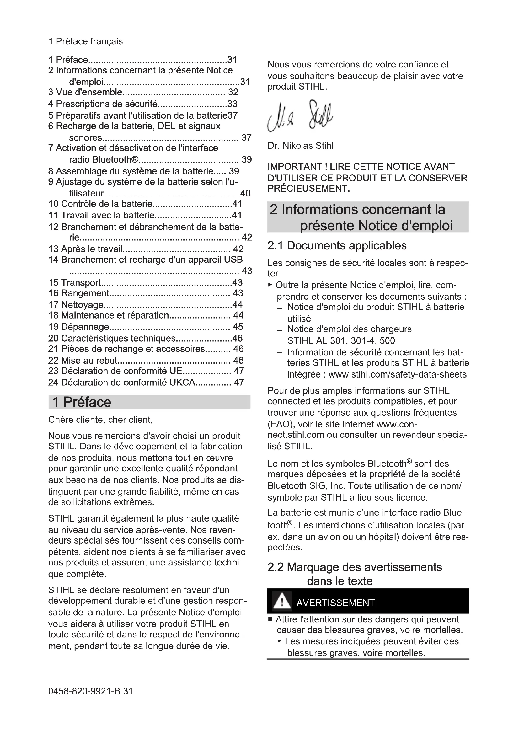 - 24 Déclaration de conformité UKCA 1 Préface Chère cliente, cher client, Nous vous remercions d'avoir choisi un produit STIHL. Dans le développement et la fabrication de nos produits, nous mettons tout en œuvre pour garantir une excellente qualité répondant aux besoins de nos clients. Nos produits se dis‐ tinguent par une grande fiabilité, même en cas de sollicitations extrêmes. STIHL garantit également la plus haute qualité au niveau du service après-vente. Nos reven‐ deurs spécialisés fournissent des conseils com‐ pétents, aident nos clients à se familiariser avec nos produits et assurent une assistance techni‐ que complète. STIHL se déclare résolument en faveur d'un développement durable et d'une gestion respon‐ sable de la nature. La présente Notice d'emploi vous aidera à utiliser votre produit STIHL en toute sécurité et dans le respect de l'environne‐ ment, pendant toute sa longue durée de vie. Nous vous remercions de votre confiance et vous souhaitons beaucoup de plaisir avec votre produit STIHL. Dr. Nikolas Stihl p. 47