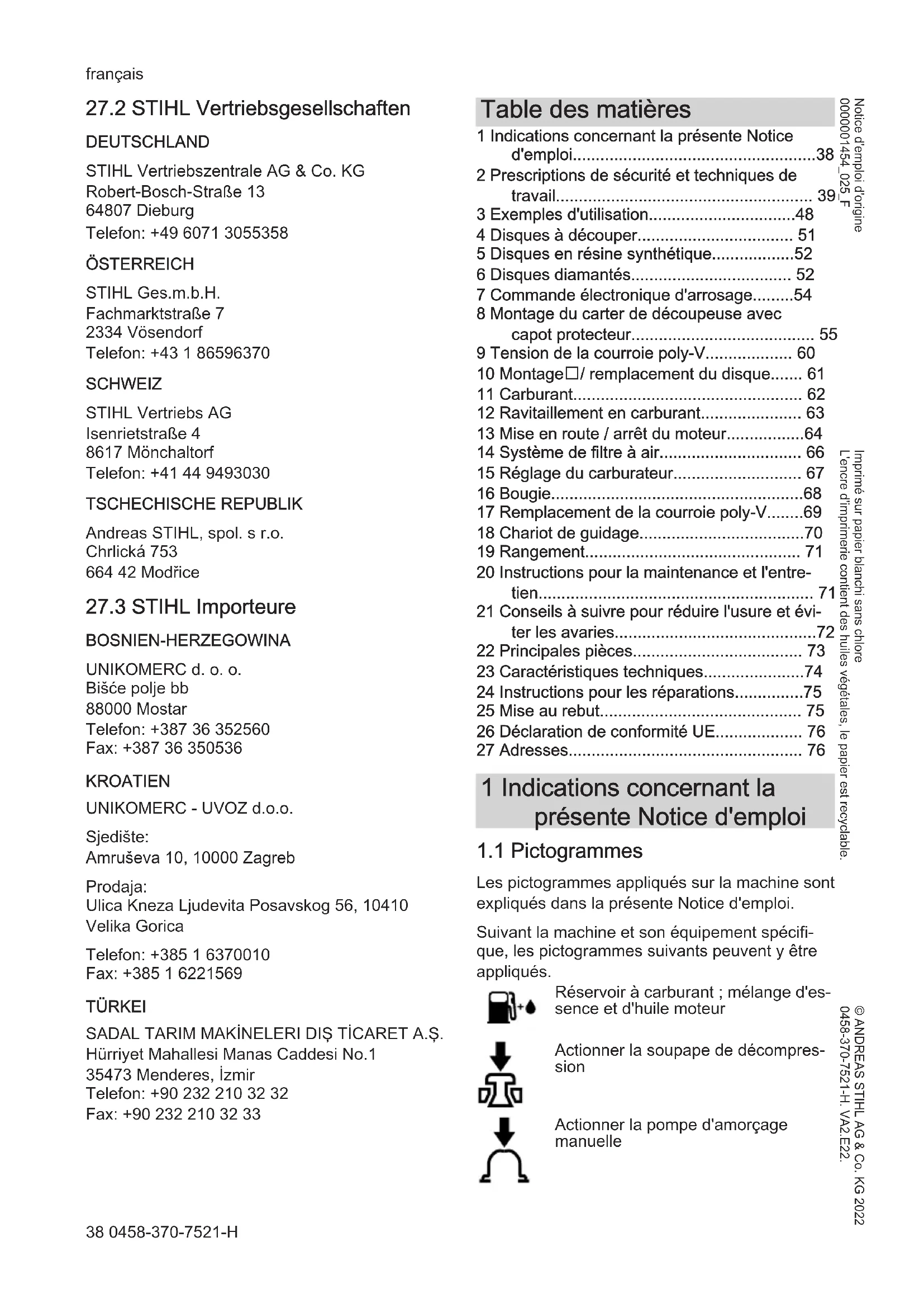 Les pictogrammes appliqués sur la machine sont expliqués dans la présente Notice d'emploi. Suivant la machine et son équipement spécifi‐ que, les pictogrammes suivants peuvent y être appliqués. Réservoir à carburant ; mélange d'es‐ sence et d'huile moteur Actionner la soupape de décompres‐ sion Actionner la pompe d'amorçage manuelle français 38 0458-370-7521-H © ANDREAS STIHL AG & Co. KG 2022 0458-370-7521-H. VA2.E22. Imprimé sur papier blanchi sans chlore L'encre d'imprimerie contient des huiles végétales, le papier est recyclable. Notice d'emploi d'origine 0000001454_025_FPrise d'eau, robinet d'arrêt Écrou de tension de courroie Tirer la poignée de lancement
