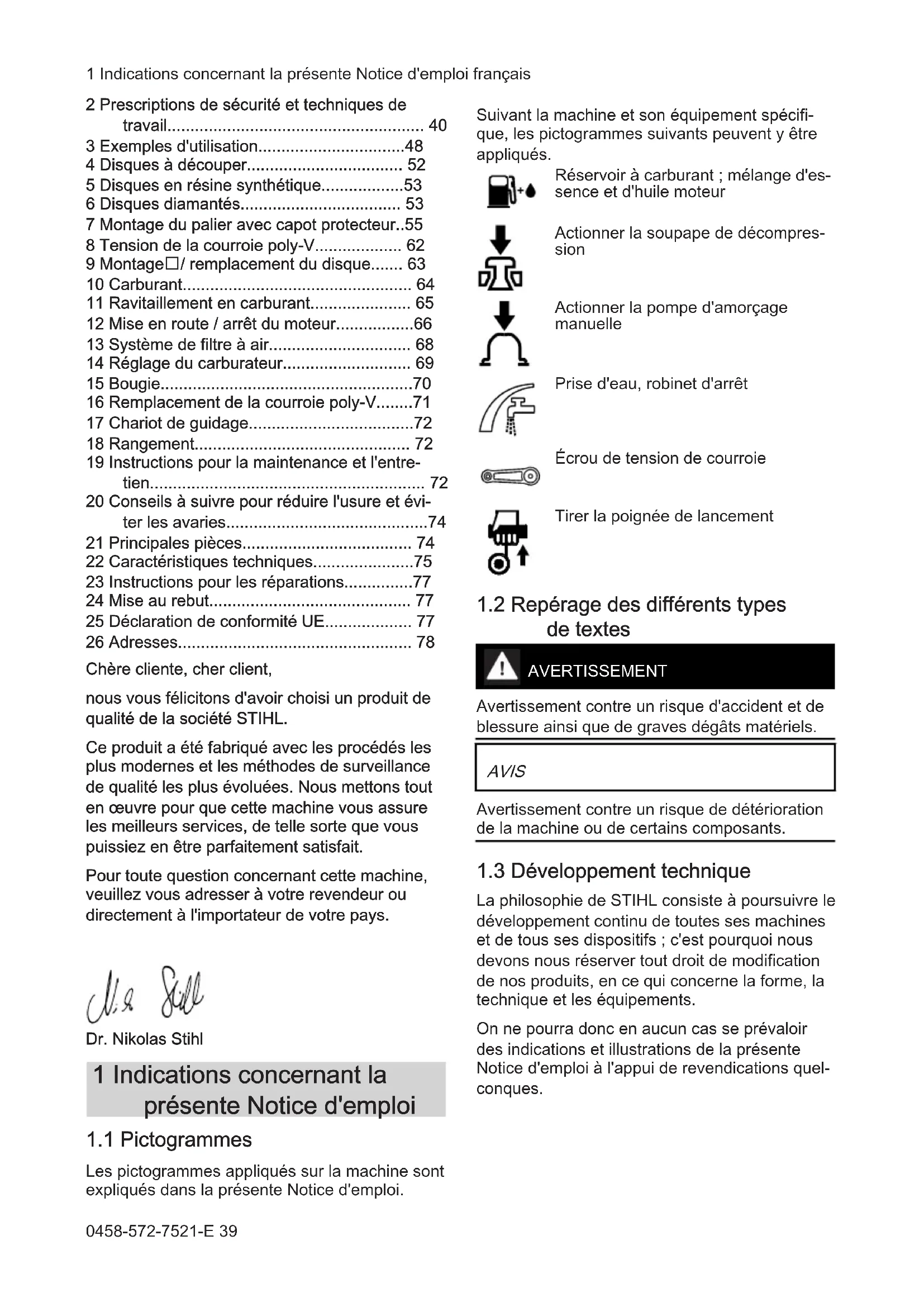 - 26 Adresses Chère cliente, cher client, nous vous félicitons d'avoir choisi un produit de qualité de la société STIHL. Ce produit a été fabriqué avec les procédés les plus modernes et les méthodes de surveillance de qualité les plus évoluées. Nous mettons tout en œuvre pour que cette machine vous assure les meilleurs services, de telle sorte que vous puissiez en être parfaitement satisfait. Pour toute question concernant cette machine, veuillez vous adresser à votre revendeur ou directement à l'importateur de votre pays. Dr. Nikolas Stihl 1 Indications concernant la présente Notice d'emploi p. 78