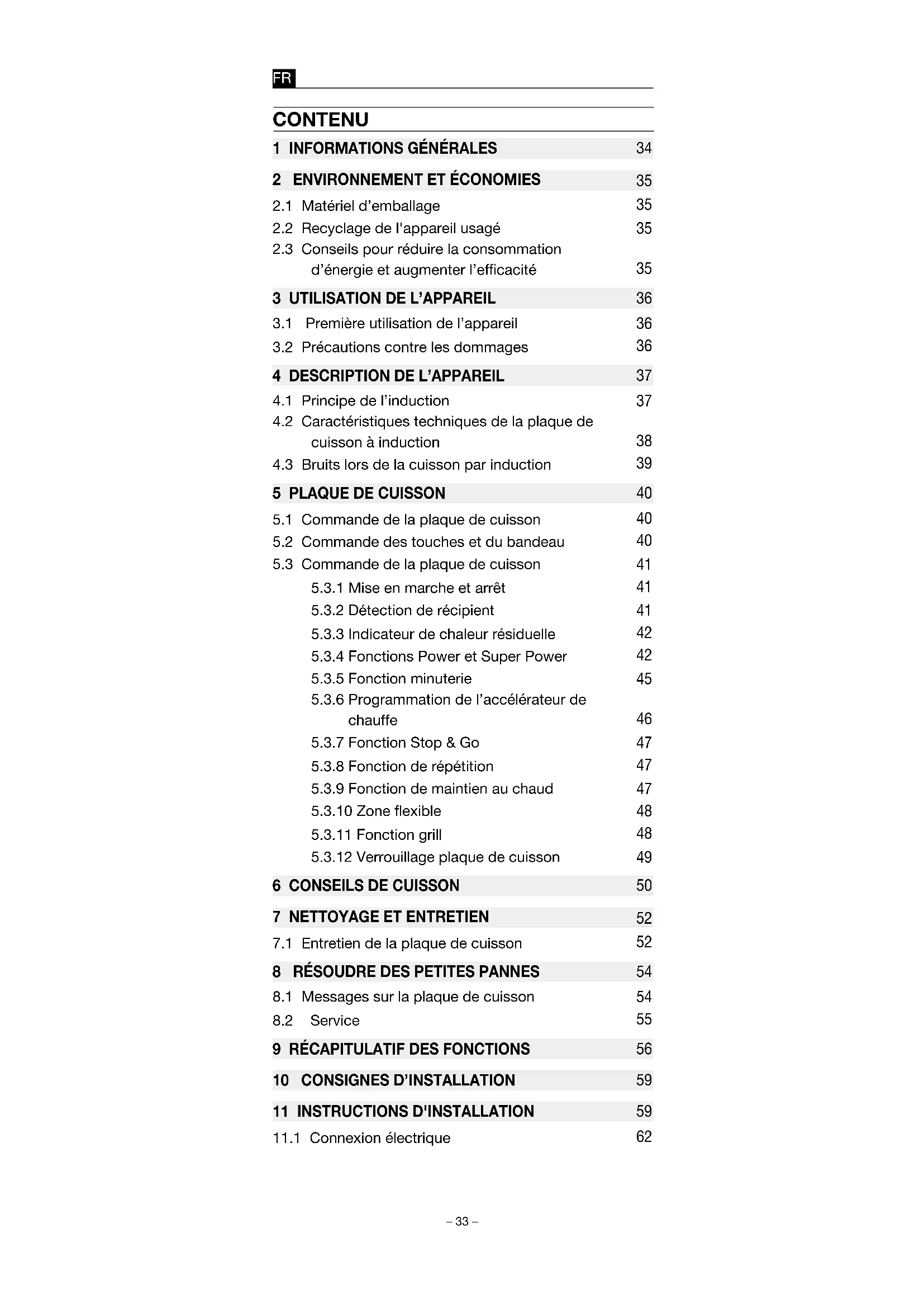 Lors de l’utilisation d’une plaque de cuisson à induction, les récipients de cuisson peuvent émettre toutes sortes de bruits. Ces bruits sont variables selon le matériau et le mode de fabrication du fond du récipient. Ronflement Ceci se produit lorsque vous utilisez un niveau de puissance élevé. Le ronflement est causé par la quantité d’énergie transmise de la plaque de cuisson à l’ustensile de cuisson. Le bruit s’arrête ou diminue lorsque vous réglez la plaque de cuisson à un niveau moins élevé. Crépitement Ce bruit est créé lorsque l’ustensile de cuisson est constitué de plusieurs couches de matériau. Le bruit est causé par les vibrations dans les surfaces de contact des diérentes couches de matériau. Siement Ce type de bruit apparaît généralement lors de l’em- ploi d’ustensiles de cuisson composés de diérentes couches de matériaux ou lorsque deux plaques de cuisson voisines sont utilisées simultanément au niveau maximum. Le bruit de siement s’arrête ou diminue lorsque vous réglez la plaque de cuisson à un niveau moins élevé. Clics À bas niveau de puissance, les commutations élec- troniques peuvent s’accompagner de bruits de clics. Bourdonnement Le ventilateur peut générer un bruit de bourdonnement. Ce ventilateur sert à refroidir l’appareil électronique lors d’un usage intensif de la plaque de cuisson. Le ventilateur peut continuer de fonctionner même après l’arrêt de la plaque de cuisson lorsque la température est encore trop élevée.– 40 –