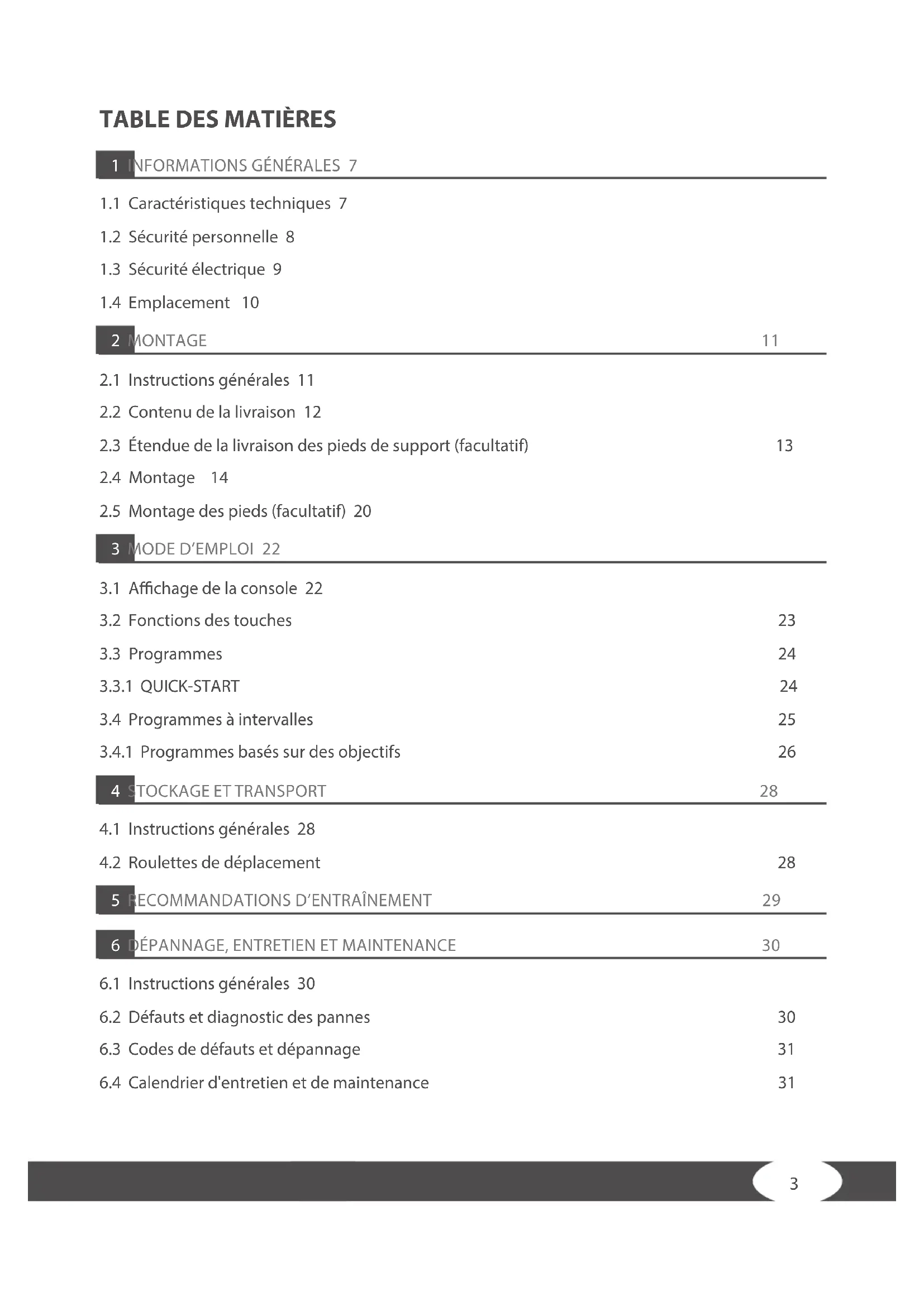 1 INFORMATIONS GÉNÉRALES 71.1 Caractéristiques techniques 71.2 Sécurité personnelle 81.3 Sécurité électrique 91.4 Emplacement 102 MONTAGE 112.1 Instructions générales 112.2 Contenu de la livraison 122.3 Étendue de la livraison des pieds de support (facultatif) 132.4 Montage 142.5 Montage des pieds (facultatif) 203 MODE D’EMPLOI 223.1 Achage de la console 223.2 Fonctions des touches 233.3 Programmes 243.3.1 QUICK-START 243.4 Programmes à intervalles 253.4.1 Programmes basés sur des objectifs 264 STOCKAGE ET TRANSPORT 284.1 Instructions générales 284.2 Roulettes de déplacement 285 RECOMMANDATIONS D’ENTRAÎNEMENT 296 DÉPANNAGE, ENTRETIEN ET MAINTENANCE 306.1 Instructions générales 306.2 Défauts et diagnostic des pannes 306.3 Codes de défauts et dépannage 316.4 Calendrier d'entretien et de maintenance 31SCANDIC X