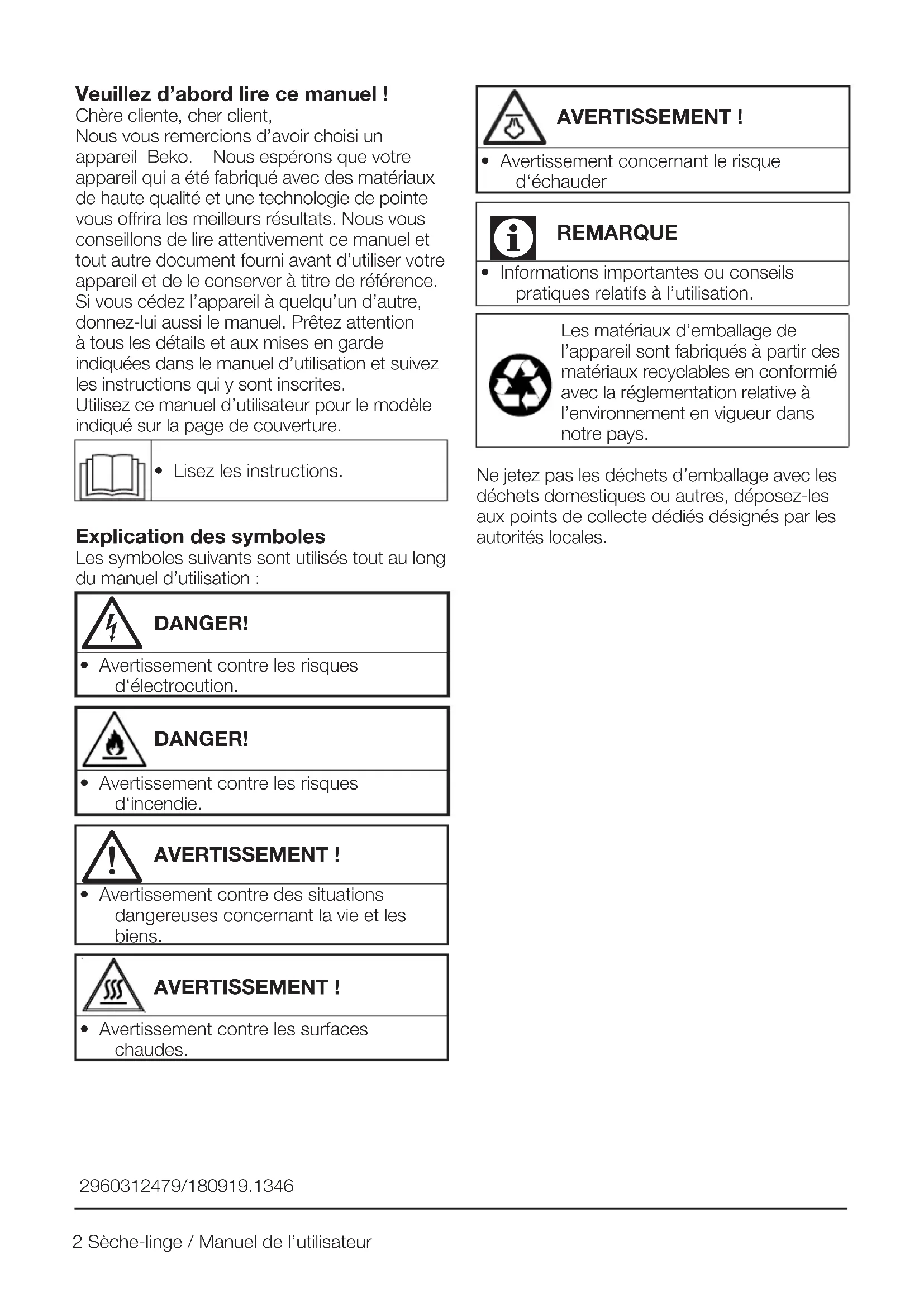 - Informations importantes ou conseils pratiques relatifs à l’utilisation. Les matériaux d’emballage de l’appareil sont fabriqués à partir des matériaux recyclables en conformié avec la réglementation relative à l’environnement en vigueur dans notre pays. Ne jetez pas les déchets d’emballage avec les déchets domestiques ou autres, déposez-les aux points de collecte dédiés désignés par les autorités locales. 2960312479/180919.13463 Sèche-linge / Manuel de l’utilisateur 1 Consignes importantes en matière de sécurité et à surligner