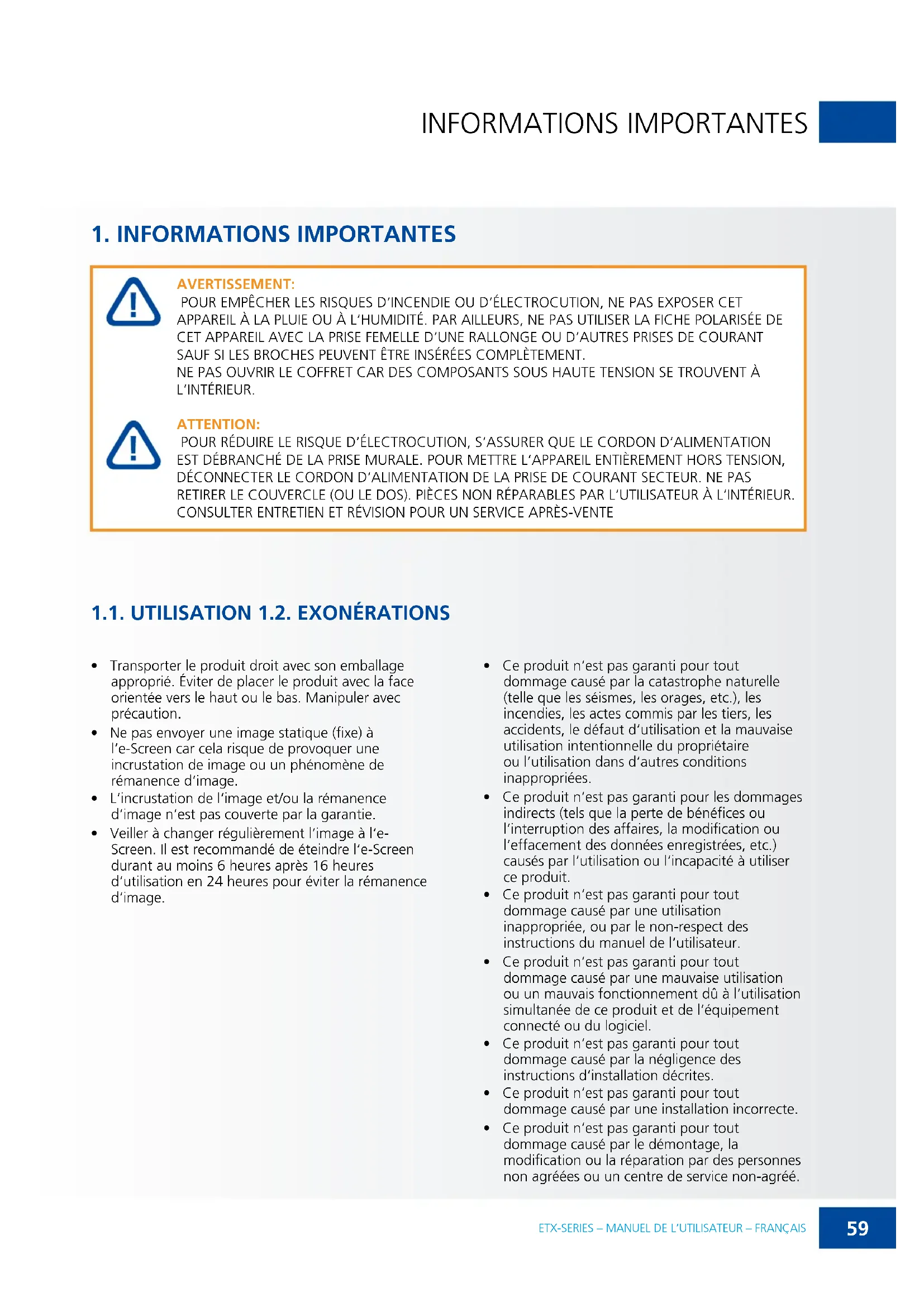 - Ce produit n‘est pas garanti pour tout dommage causé par le démontage, la modification ou la réparation par des personnes non agréées ou un centre de service non-agréé.60 ETX-SERIES – MANUEL DE L‘UTILISATEUR – FRANÇAIS