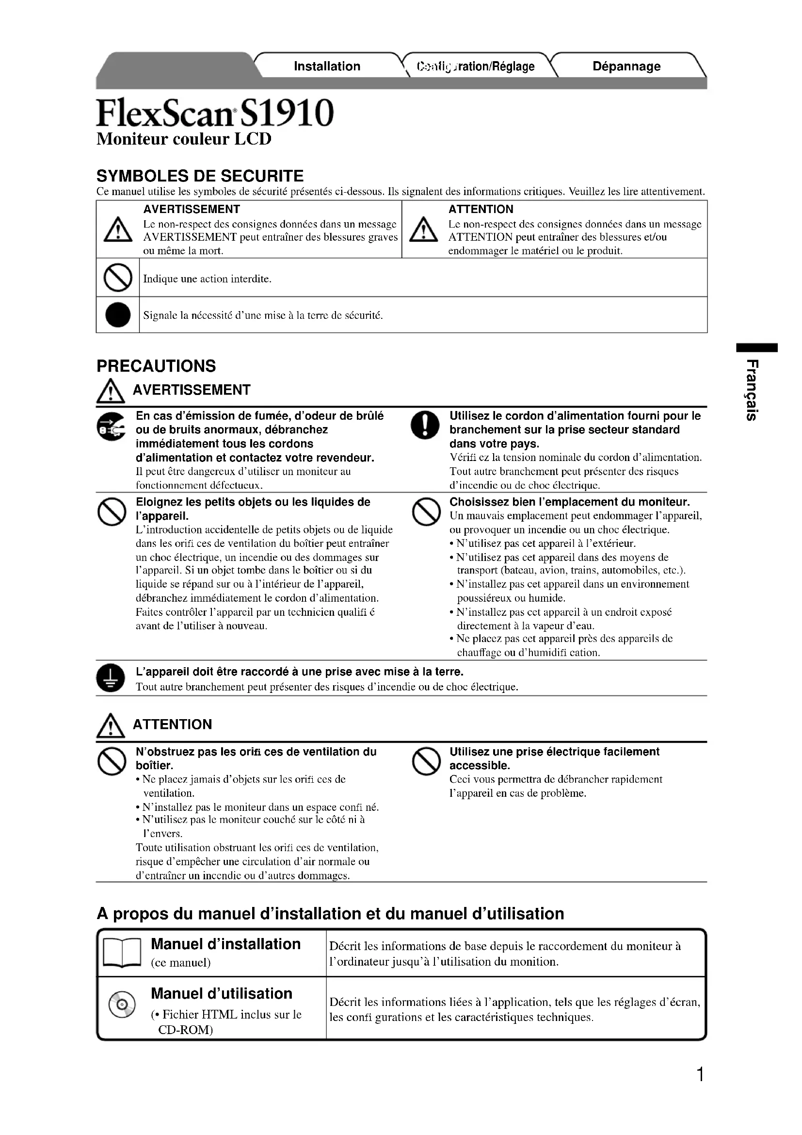 Ce manuel utilise les symboles de sécurité présentés ci-dessous. Ils signalent des informations critiques. Veuillez les lire attentivement. AVERTISSEMENTLe non-respect des consignes données dans un message AVERTISSEMENT peut entraîner des blessures graves ou même la mort.ATTENTIONLe non-respect des consignes données dans un message ATTENTION peut entraîner des blessures et/ou endommager le matériel ou le produit.Indique une action interdite.Signale la nécessité d’une mise à la terre de sécurité. PRECAUTIONS AVERTISSEMENT En cas d’émission de fumée, d’odeur de brûlé ou de bruits anormaux, débranchez immédiatement tous les cordons d’alimentation et contactez votre revendeur.Il peut être dangereux d’utiliser un moniteur au fonctionnement défectueux.Utilisez le cordon d’alimentation fourni pour le branchement sur la prise secteur standard dans votre pays.Vérifi ez la tension nominale du cordon d’alimentation. Tout autre branchement peut présenter des risques d’incendie ou de choc électrique.Eloignez les petits objets ou les liquides de l’appareil.L’introduction accidentelle de petits objets ou de liquide dans les orifi ces de ventilation du boîtier peut entraîner un choc électrique, un incendie ou des dommages sur l’appareil. Si un objet tombe dans le boîtier ou si du liquide se répand sur ou à l’intérieur de l’appareil, débranchez immédiatement le cordon d’alimentation. Faites contrôler l’appareil par un technicien qualifi é avant de l’utiliser à nouveau.Choisissez bien l’emplacement du moniteur.Un mauvais emplacement peut endommager l’appareil, ou provoquer un incendie ou un choc électrique.• N’utilisez pas cet appareil à l’extérieur.• N’utilisez pas cet appareil dans des moyens de transport (bateau, avion, trains, automobiles, etc.).• N’installez pas cet appareil dans un environnement poussiéreux ou humide.• N’installez pas cet appareil à un endroit exposé directement à la vapeur d’eau.• Ne placez pas cet appareil près des appareils de chauffage ou d’humidifi cation.L’appareil doit être raccordé à une prise avec mise à la terre.Tout autre branchement peut présenter des risques d’incendie ou de choc électrique. ATTENTION N’obstruez pas les orifi ces de ventilation du boîtier.• Ne placez jamais d’objets sur les orifi ces de ventilation.• N’installez pas le moniteur dans un espace confi né.• N’utilisez pas le moniteur couché sur le côté ni à l’envers.Toute utilisation obstruant les orifi ces de ventilation, risque d’empêcher une circulation d’air normale ou d’entraîner un incendie ou d’autres dommages.Utilisez une prise électrique facilement accessible.Ceci vous permettra de débrancher rapidement l’appareil en cas de problème. Moniteur couleur LCD DépannageConfiguration/RéglageInstallationAvant utilisation A propos du manuel d’installation et du manuel d’utilisation Manuel d’installation (ce manuel)Décrit les informations de base depuis le raccordement du moniteur à l’ordinateur jusqu’à l’utilisation du monition. Manuel d’utilisation (• Fichier HTML inclus sur le CD-ROM)Décrit les informations liées à l’application, tels que les réglages d’écran, les confi gurations et les caractéristiques techniques.2 Français Dépannage Configuration/Réglage InstallationAvant utilisation Contenu de l’emballage Vérifi ez que tous les éléments indiqués ci-dessous sont inclus dans le carton d’emballage. Contactez votre revendeur si l’un des éléments est manquant ou abîmé.REMARQUE• Veuillez conserver le carton et les matériaux d’emballage pour les réutiliser lors d’un transport ultérieur du moniteur.□ Moniteur□ Cordon d’alimentation□ Câble de signal numérique (FD-C39) □ Câble de signal analogique (MD-C87)□ Câble USB EIZO (MD-C93)□ EIZO LCD Utility Disk (CD-ROM) • Manuel d’utilisation□ Manuel d’installation (ce manuel)□ Garantie limitée □ Vis de fi xation : M4 × 12 (mm) × 4 pièces Commandes et fonctions 1 Touche de sélection du signal d’entrée Commute les signaux d’entrée de l’affi chage lors du raccordement de deux ordinateurs au moniteur.2 Touche de changement de mode La touche vous permet de commuter le mode d’affi chage. 3 Touche de réglage automatique Permet de régler automatiquement l’écran (entrée analogique uniquement). 4 Touche de validation Affi che le menu de réglage, et permet de sélectionner une option dans l’écran de menu et d’enregistrer les valeurs défi nies.5 Touches de commande (Gauche, Bas, Haut, Droite)• Touche / / / : affi che l’écran de réglage de la luminosité (page 5).• Permet de sélectionner une option de réglage ou d’augmenter et/ou de diminuer les valeurs défi nies pour des réglages avancés à l’aide du menu de réglage (page 5).6 Touche d’alimentation Permet de mettre sous/hors tension.7 Voyant d’alimentation Indique l’état de fonctionnement du moniteur.Bleu : en fonctionnement Jaune clignotant(2 fois) mode d’économie d’énergie (connexion numérique uniquement) Jaune : économie d’énergie Eteint : hors tension 8 Fente pour le verrouillage de sécuritéCompatible avec le système de sécurité MicroSaver de Kensington. 9 Pied (démontable) Le pied permet de régler la hauteur et l’angle de l’écran du moniteur. 10 Connecteurs de signal d’entrée Gauche : connecteur DVI-D (SIGNAL 1) /Droite : connecteur D-sub mini à 15 broches (SIGNAL 2) 11 Port USB Permet de brancher le câble USB pour utiliser le logiciel ScreenManager Pro for LCD (pour Windows).Consultez le manuel d’utilisation sur le CD-ROM pour savoir comment utiliser ce logiciel.12 Enveloppe de câbles Maintient en place les câbles du moniteur.* ScreenManager