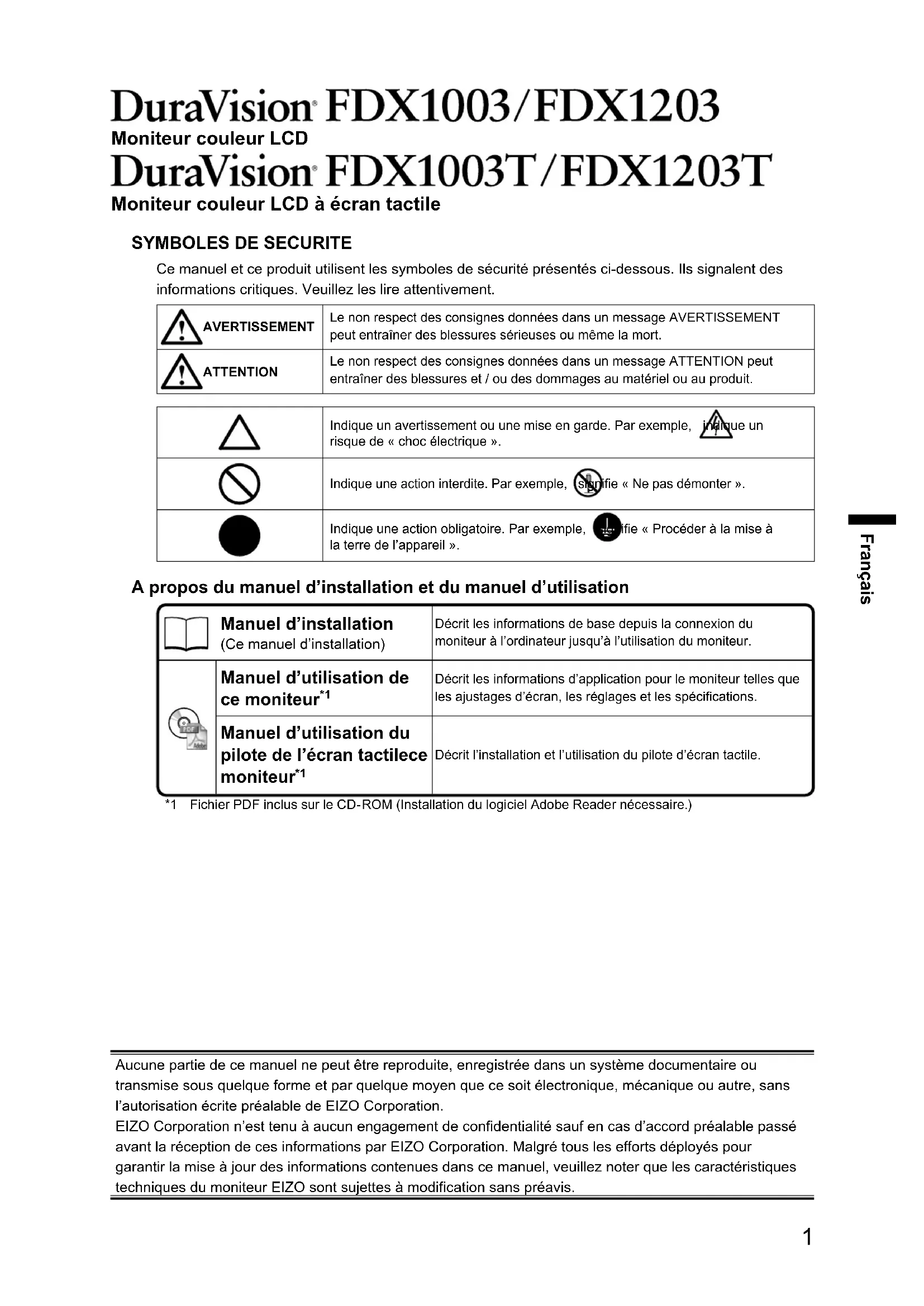 Décrit l’installation et l’utilisation du pilote d’écran tactile. *1 Fichier PDF inclus sur le CD-ROM (Installation du logiciel Adobe Reader nécessaire.) Aucune partie de ce manuel ne peut être reproduite, enregistrée dans un système documentaire ou transmise sous quelque forme et par quelque moyen que ce soit électronique, mécanique ou autre, sans l’autorisation écrite préalable de EIZO Corporation. EIZO Corporation n’est tenu à aucun engagement de condentialité sauf en cas d’accord préalable passé avant la réception de ces informations par EIZO Corporation. Malgré tous les eorts déployés pour garantir la mise à jour des informations contenues dans ce manuel, veuillez noter que les caractéristiques techniques du moniteur EIZO sont sujettes à modication sans préavis.2 PRECAUTIONS IMPORTANT
